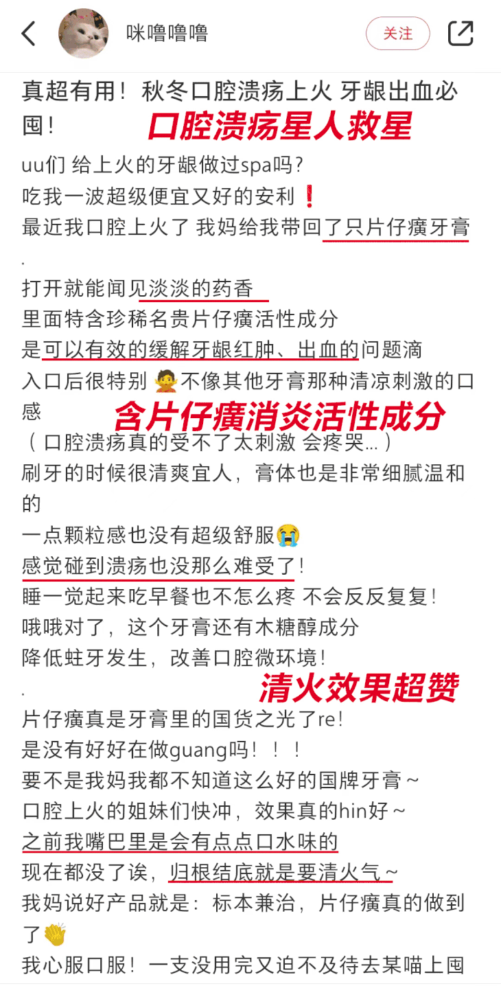 现代人,熬夜加班压力大,饮食丰富! 难免会出现口燥、异味、出血、肿胀、溃疡等口腔问题⭕ 而这些问题归根结底是由于口腔上火❗ 咻!片仔癀牙口清牙膏来啦,口腔清火神器! 能够有效缓解口腔上火问题。 不仅我自个爱用,身边也一直有人推荐, 用它刷牙,口腔几乎每天都是香的,特别是上火的时候,它的是急救灭火器🧯 片仔癀牙膏有多受大众信赖呢,多次蝉联全国清火牙膏榜销售额第一! 果真是靠实力说话的实力派🐮❗