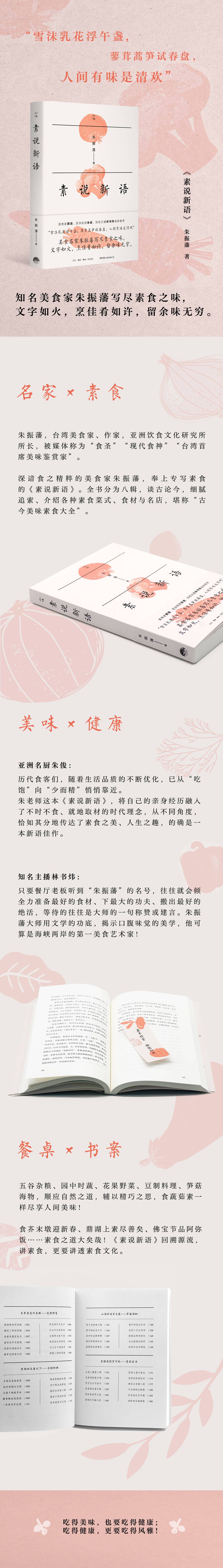 编辑推荐 -选择健康,一本书全方位了解素食! 有科学研究认为,人类就身体结构而言,并非肉食动物,适宜素食。生活中因宗教信仰、个人习惯等原因,长期忌荤茹素者大有人在,却不见忌素而纯粹食肉者,似亦可证素食确是人的必需之食。 -食蔬茹素,一样可以享受绝佳美味! 美食可以不用大鱼大肉,苏轼说“人间有味是清欢”,五谷杂粮、园中时蔬、花果野菜、豆制料理、笋菇海物,顺应自然之道,辅以精巧之思,素食原来可以如此美味! -源远流长,素食之道大矣哉! 食芥末墩迎新春、鼎湖上素尽善矣、佛宝节品阿弥饭……素食有讲究,食素是返璞归真,素食大道是博大精深的素食文化,《素说新语》讲素食,更要讲透素食文化! -名家写作,蔡澜、朱俊、林书祎诚挚推荐! 知名美食家朱振藩以“爱吃、能吃、敢吃、懂吃”著称,在《素说新语》中,他写尽素食之味,文字如火,烹佳肴如许,留余味无穷。美食家蔡澜、亚洲名厨朱俊、知名主播林书炜诚挚推荐。 内容简介 食蔬茹素已成为当代人喜闻乐见的生活方式,健康成为食物选择的根本。其实素食文化源远流长,不惟健康,更兼具雅致优美。苏东坡词里写“雪沫乳花浮午盏,蓼茸蒿笋试春盘,人间有味是清欢”,静下心来细细品味素食,爽口的同时,更能澡雪精神,陶冶情操。 深谙食之精粹的著名美食家朱振藩,遍尝美馔佳肴之后,返璞归真。在书案与餐桌间辛勤耕耘,在文献与餐盘里反复推敲,且读,且食,且写,自素菜中领略了不同的精巧之美,奉上堪称“古今美味素食大全”的《素说新语》。全书分为八辑,谈古论今,细腻追索、介绍各种素食菜式、食材与名店。读此书如品食上等素菜,益于身心,而又余味悠长。 作者简介 朱振藩,台湾美食家、作家,亚洲饮食文化研究所所长,有“食圣”“现代食神”“台湾首席美味鉴赏家”等封号。 原籍江苏靖江,生于基隆,是宋代大儒朱熹的第二十一世孙。 平生雅好文史,尤醉心于美酒佳肴,以“爱吃、能吃、敢吃、懂吃”著称。品过五万道菜、千种美酒,设计了红楼梦宴、张大千宴、随园食单宴。 涉猎极广,在多家报刊开有专栏。已出版《美食家菜单》《饕掏不绝》《味兼南北》《痴酒》等四十余部著作。 目 录 目 录 序 大道至简 / 朱 俊001 自序 素食之道大矣哉003 园中百蔬逾珍馐──田园蔬菜 茭白别称美人腿/007 西洋菜身世之谜/010 形似宝塔甘露子/013 炎夏良蔬有豇豆/016 豆腐乳炒空心菜/019 金边白菜饶滋味/022 凉拌白菜一段古/025 食芥末墩迎新春/028 最能发鲜大头菜/031 慈姑格比土豆高/034 ... ...