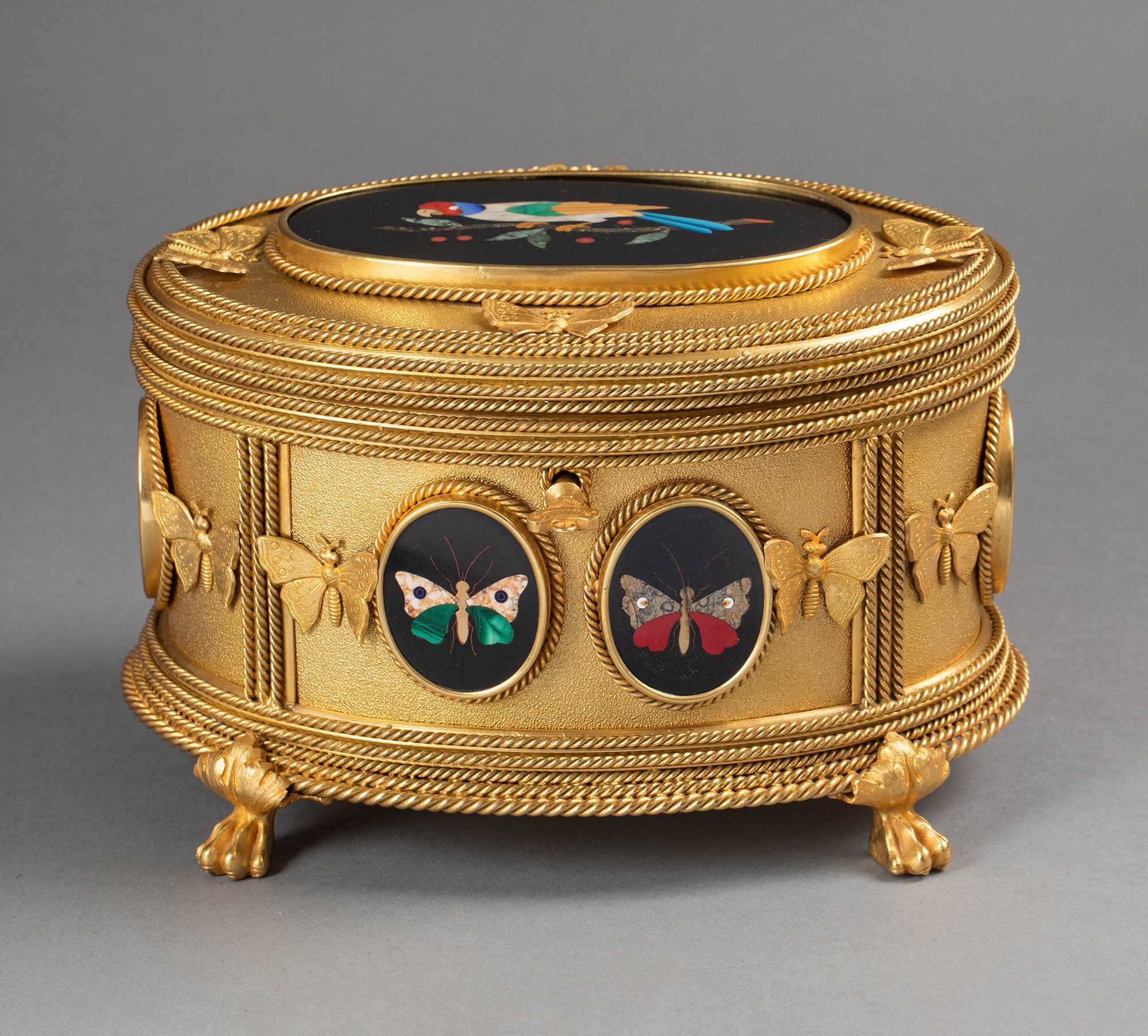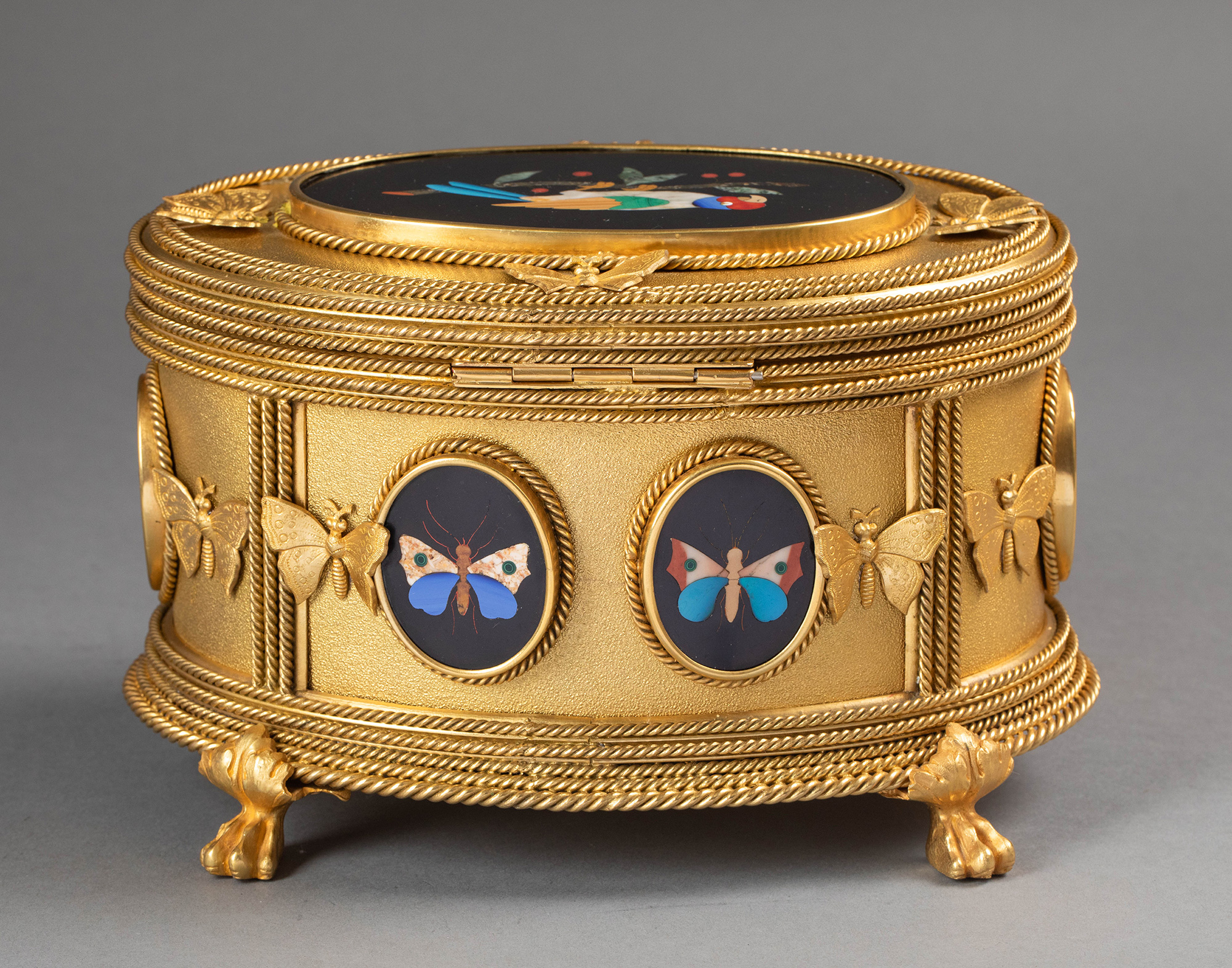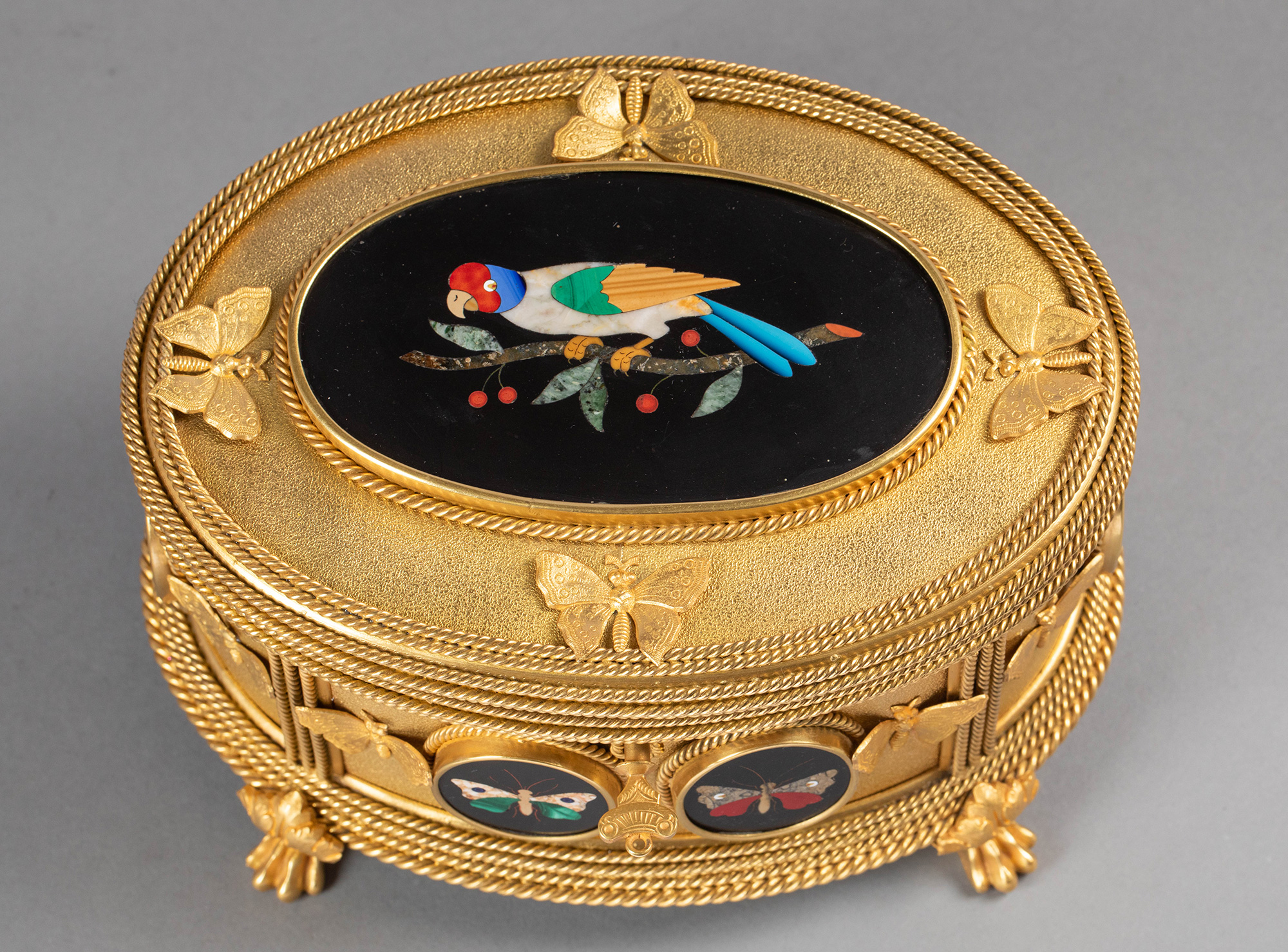 19世纪法国著名工坊TAHAN PARIS签名出品绳纹铜鎏金精雕装饰鹦鹉蝴蝶主题彩色硬石镶嵌珍宝盒