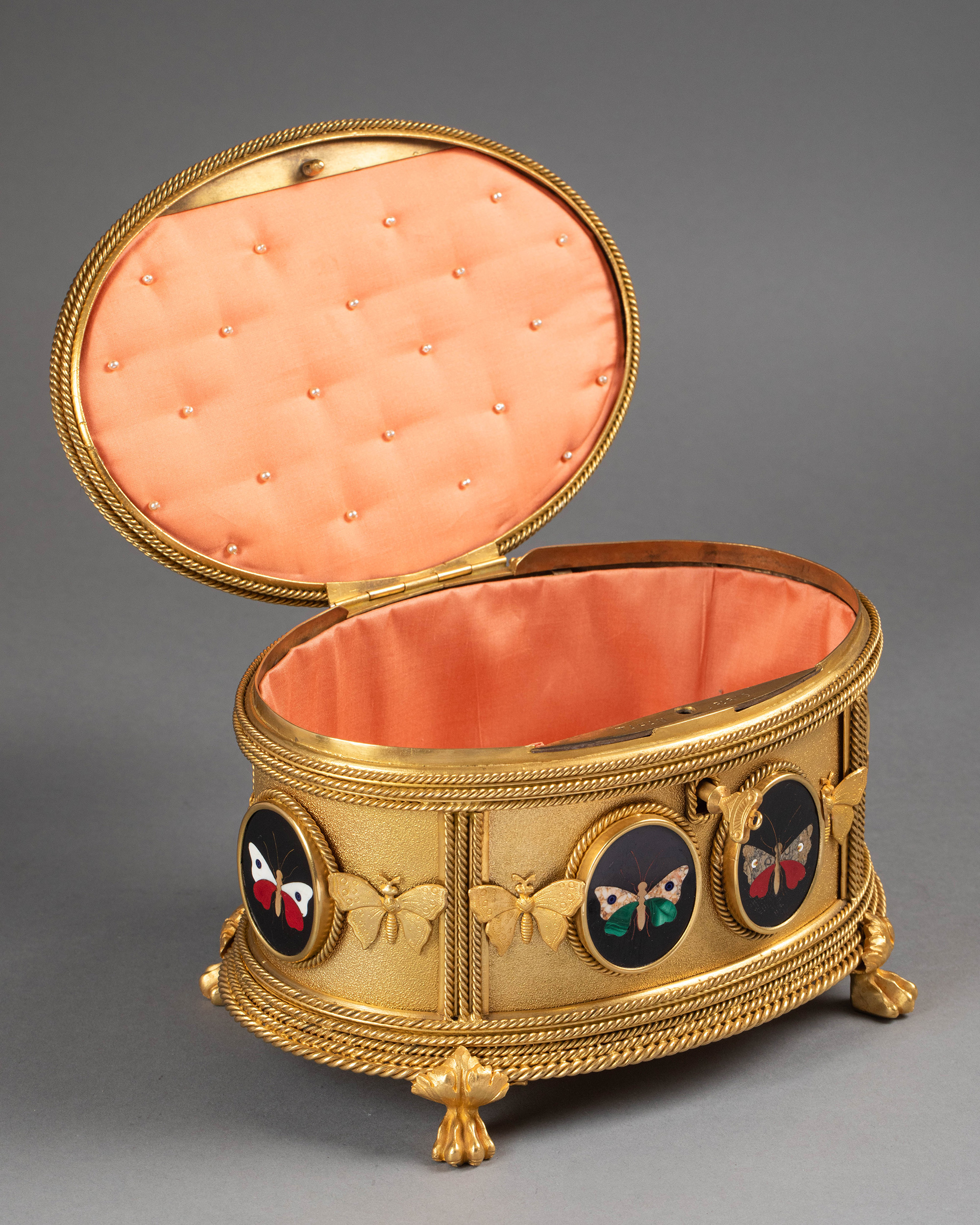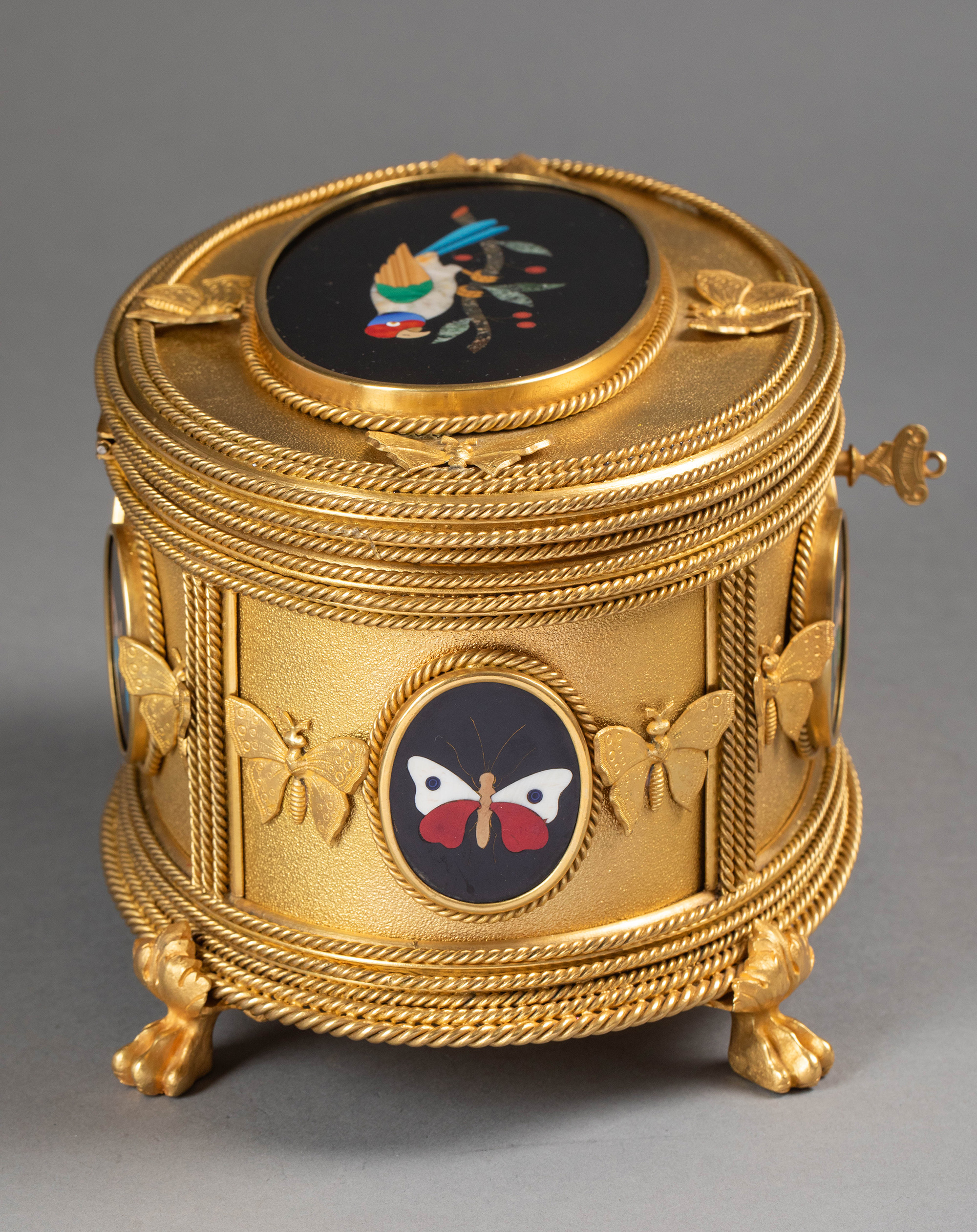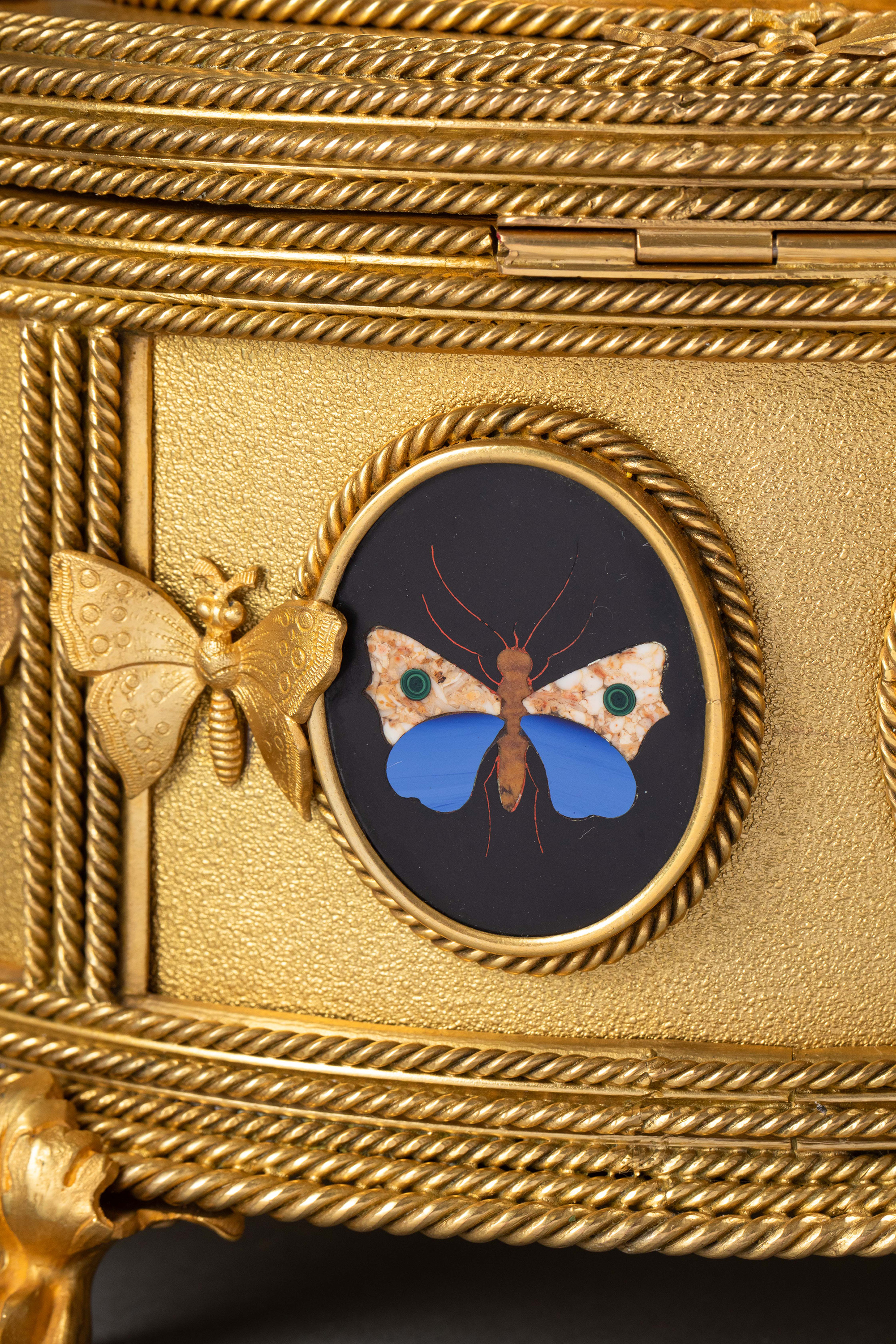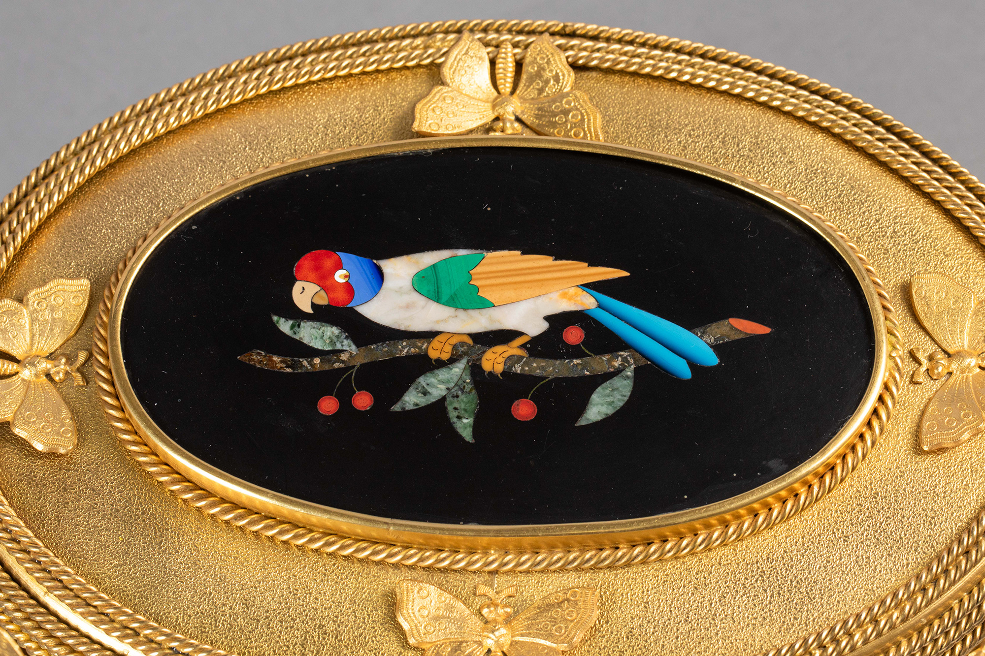 19世纪法国著名工坊TAHAN PARIS签名出品绳纹铜鎏金精雕装饰鹦鹉蝴蝶主题彩色硬石镶嵌珍宝盒