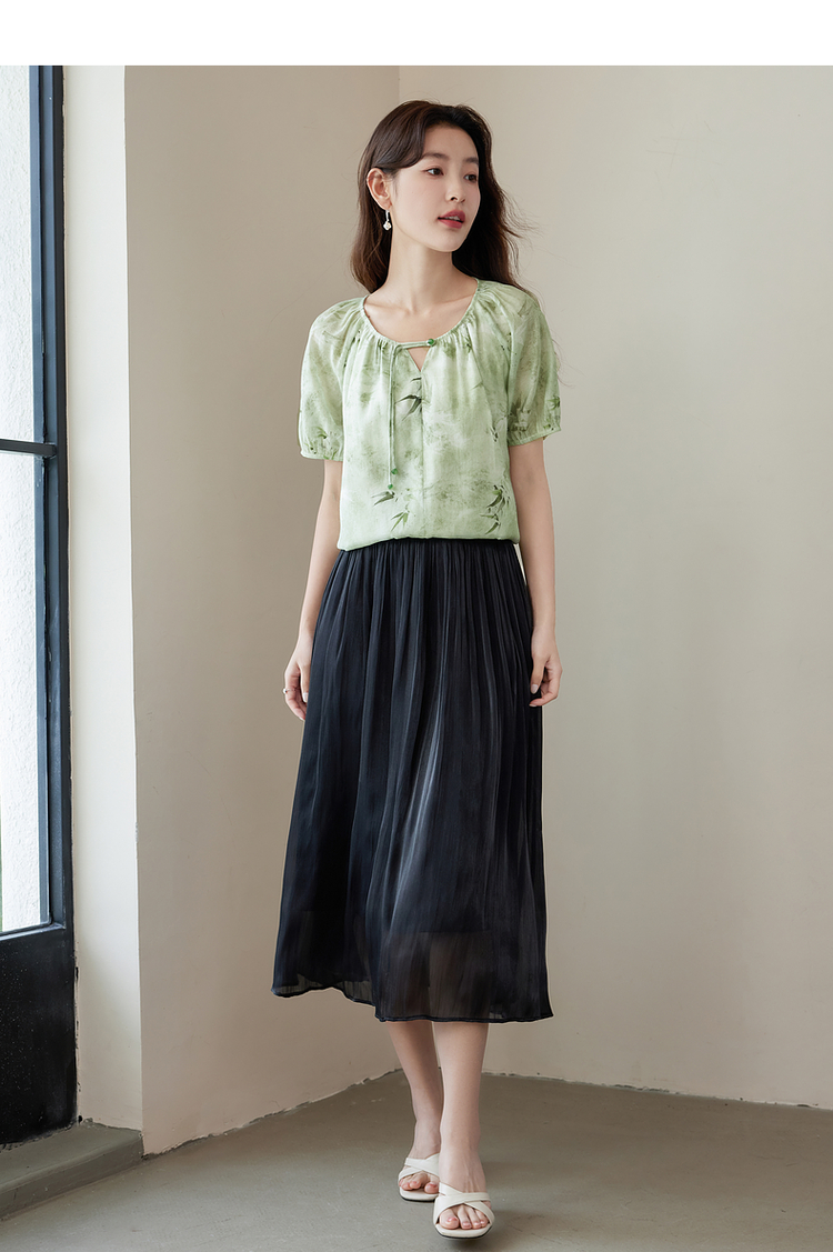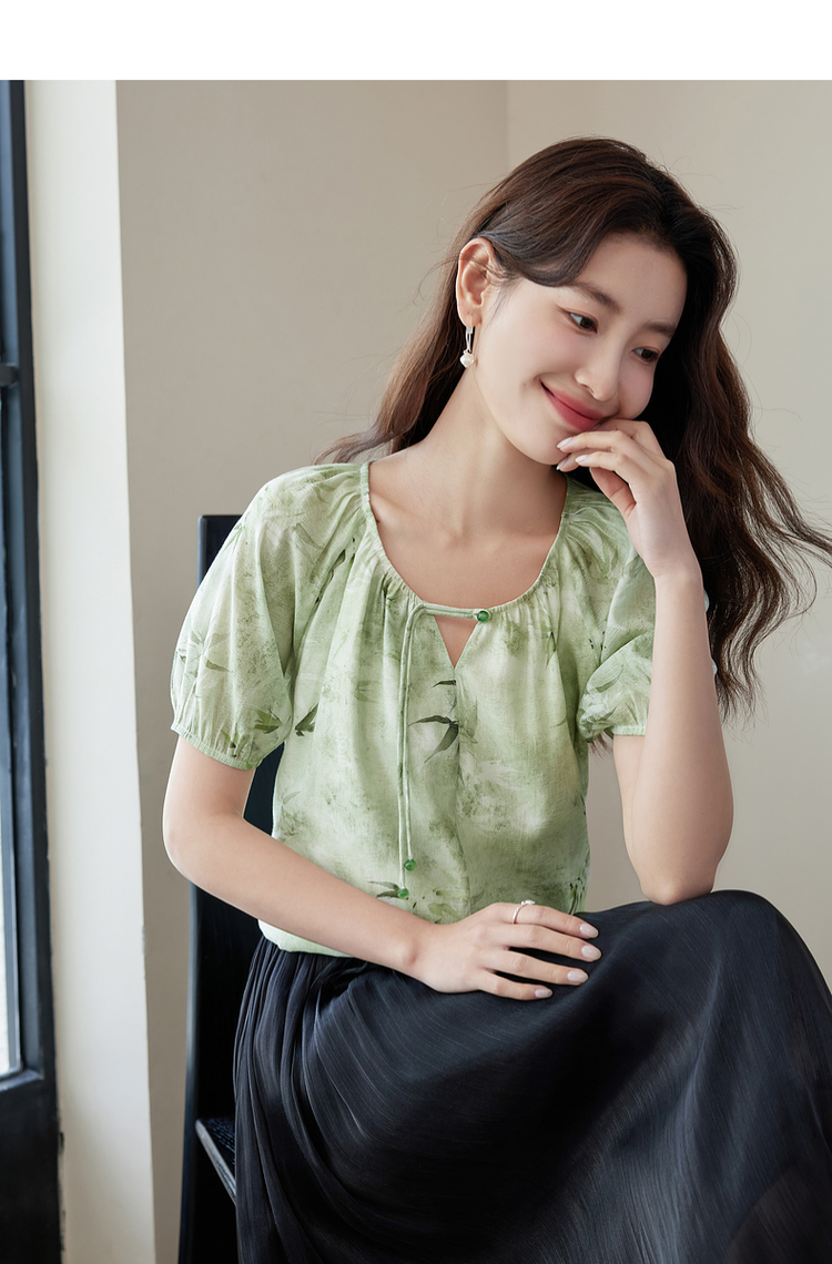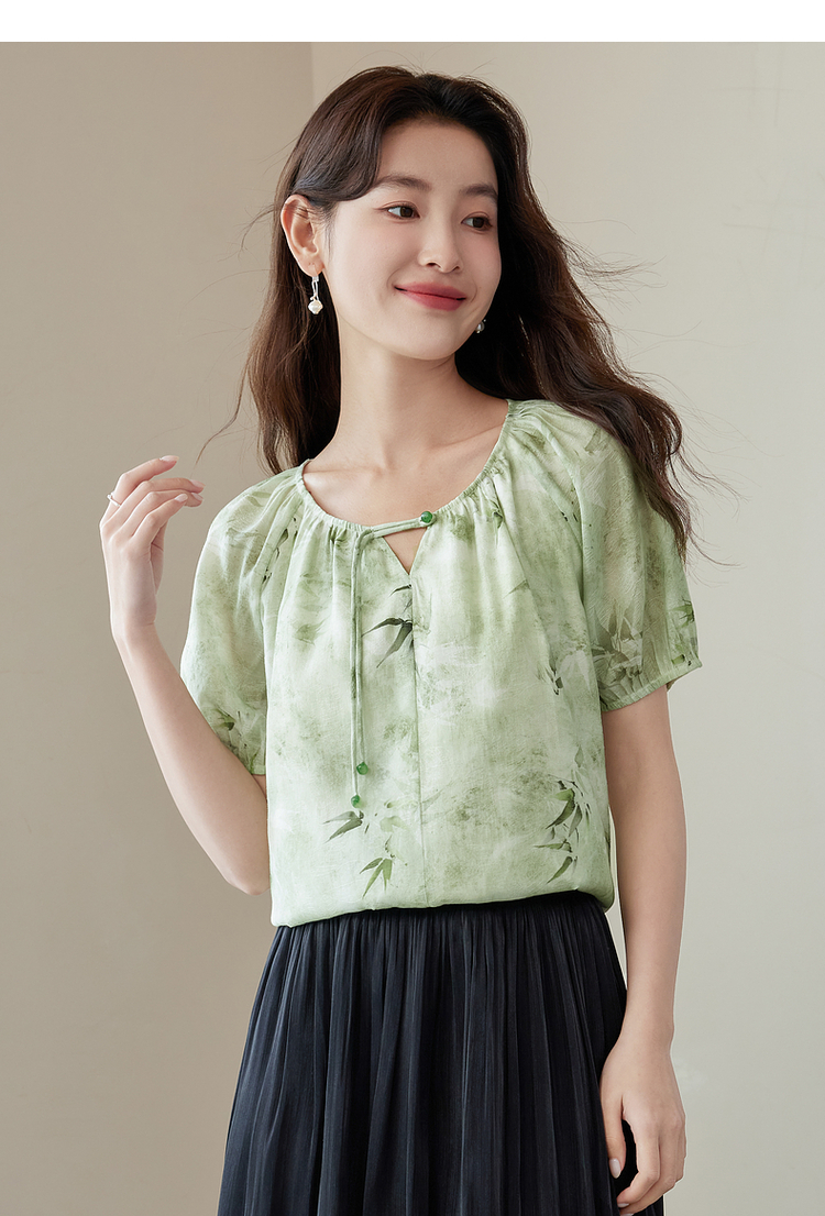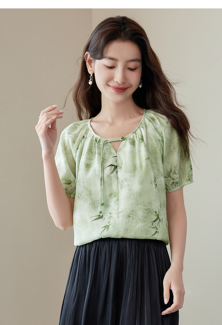 【专属特价】熙世界《青竹烟雨》新中式国风印花衬衫夏短袖流苏盘扣绿色上衣