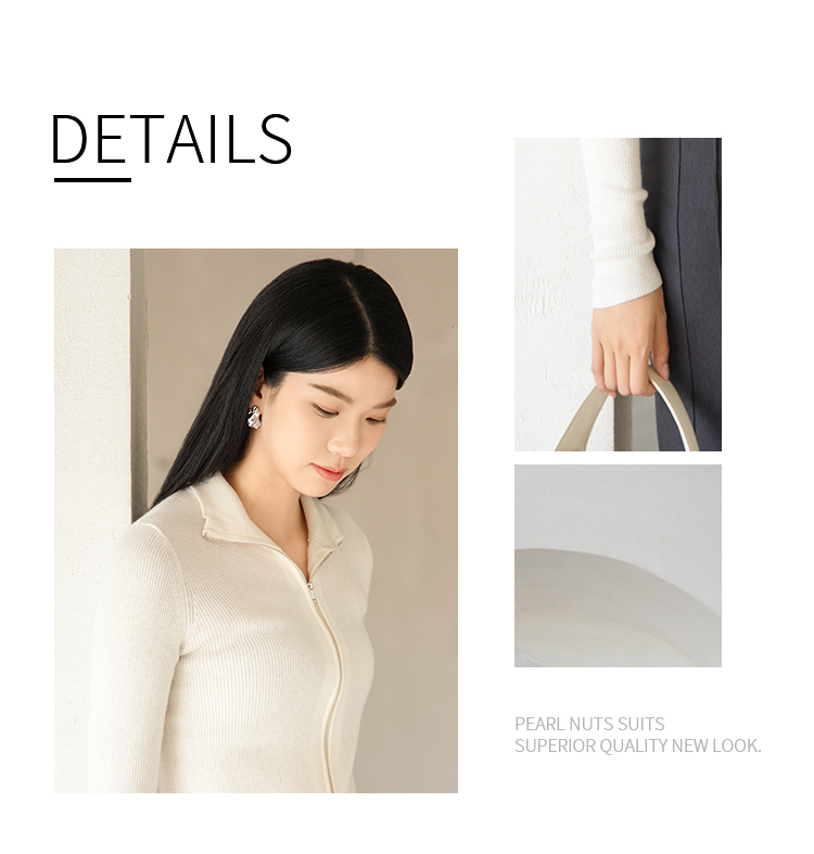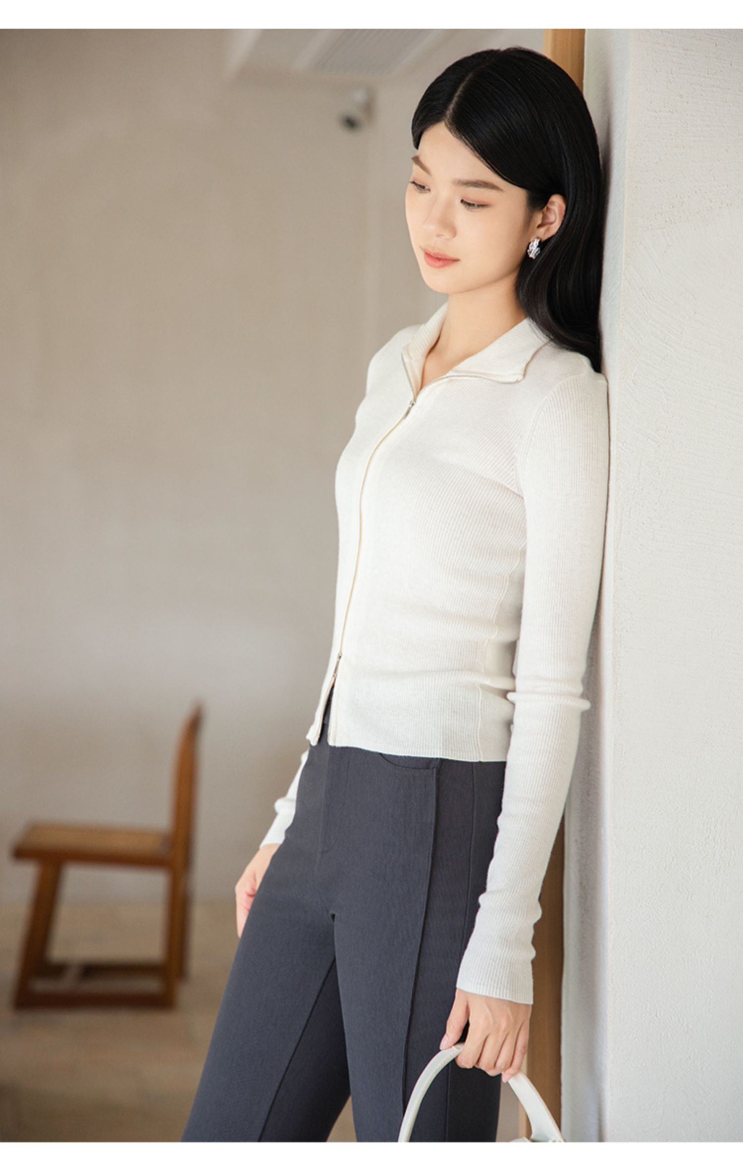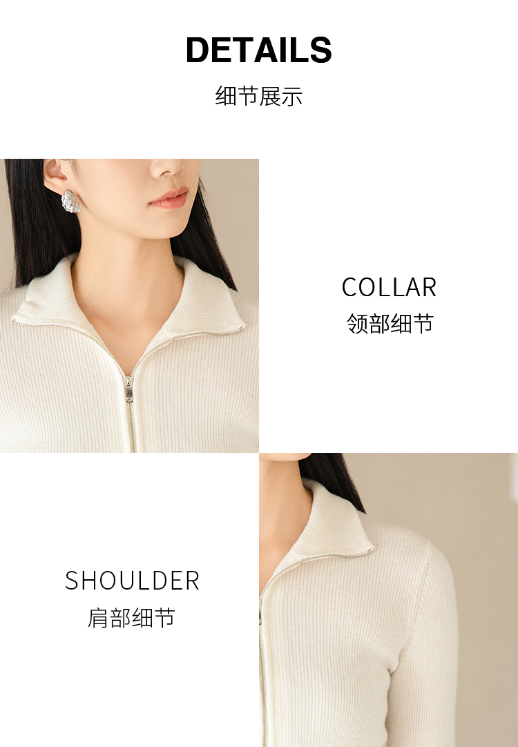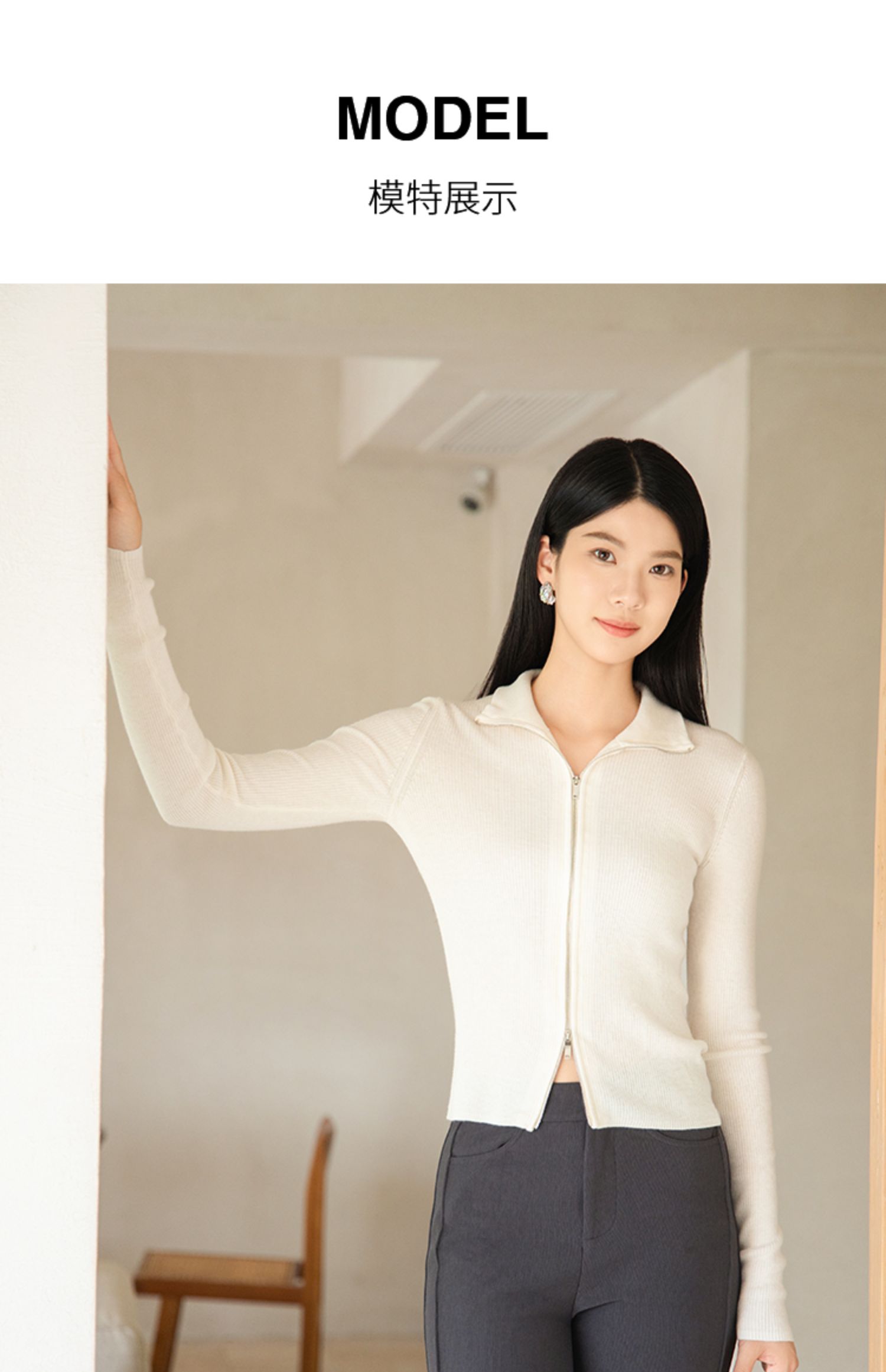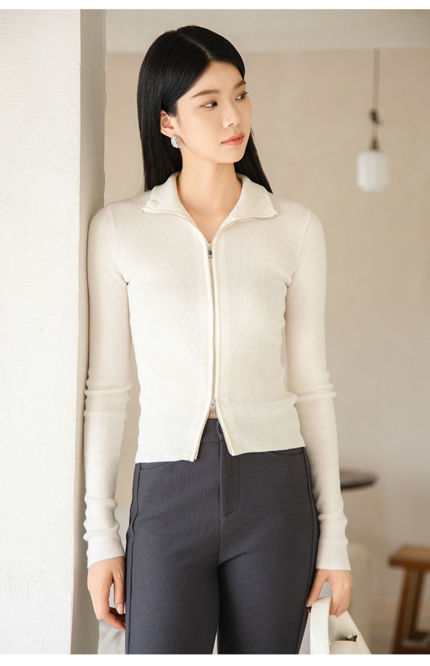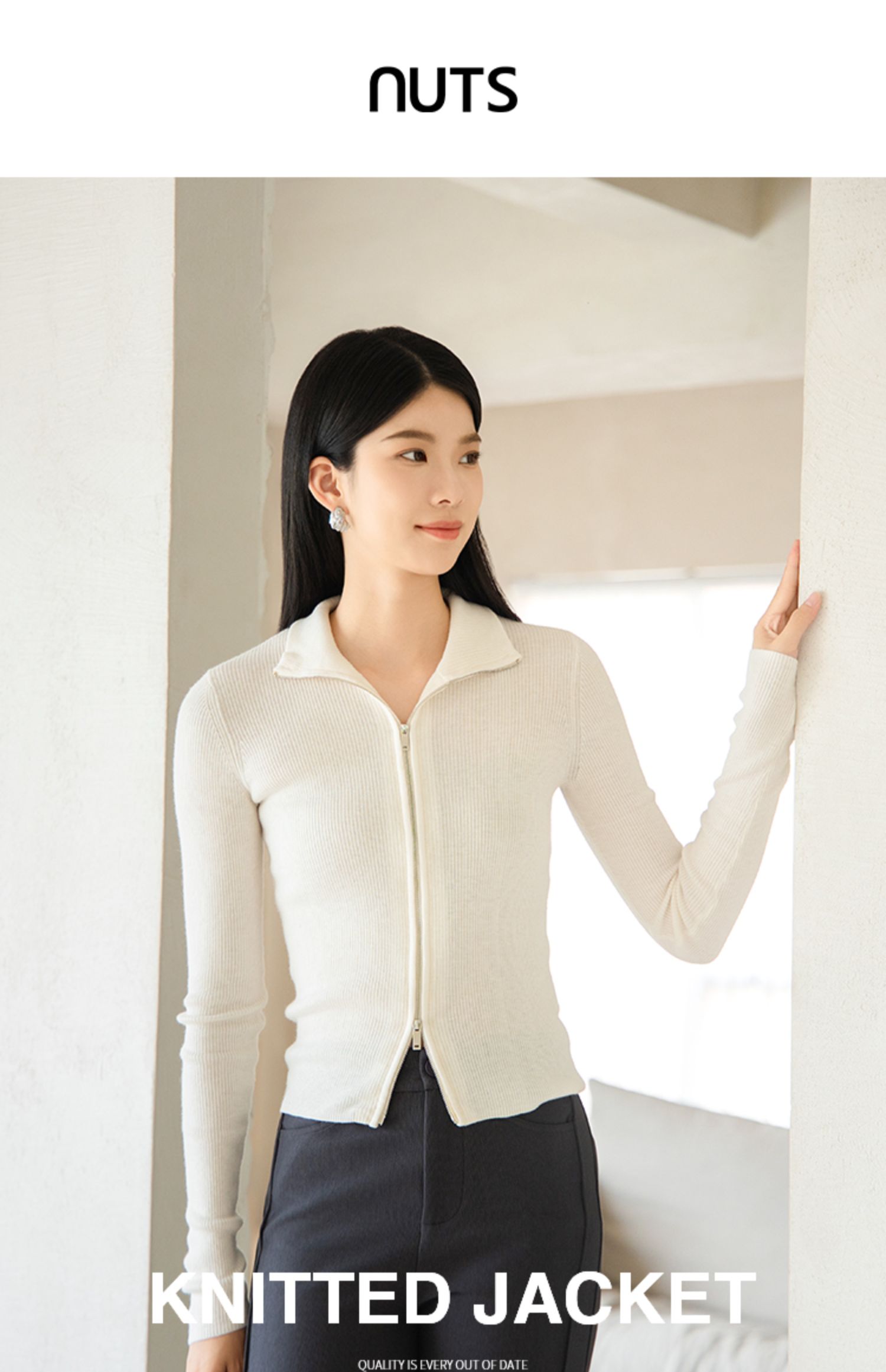 NUTS秋季新款白色简约韩系气质翻领拉链长袖针织开衫女4330509A1