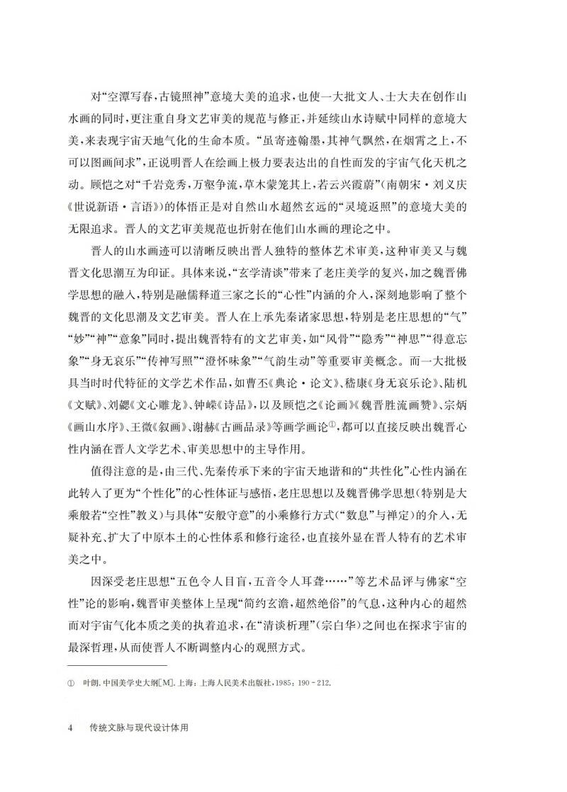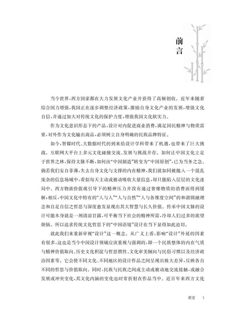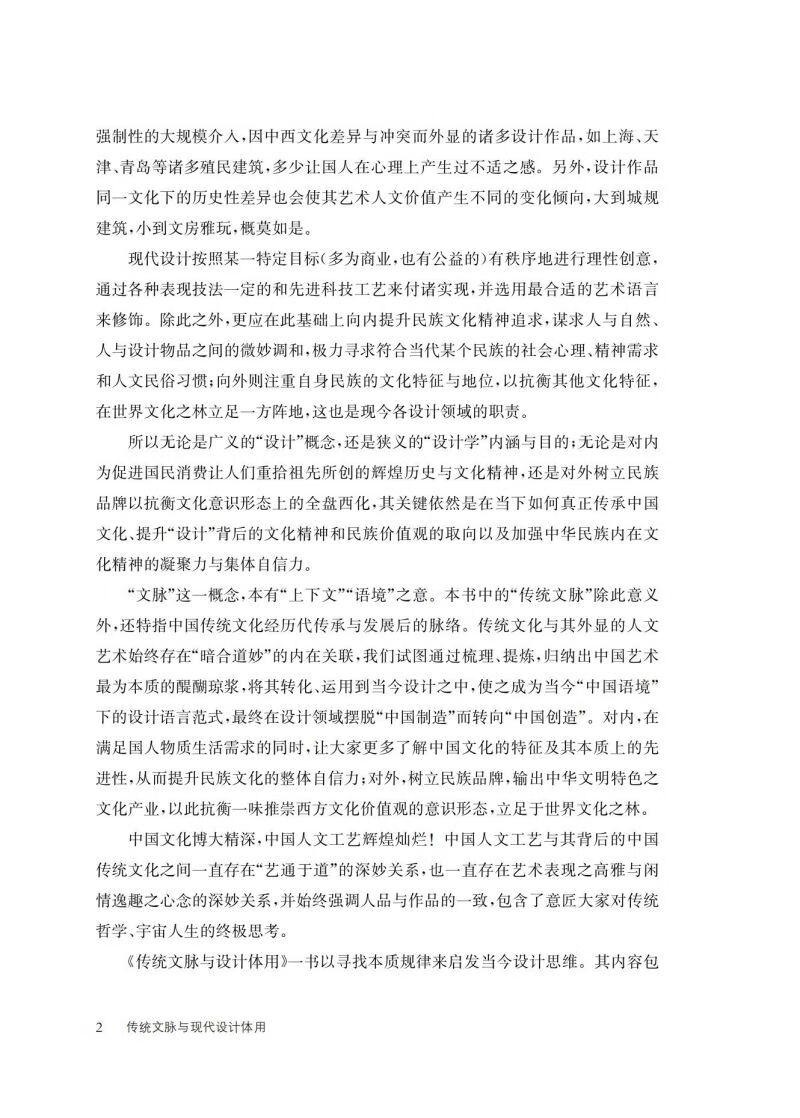 “文脉”这一概念,本有“上下文”“语境”之意。本书中的“传统文脉”除此意义外,还特指中国传统文化经历代传承与发展后的脉络。传统文化与其外显的人文艺术始终存在“暗合道妙”的内在关联,我们试图通过梳理、提炼,归纳出中国艺术最为本质的醍醐琼浆,将其转化、运用到当今设计之中,使之成为当今“中国语境”下的设计语言范式,最终在设计领域摆脱“中国制造”而转向“中国创造”。对内,在满足国人物质生活需求的同时,让大家更多了解中国文化的特征及其本质上的先进性,从而提升民族文化的整体自信力;对外,树立民族品牌,输出中华文明特色之文化产业,以此抗衡一味推崇西方文化价值观的意识形态,立足于世界文化之林。