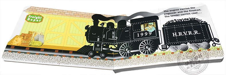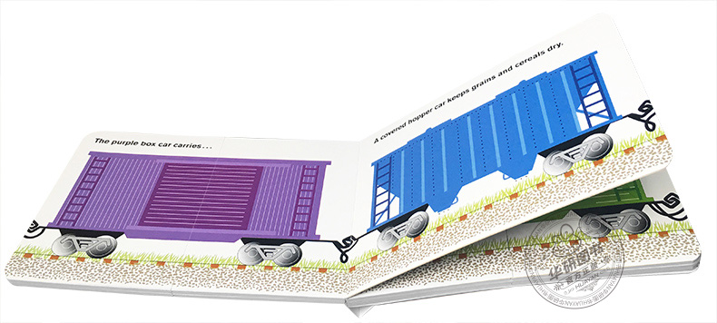 Inside Freight Train《货运列车里》是一本神奇的抽拉机关科普书,色彩鲜艳,造型大胆。作者在美国南部祖父母的农场旅行时,想到了有关火车的童年回忆,并产生创作此书的灵感。书中用简洁有力的词汇和生动形象的插图,刻画了不同颜色和形状的货运列车。通过抽拉纸板书页面,可以看到车里面各种各样的事物。形象的操作配上简单的图文,培养孩子的想象力和阅读兴趣。