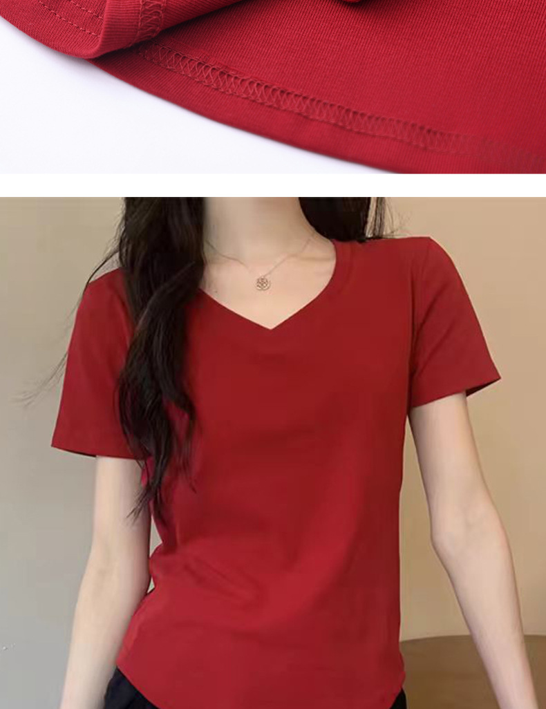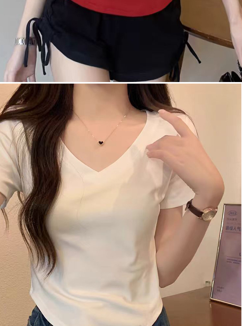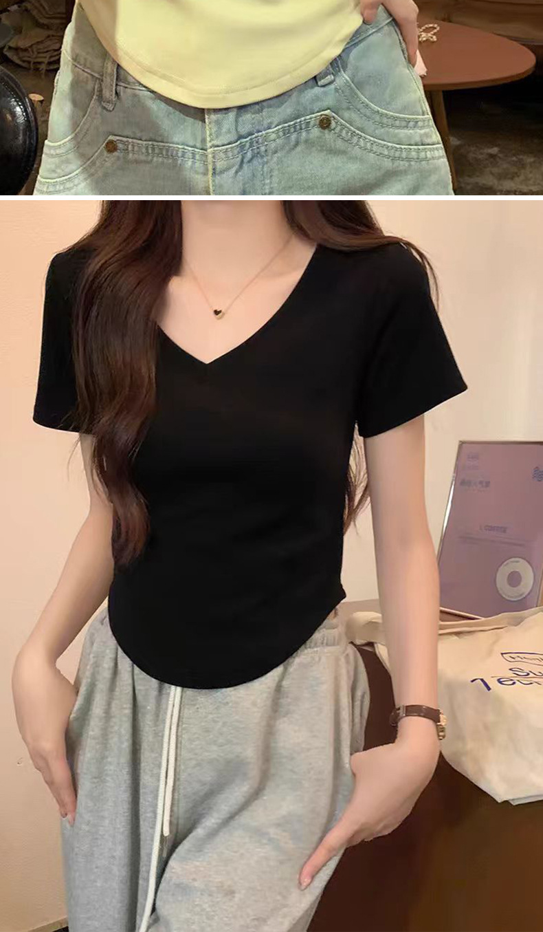 【热卖中!89/任选两件】纯棉短袖T恤女夏季新款V领修身收腰下摆不规则弧形纯欲风女装上衣,V领修身款式,下摆不规则弧形。ry