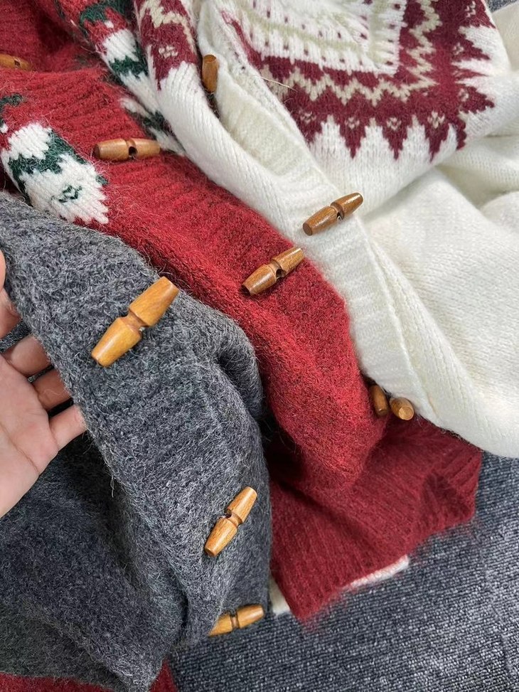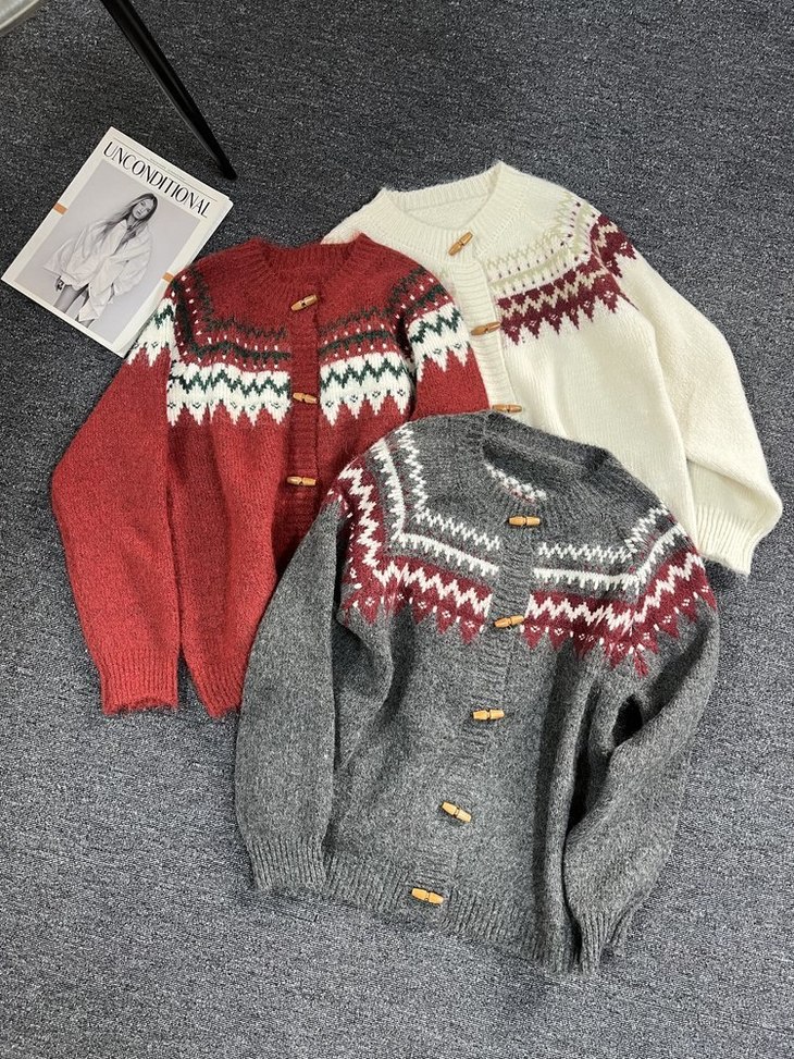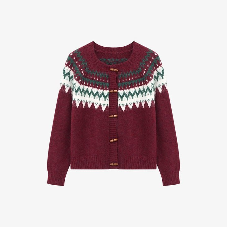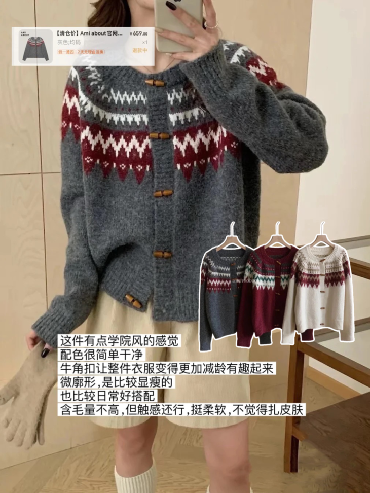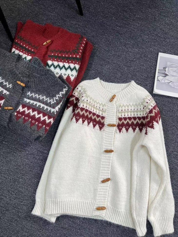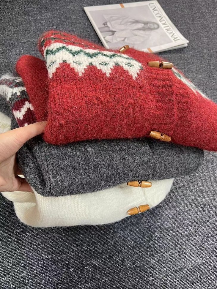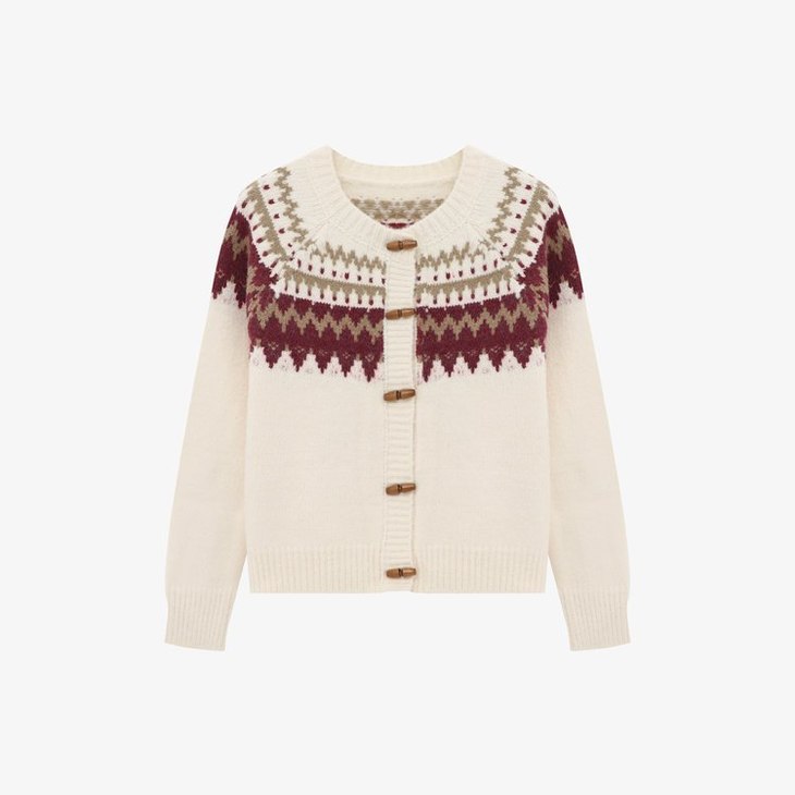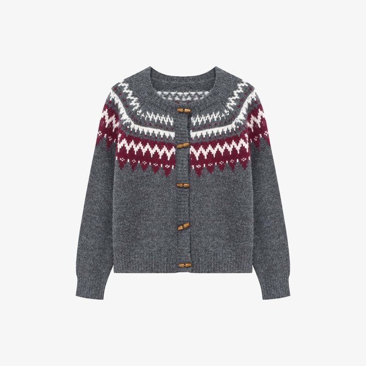 复古红款是圣诞季的心动信号,红棕底色交织绿白纹样,牛角扣轻叩复古门扉,穿上它,仿佛漫步在北欧小镇的圣诞市集,每一针都藏着暖冬的欢愉。 奶白款似落雪后的北欧清晨,米白基底晕染酒红图腾,软乎乎的羊毛触感裹住一身慵懒,搭配牛仔裤或半裙,都是法式少女的随性腔调。 深灰款是复古绅士的温柔变奏,灰调里跃动红白色织花纹,牛角扣的木质肌理碰撞羊毛的柔软,叠穿衬衫或单穿,都透着毫不费力的高级感。