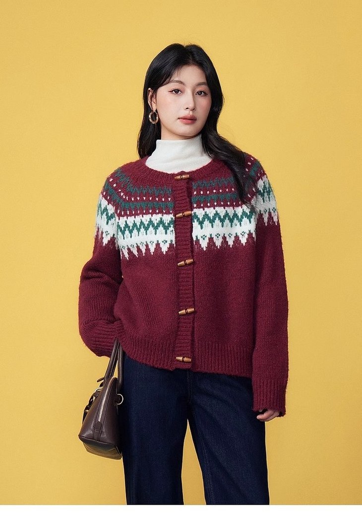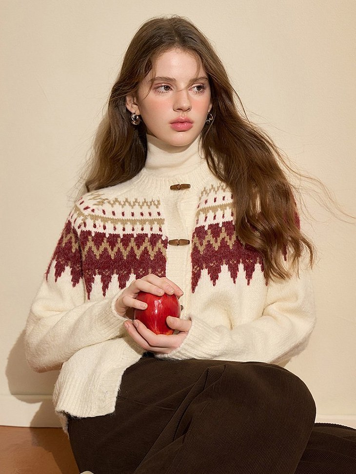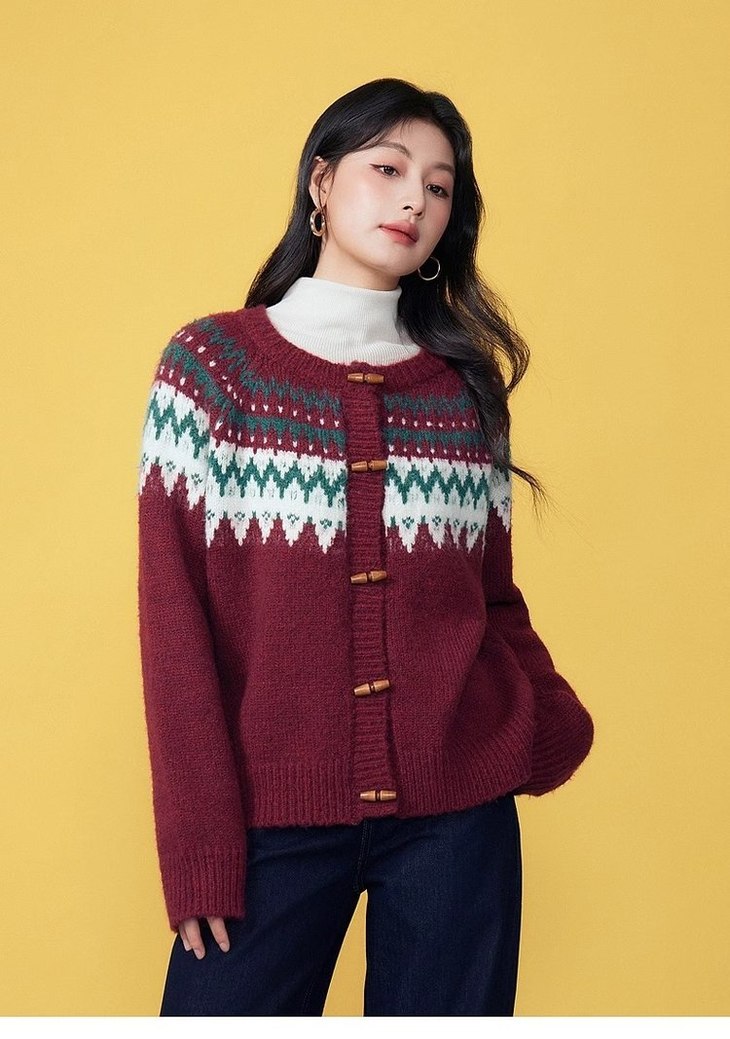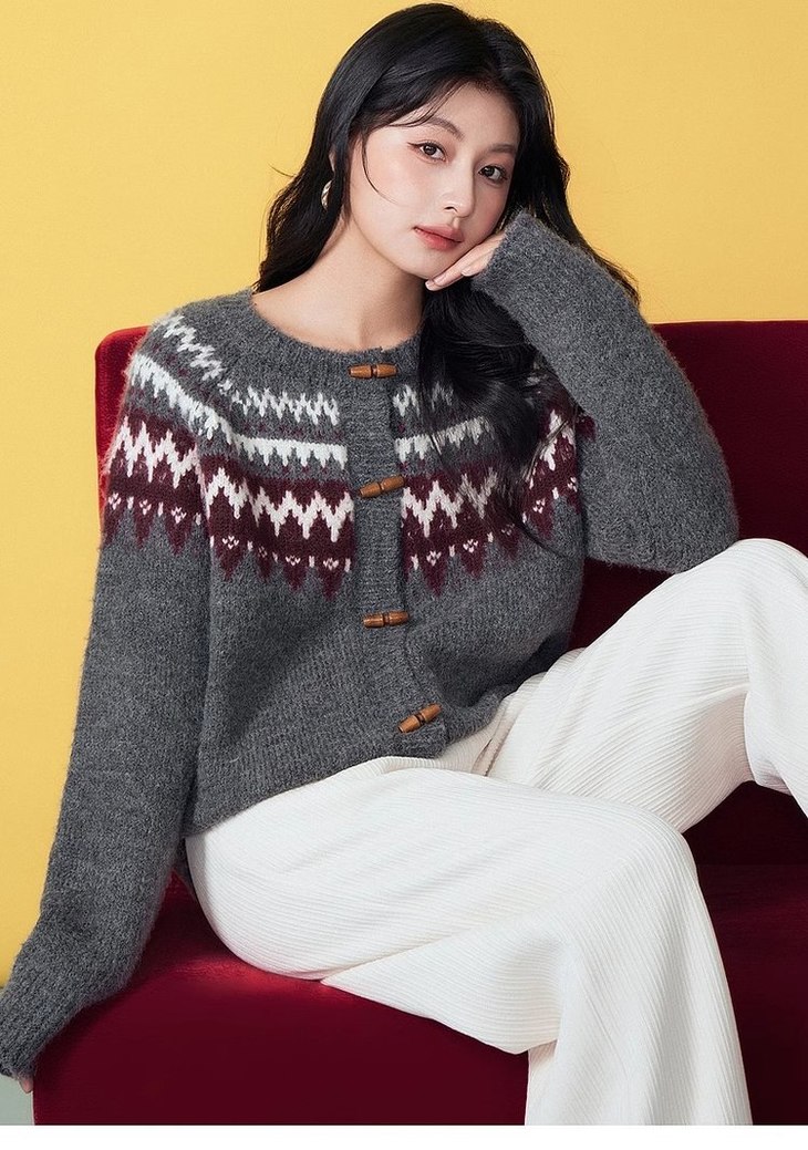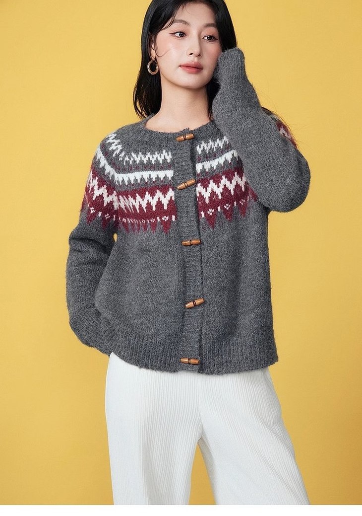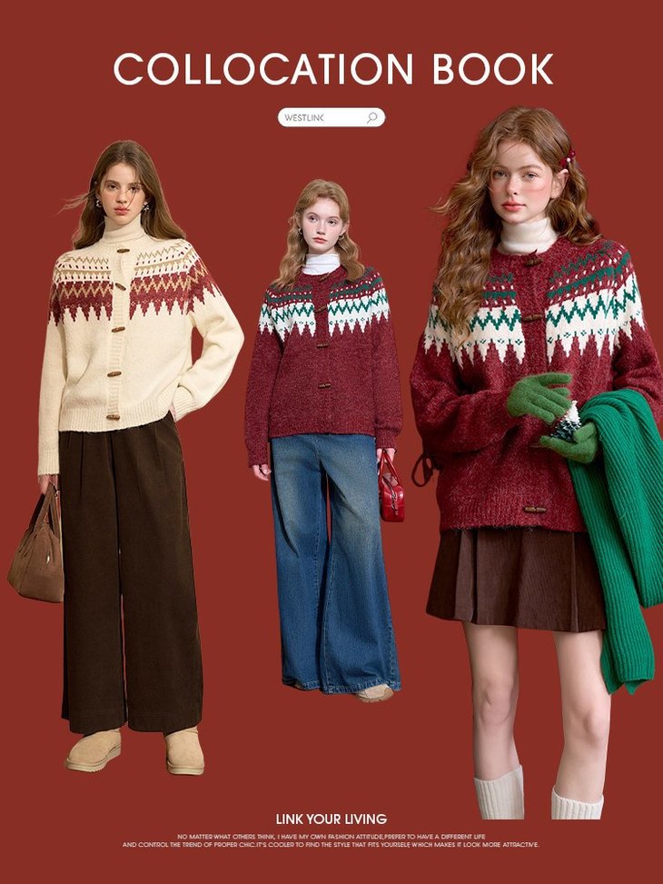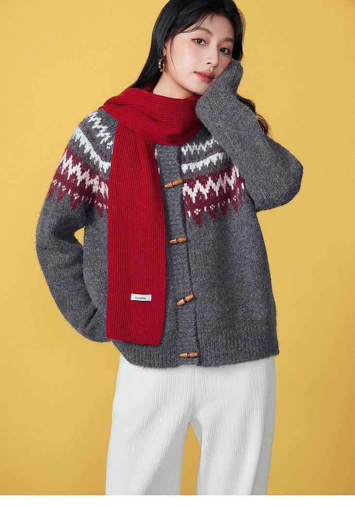 复古红款是圣诞季的心动信号,红棕底色交织绿白纹样,牛角扣轻叩复古门扉,穿上它,仿佛漫步在北欧小镇的圣诞市集,每一针都藏着暖冬的欢愉。 奶白款似落雪后的北欧清晨,米白基底晕染酒红图腾,软乎乎的羊毛触感裹住一身慵懒,搭配牛仔裤或半裙,都是法式少女的随性腔调。 深灰款是复古绅士的温柔变奏,灰调里跃动红白色织花纹,牛角扣的木质肌理碰撞羊毛的柔软,叠穿衬衫或单穿,都透着毫不费力的高级感。