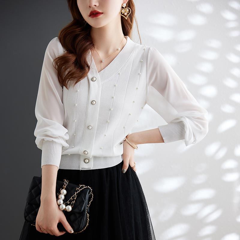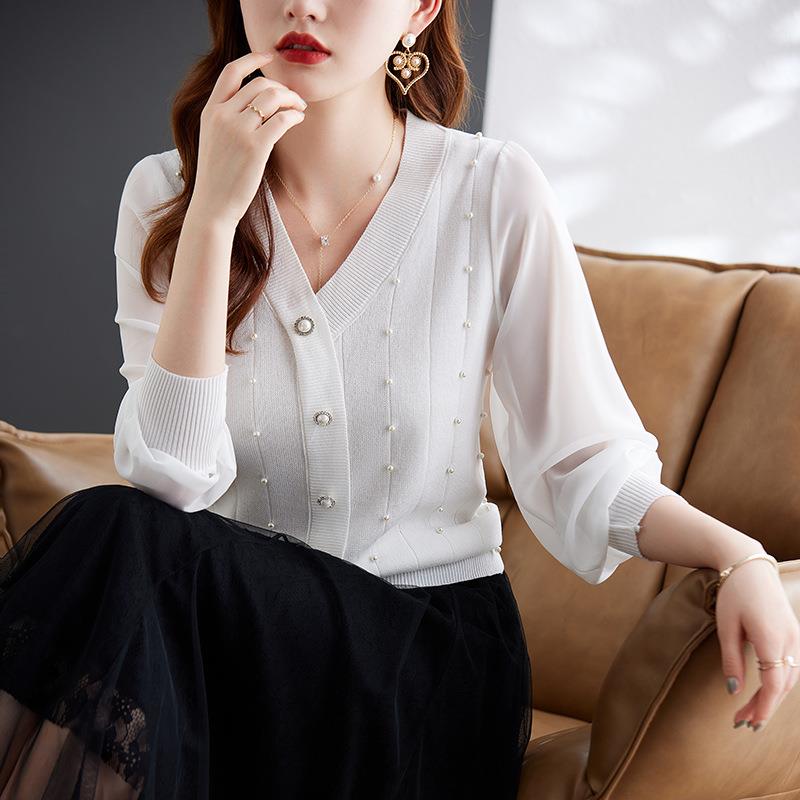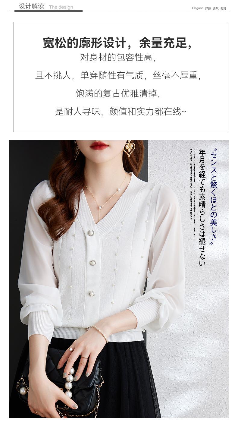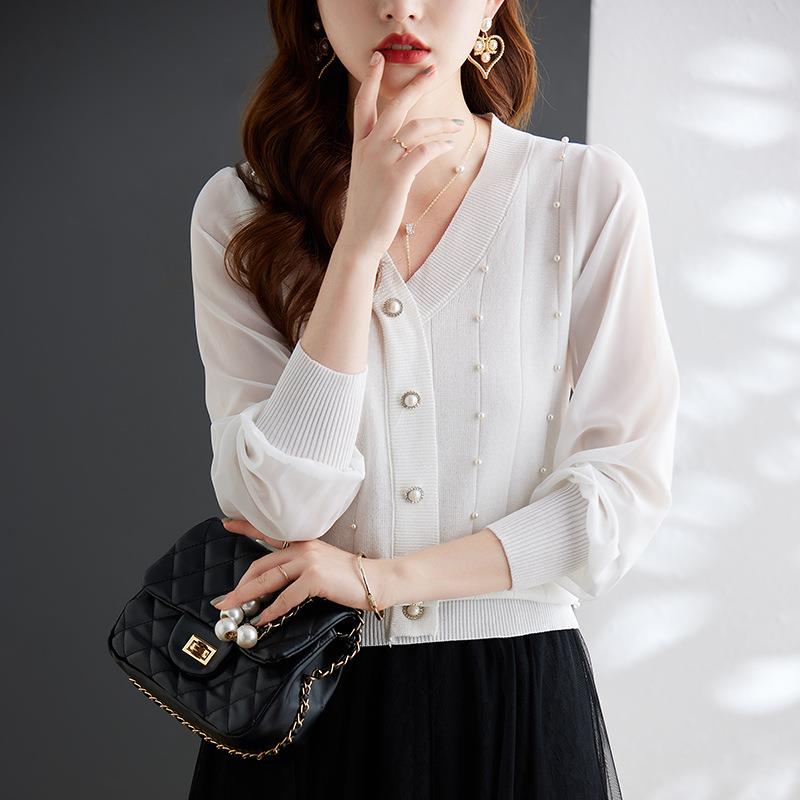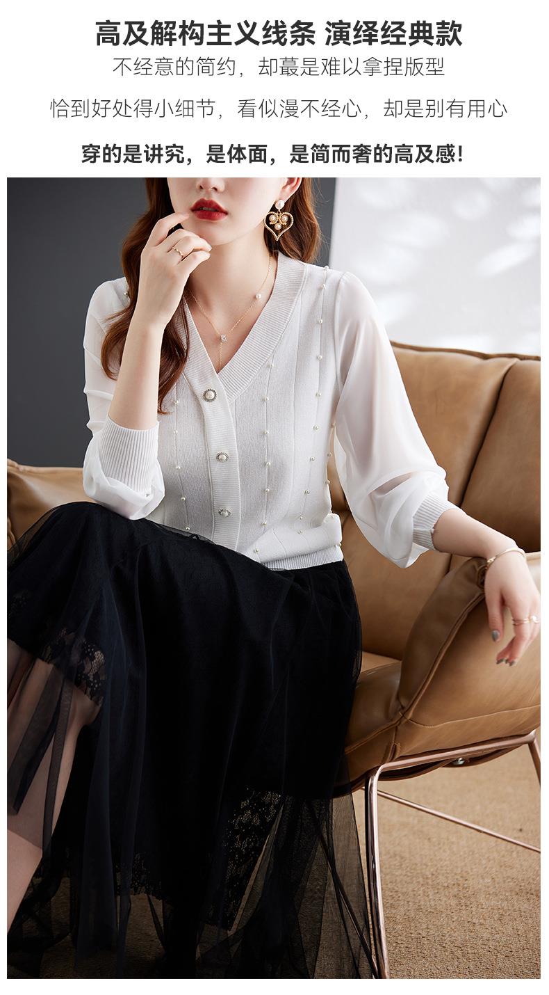 娜璐多 钉珠长袖针织衫温柔风2023早秋新款时尚气质雪纺上衣女拼接内搭