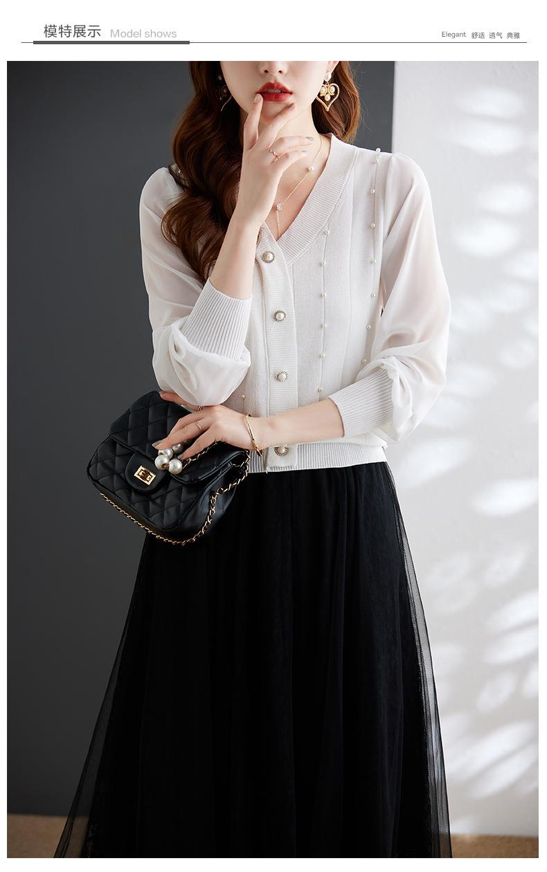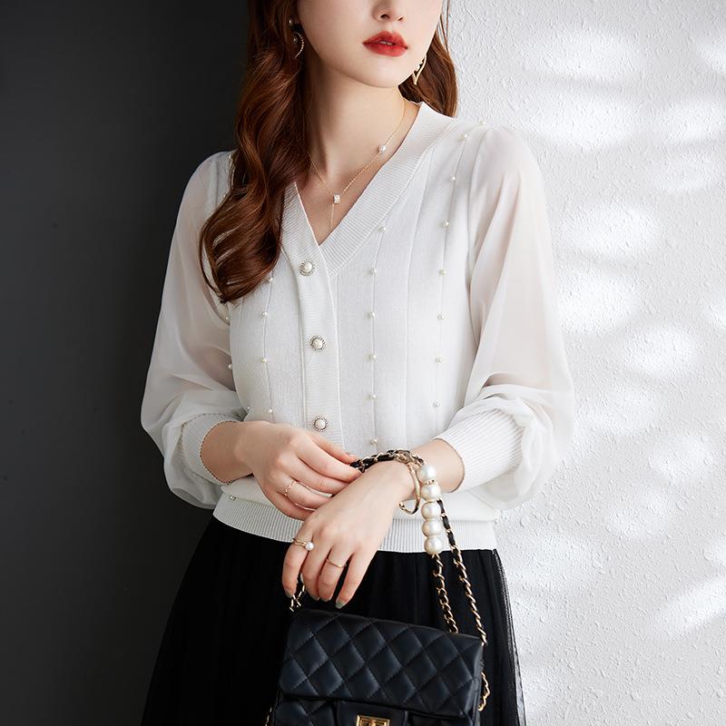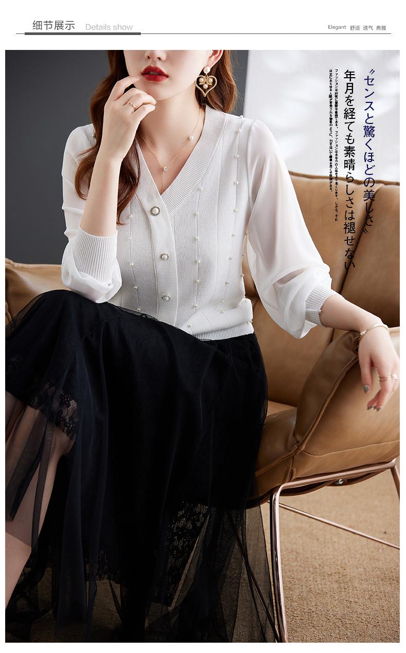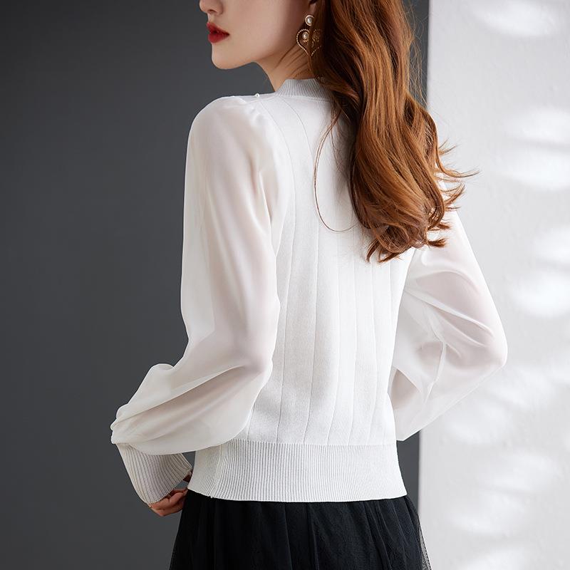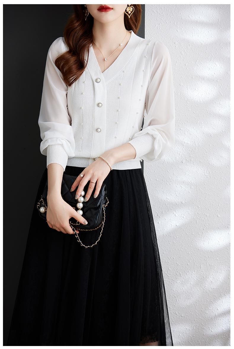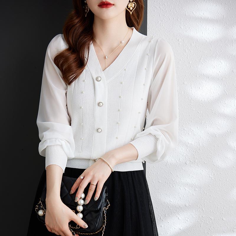 娜璐多 钉珠长袖针织衫温柔风2023早秋新款时尚气质雪纺上衣女拼接内搭