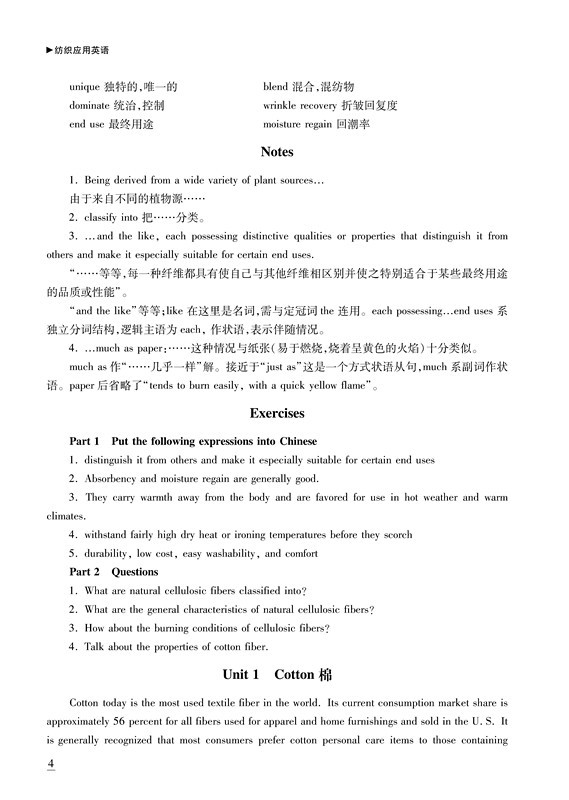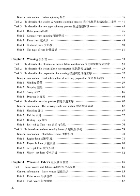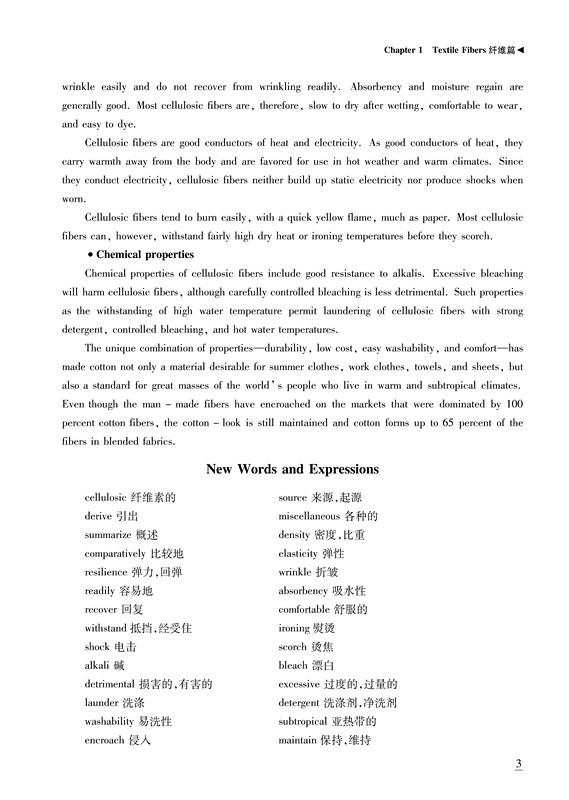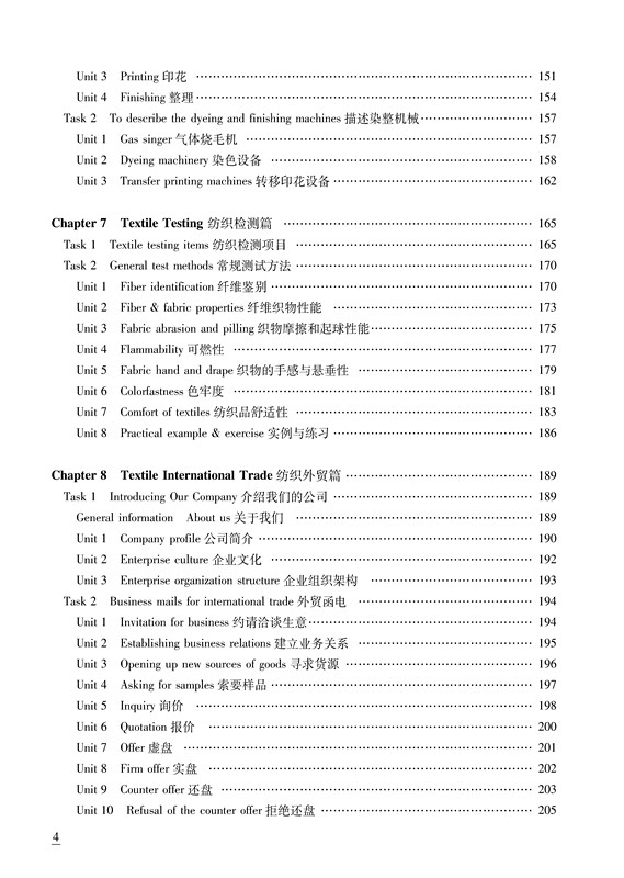 本书集纺织专业技术英语和纺织外贸英语于一体,与纺织生产、经营实际紧密结合,专业技术涉及纤维、纺纱、机织、组织与面料、非织造布、针织、染整、检测等内容,纺织外贸包括企业介绍、外贸函电、单证、合同、外贸术语以及外贸对话等内容。具有图文化、案例化、模板化、简明化的特点,讲究实用,配有词汇、注释、练习项目,适合自学、易于理解,更便于读者在实际工作中举一反三地遵循应用。即使大学英语四级水平以下的读者也可方便地阅读学习。