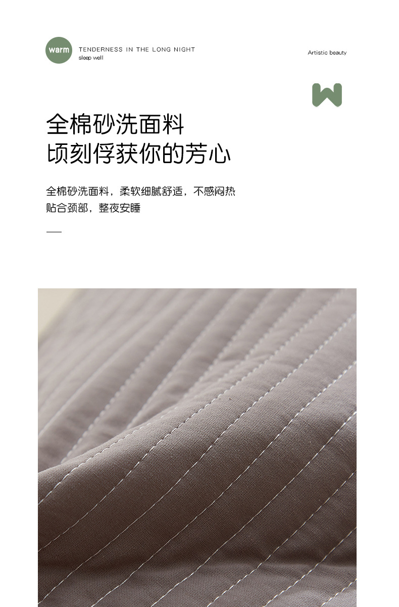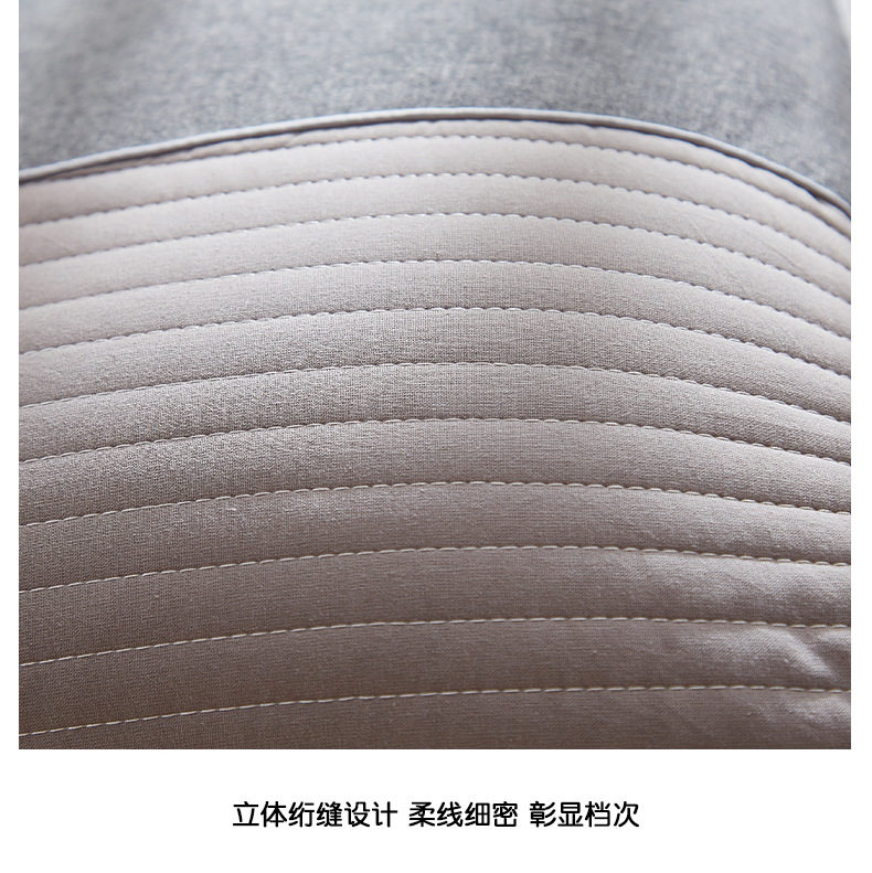 完全的自然选材,全面砂洗面料,活性印染,贴近接触也不用担心过敏等。优雅的麦穗纹路,立体滚边包边,6~8cm的支撑高度,符合普通成年人需要的枕芯高低。