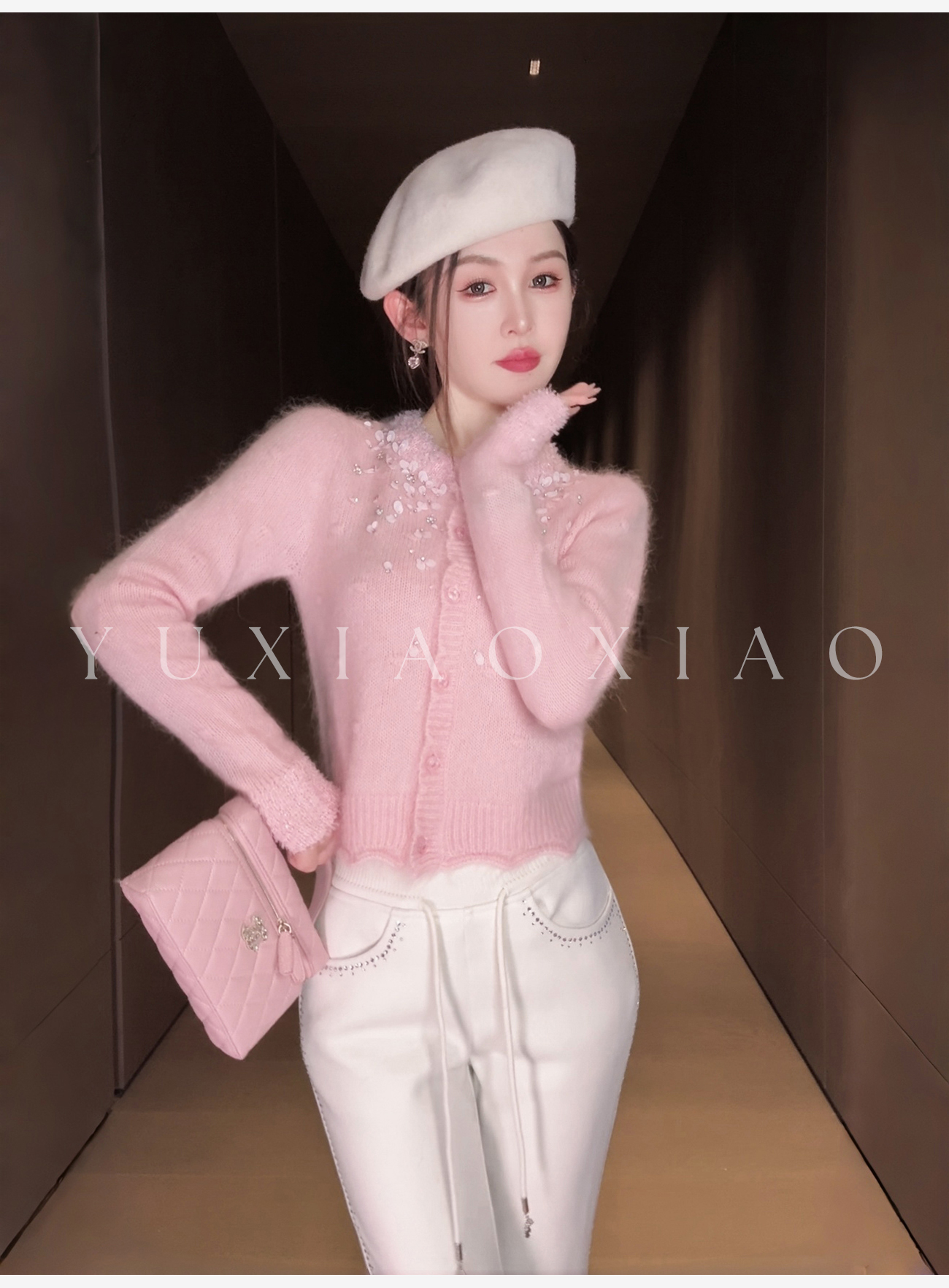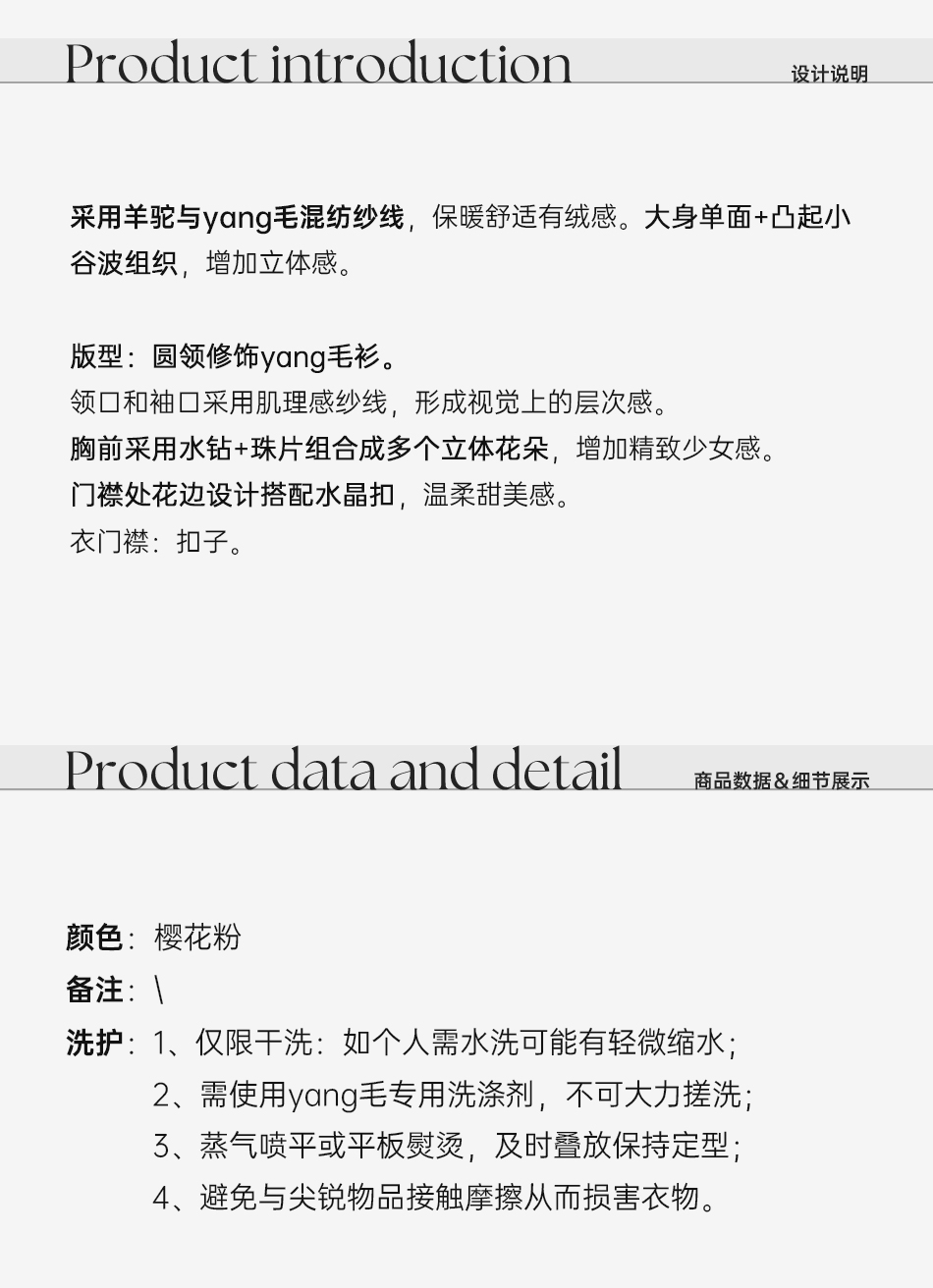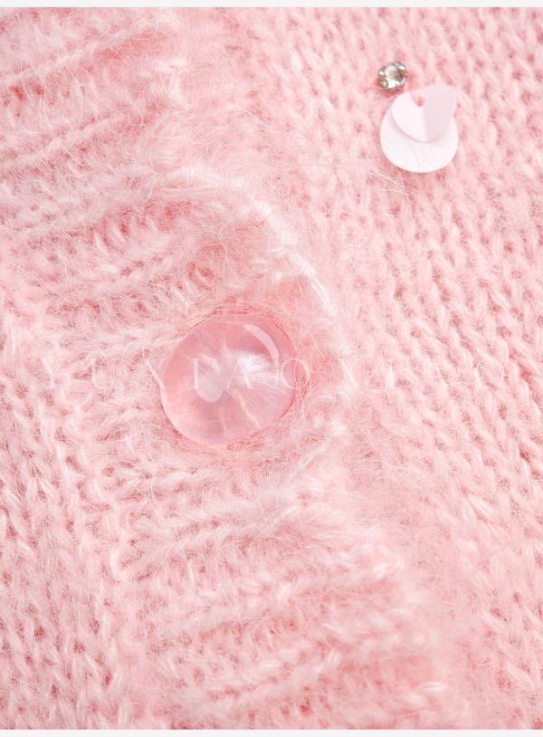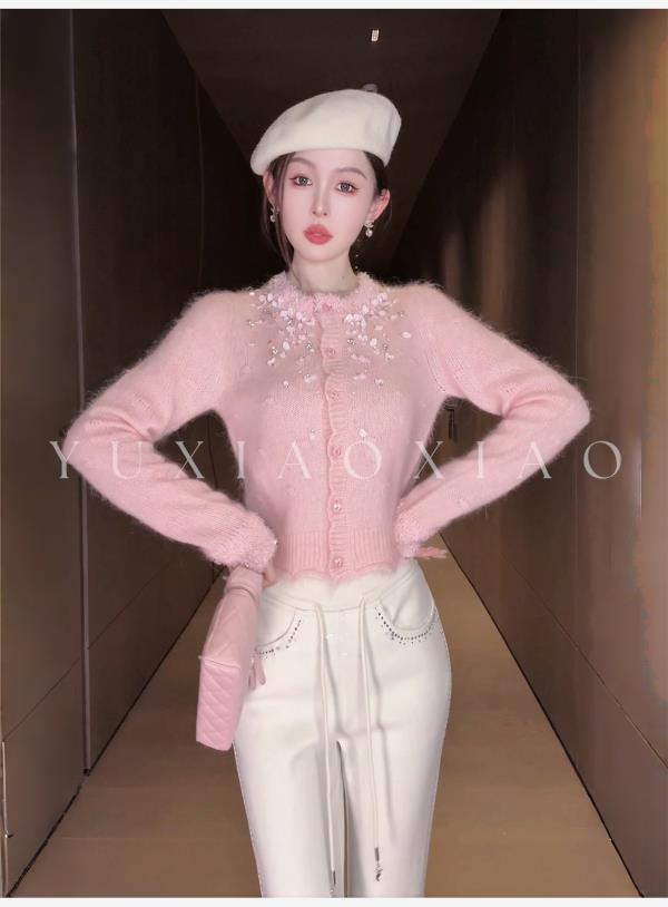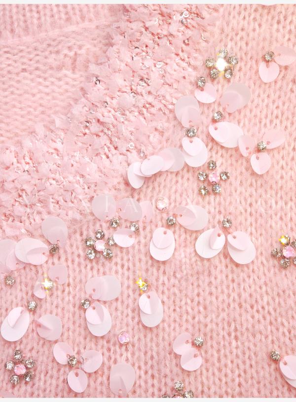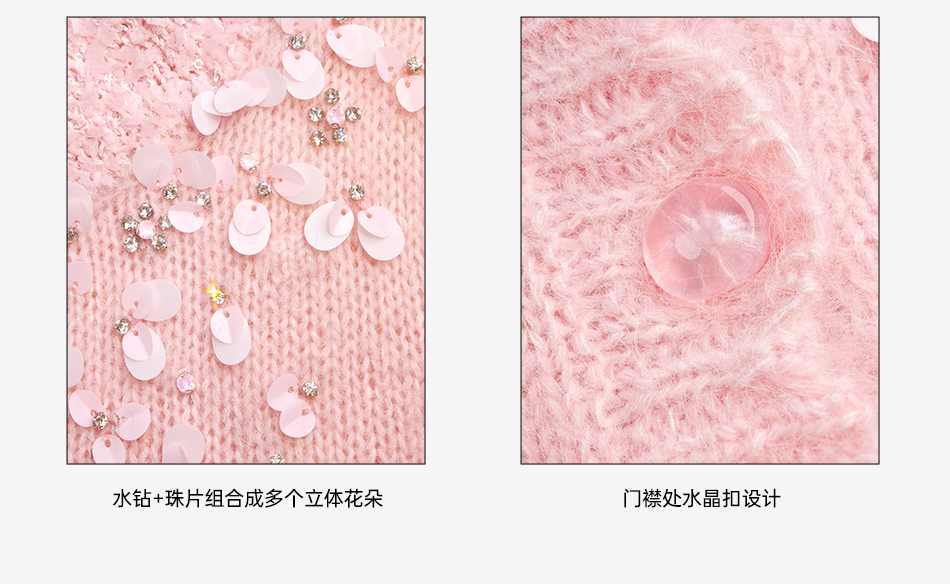 余潇潇【樱花降落】羊驼毛羊毛混纺珠片水钻立体花朵羊毛衫圆领开衫