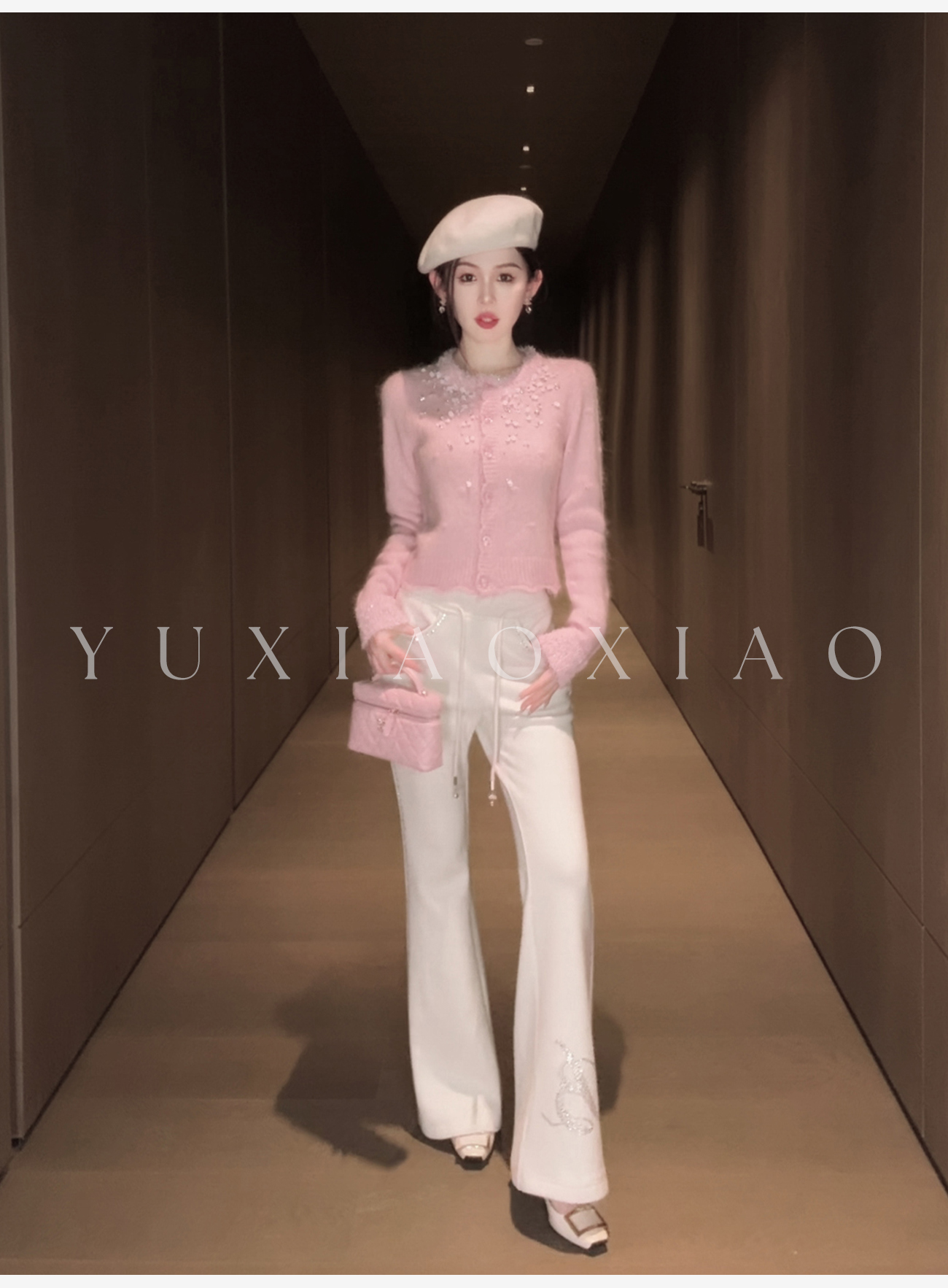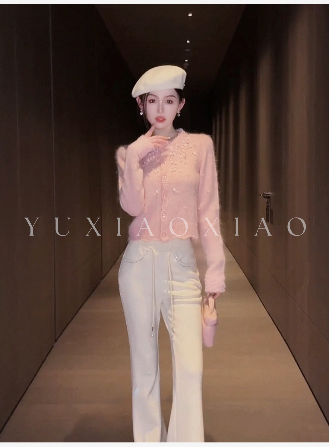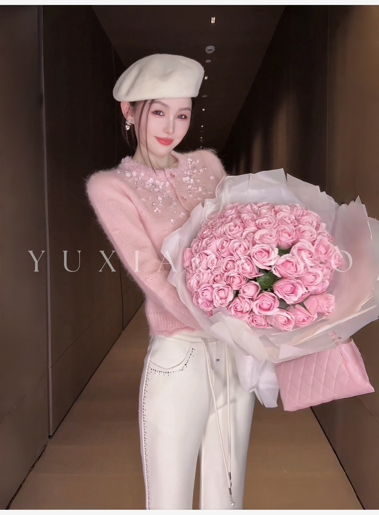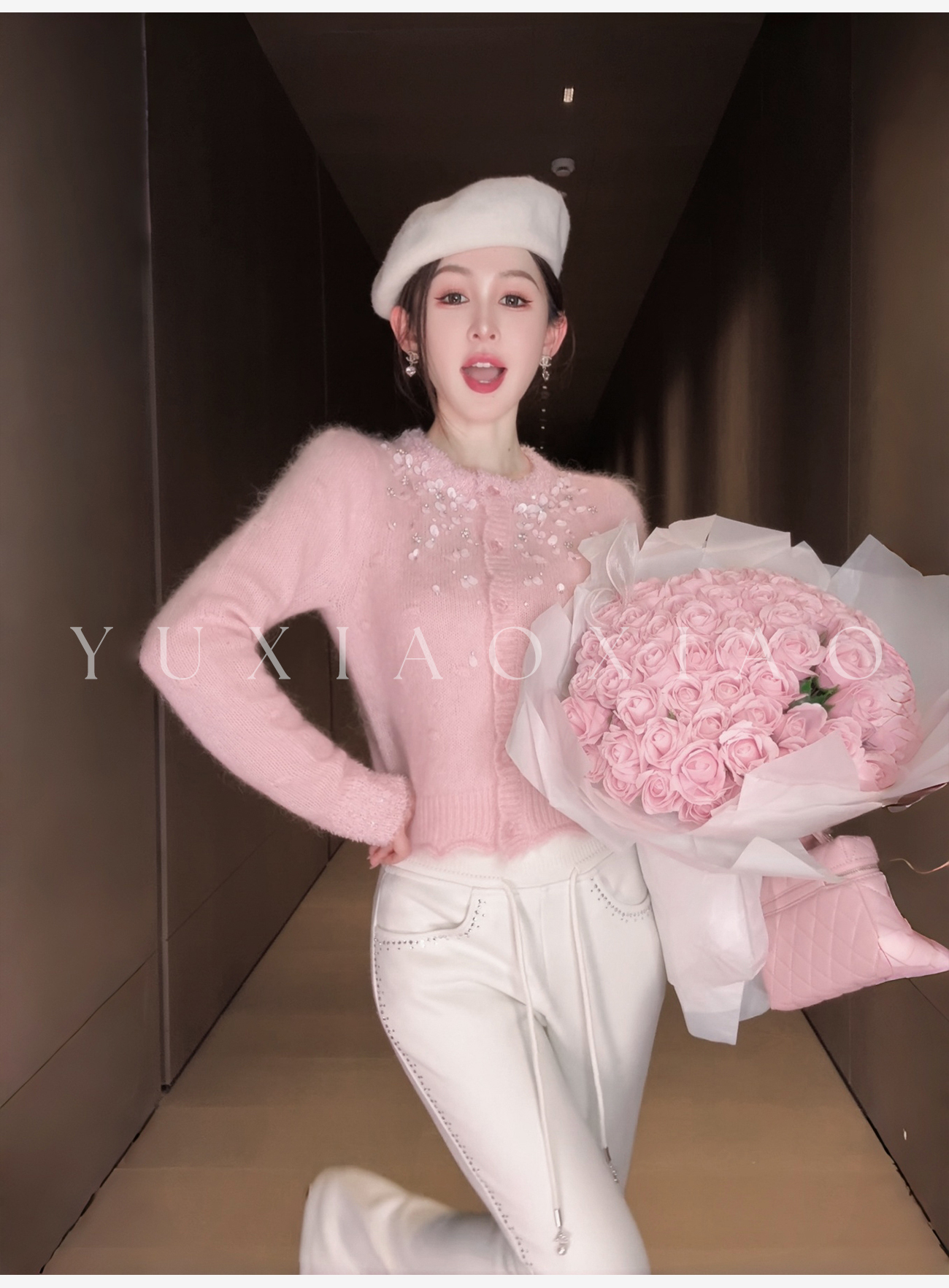 余潇潇【樱花降落】羊驼毛羊毛混纺珠片水钻立体花朵羊毛衫圆领开衫