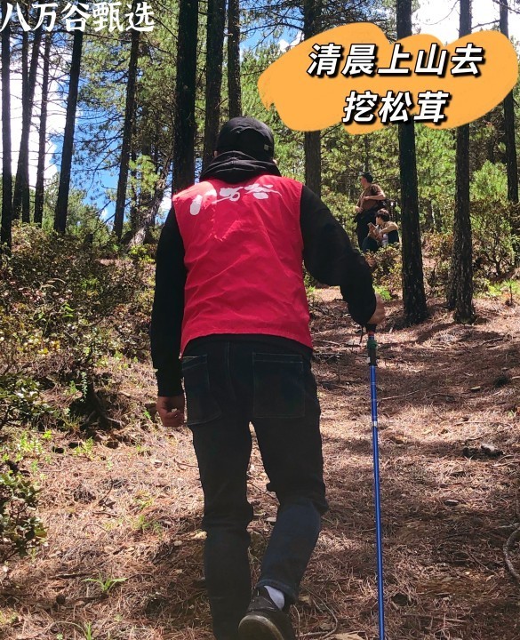 早上5点出发进山,徒步个小时左右的路程,才能到松茸生长的原始森林,用木棍不断掀树叶松枝寻找,有经验的藏民只要看冒出的,一点点头就能识别。