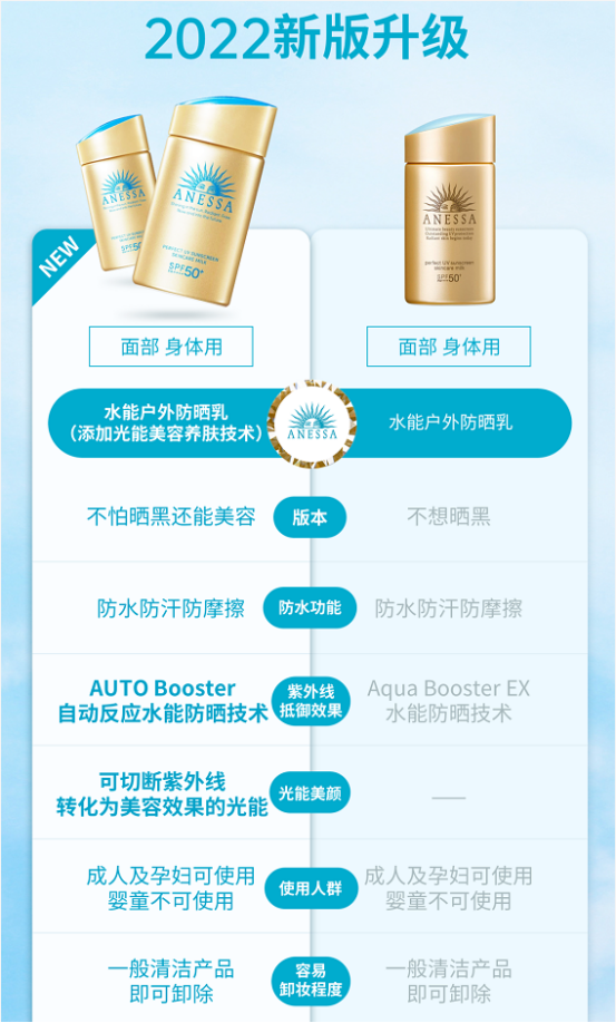 这一次的升级,据说,前版的安热沙有遇水遇汗强科技,这一次是“感应到空气湿度”就可以越湿越强。并且会升级加固产品防晒膜,让防晒层更加稳固。