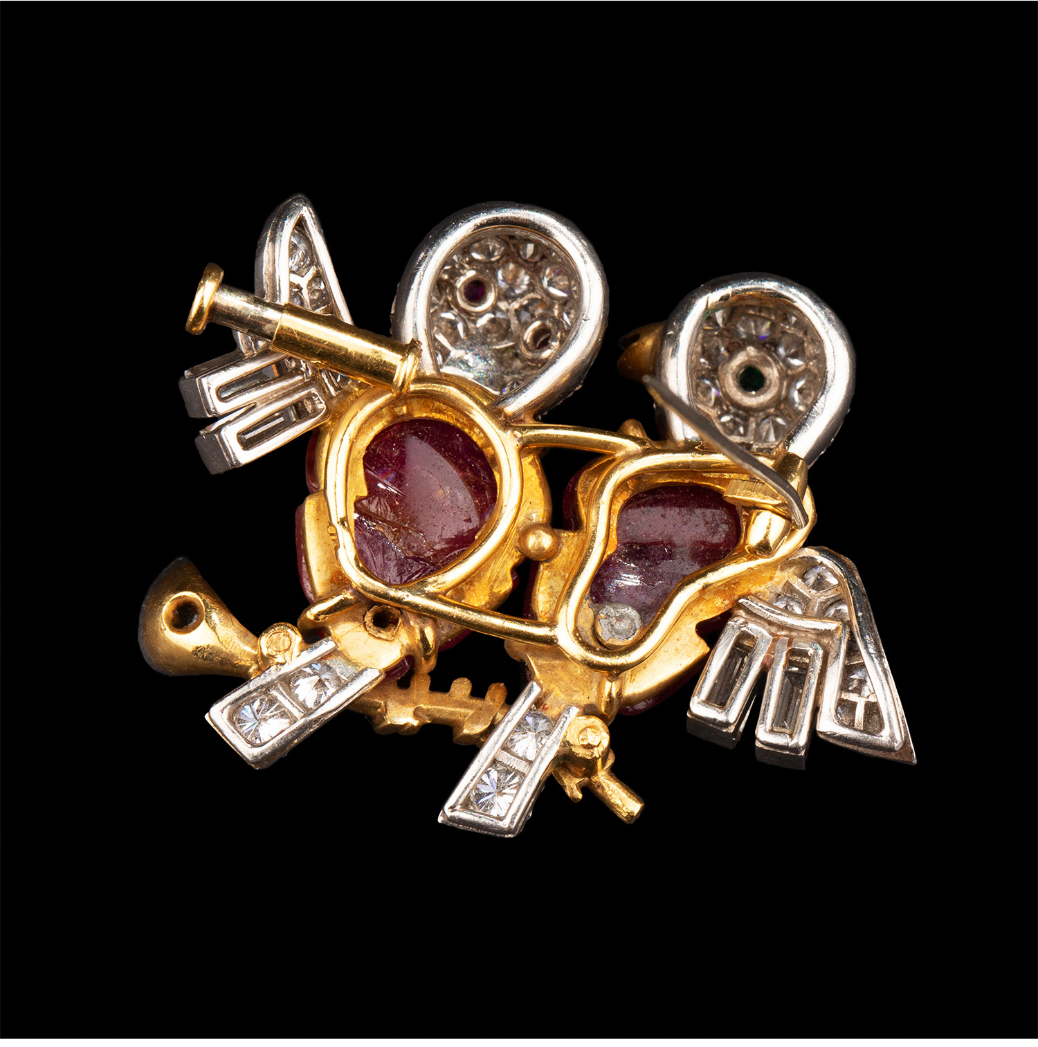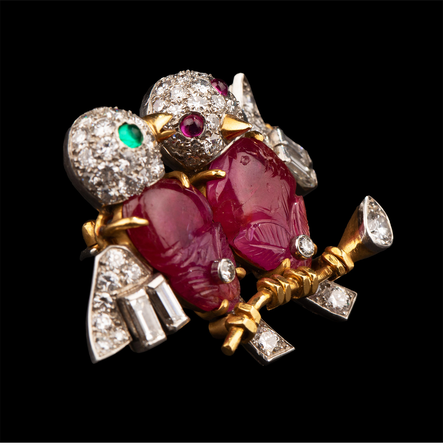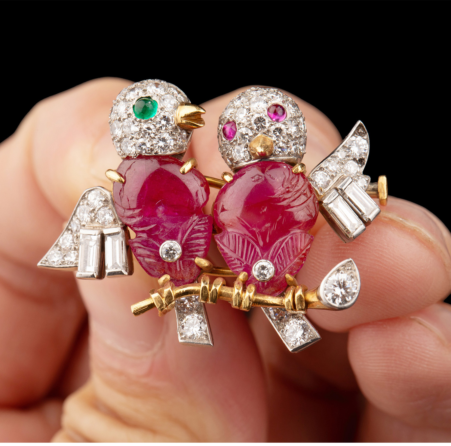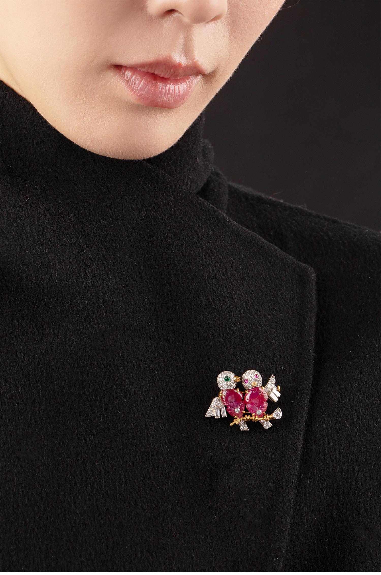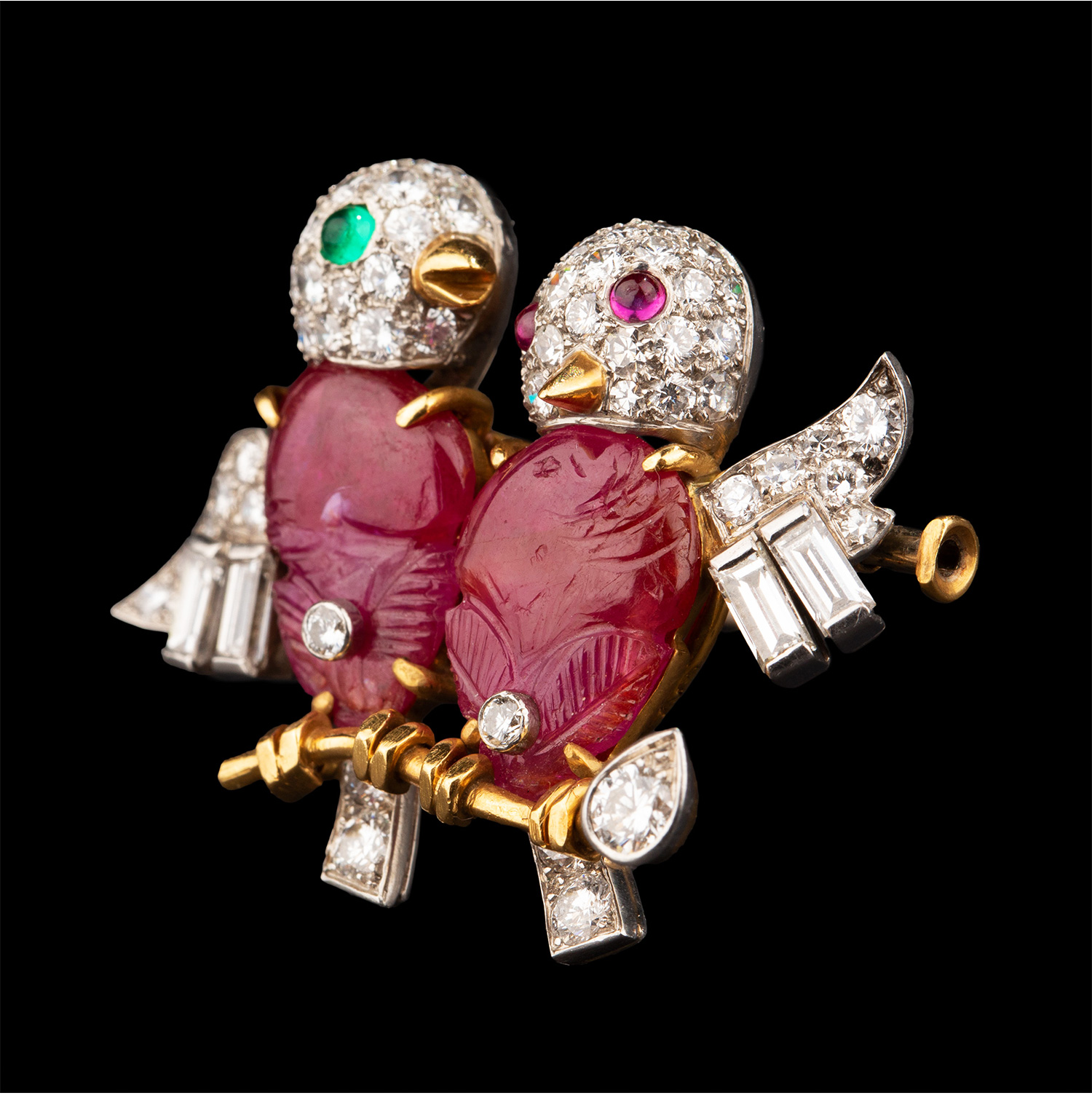 1950年代法国出品18k黄金铂金镶嵌钻石祖母绿及红宝石爱情鸟造型胸针