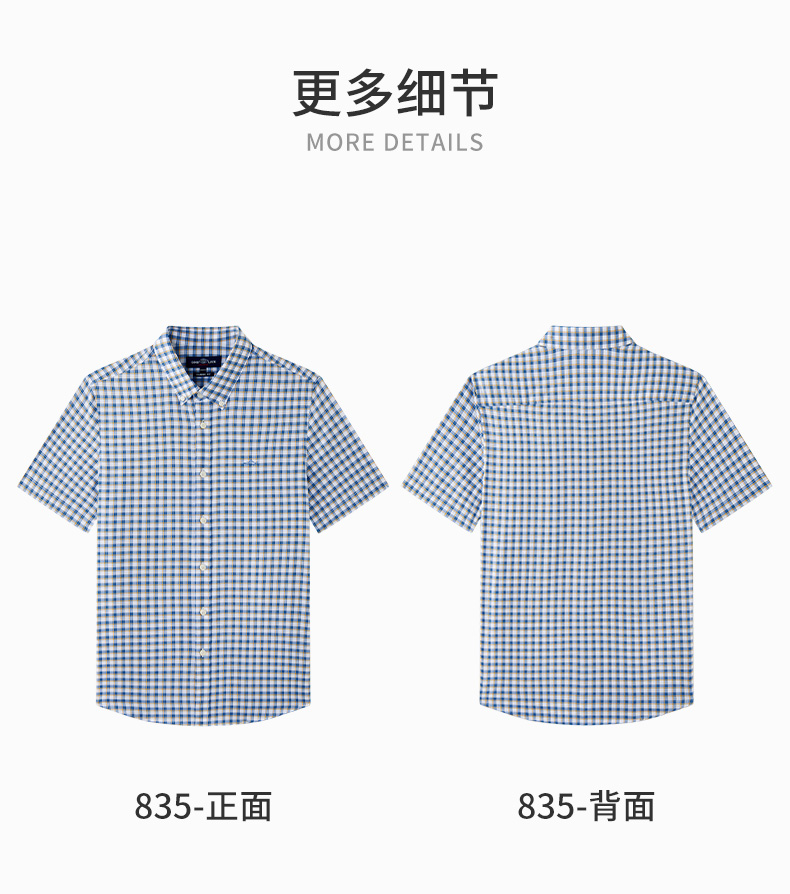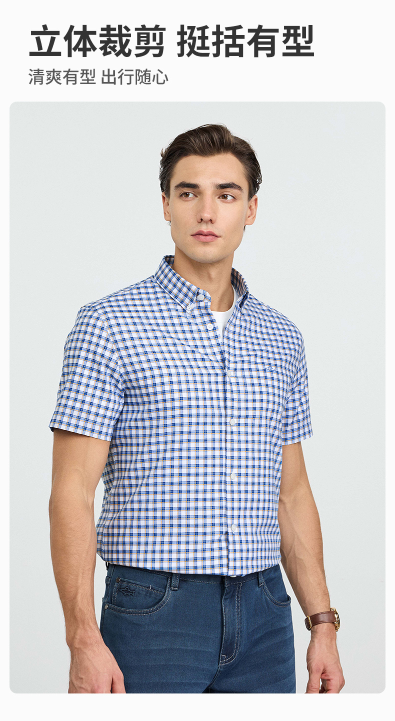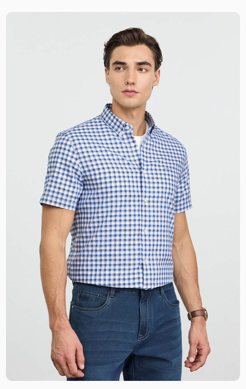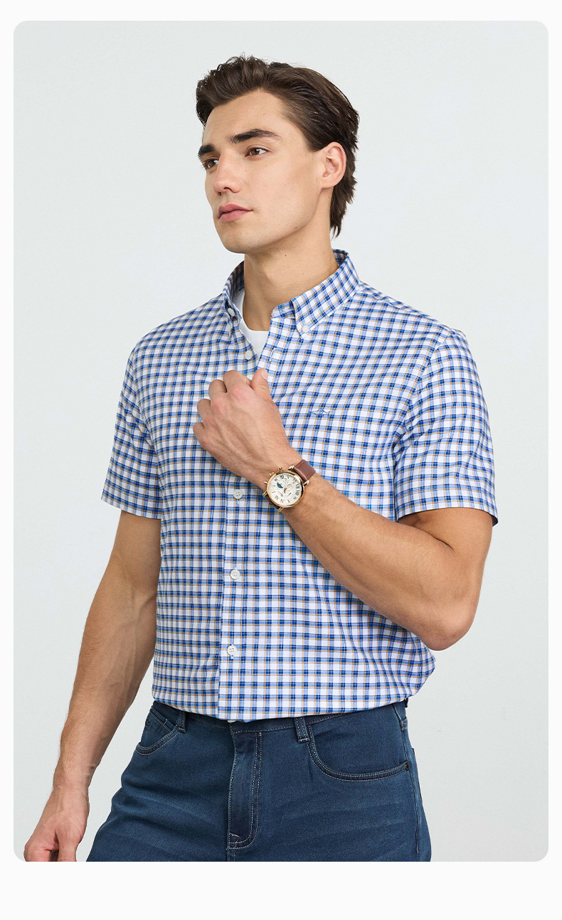 【纯棉】德鲨男装蓝色短袖格子衬衫2026夏新款休闲打底上衣男衬衣