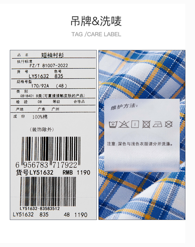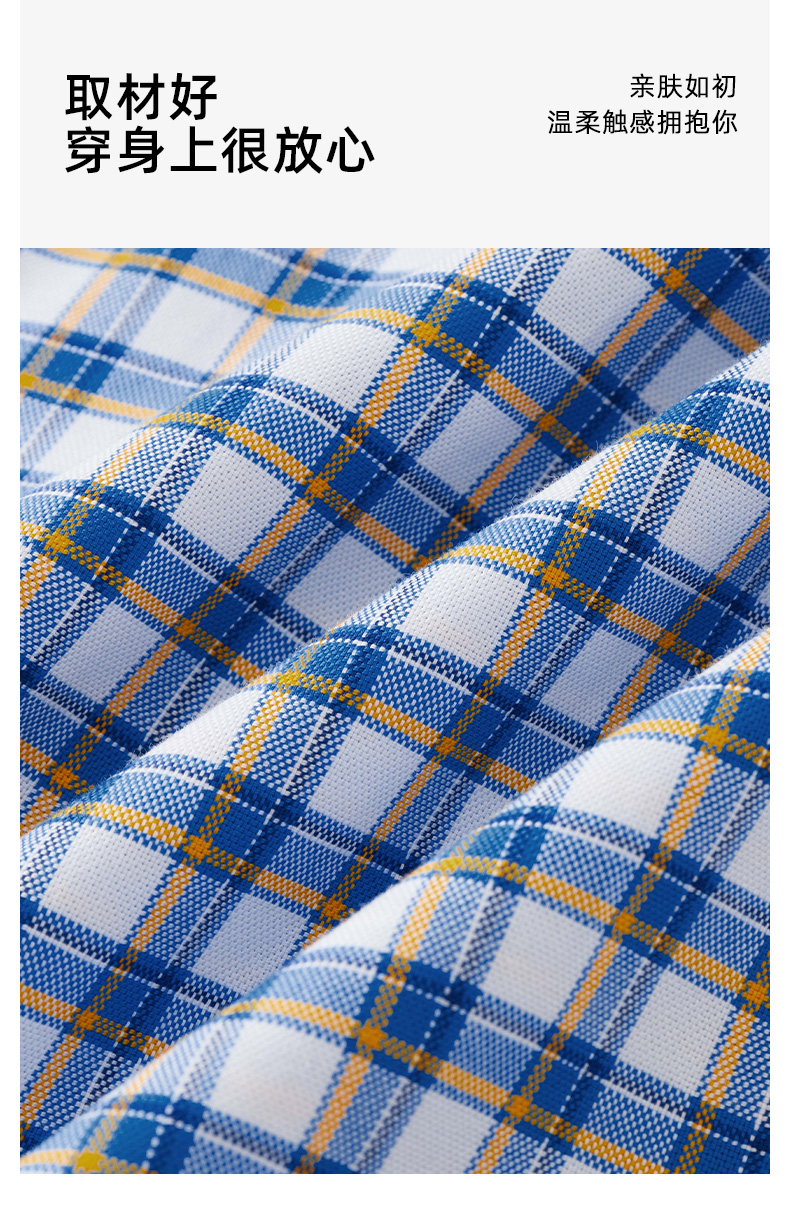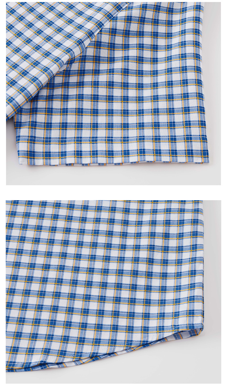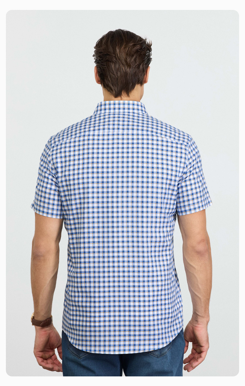 【纯棉】德鲨男装蓝色短袖格子衬衫2026夏新款休闲打底上衣男衬衣