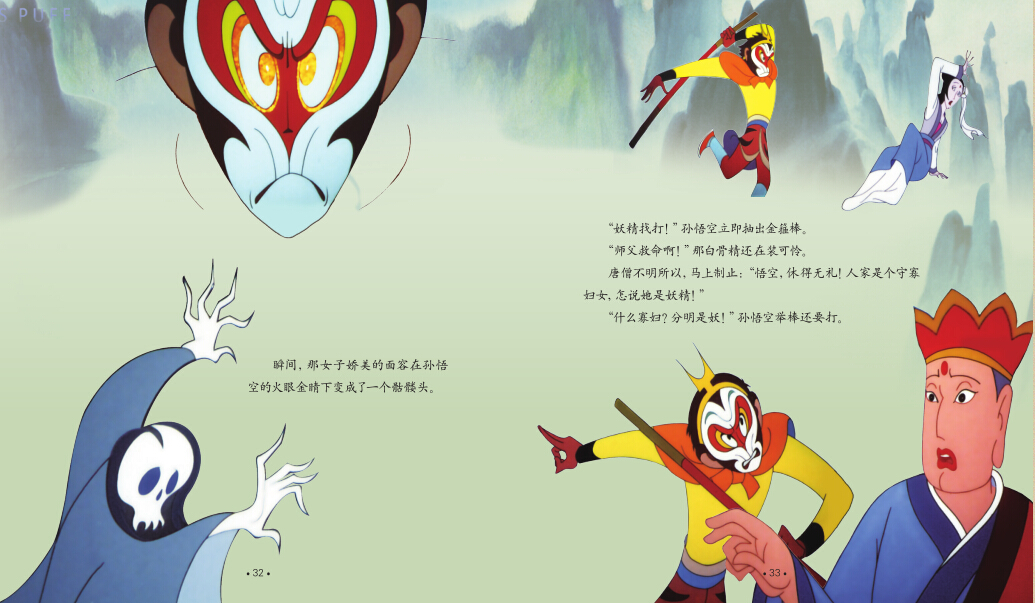 而洞里的白骨精,此时正在施展法术。一转眼,她变成了一副丑陋的骷髅;眨眼间,骷髅倏忽一变,又成了女子。