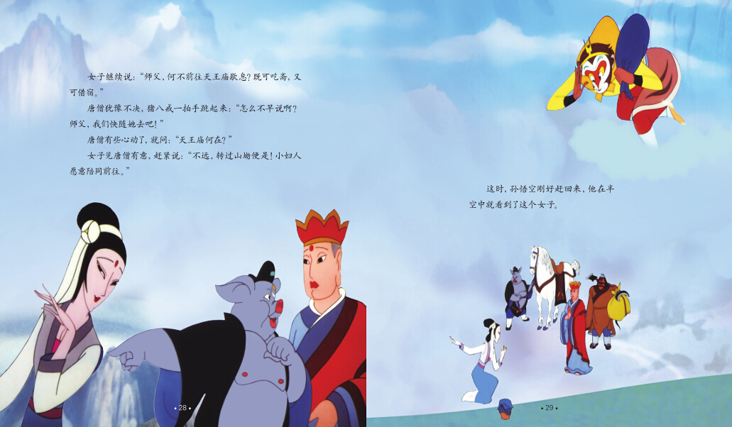 孙悟空笑着答应了一声“好”,一个筋斗跃上半空,随即又转身叮嘱说:“八戒、沙僧,保护好师父,千万小心,别走远了!”说完,一眨眼就不见了踪影。