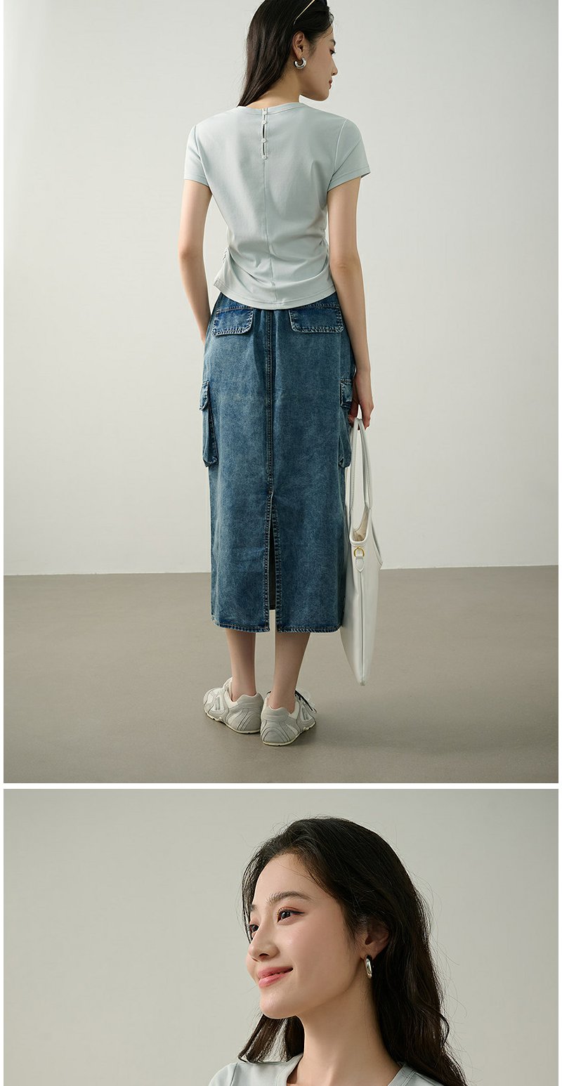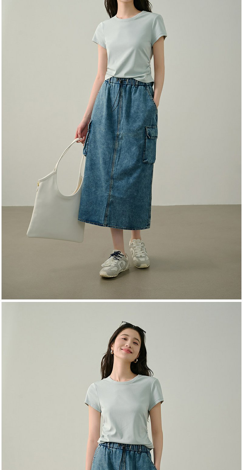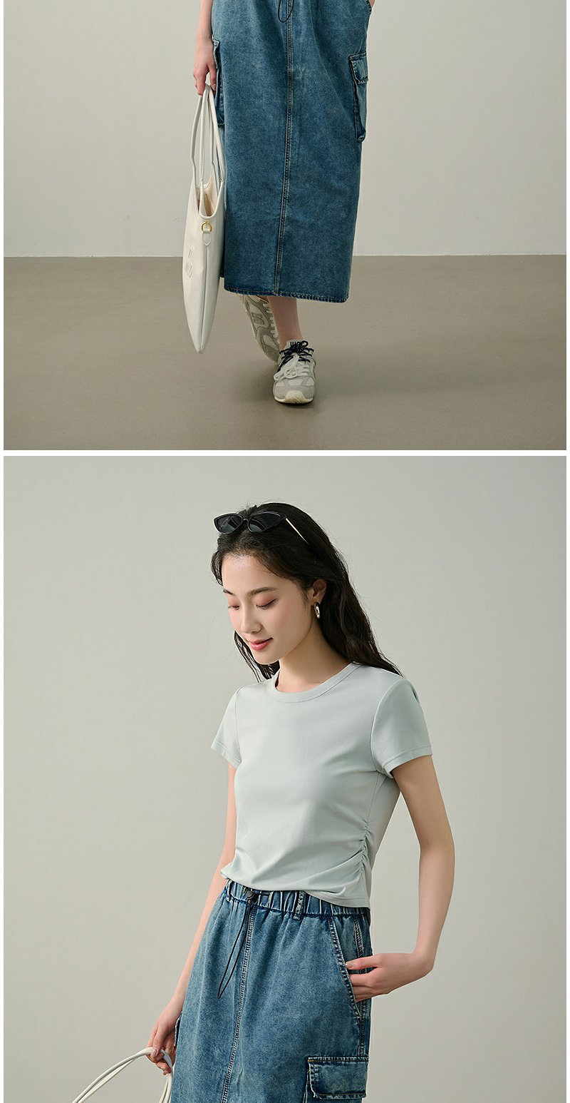 NEELLY纳俪商场同款夏季新款圆领正肩收腰短袖T恤女减龄修身上衣N25044T05501