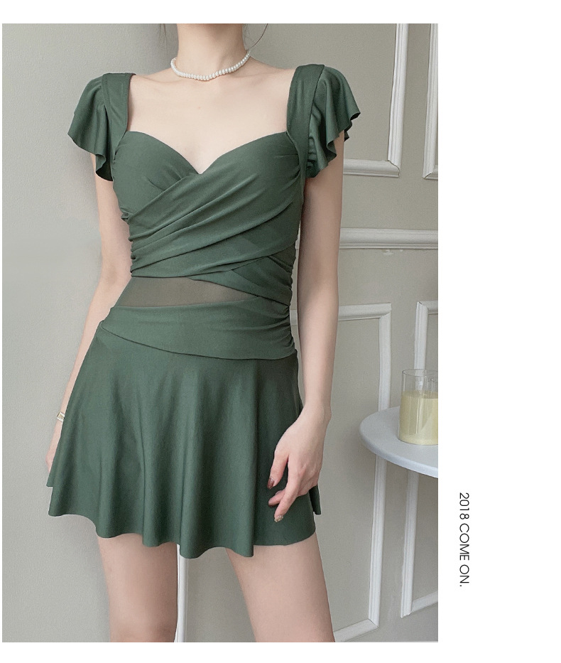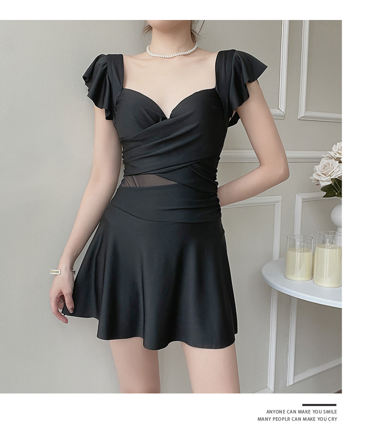 【法式设计,显瘦显高!】泳衣女款连体纯色法式泳衣 保守显瘦钢托文胸连衣裙式泳衣温泉-QQ
