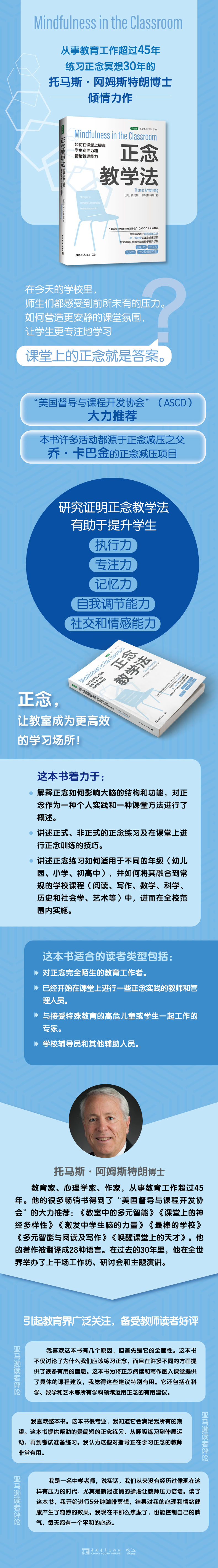 ◆这是一本通过正念教学法来提高学生专注力和情绪管理能力的教师用书。在今天的学校里,师生们都感受到靠前的压力。我们如何才能营造更安静的课堂氛围,让学生可以更专注地进行学习?课堂上的正念就是答案。◆“美国督导与课程开发协会”(ASCD)大力推荐,许多活动源于正念减压之父乔·卡巴金的正念减压项目。◆研究证明正念教学法有助于提升学生执行力、专注力、记忆力、自我调节能力、情绪管理能力和情商。正念,让教室成为更高效的学习场所!◆作者托马斯·阿姆斯特朗博士,从事教育工作超过45年,练习正念冥想30年。他撰写的很多书是“美国督导与课程开发协会”大力推荐的:《教室中的多元智能》《激发中学生脑的力量》《最棒的学校》《唤醒课堂上的天才》等。他的著作被翻译成28种语言。