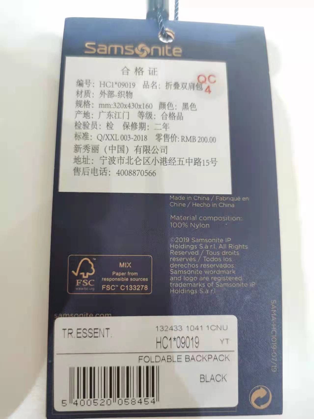 新秀丽可折叠双肩包收纳袋HC1*09019