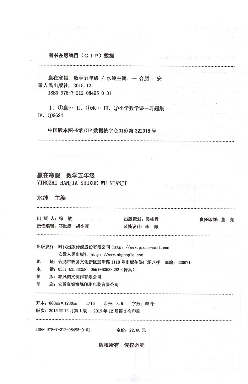 2020新版上海小学寒假作业 数学 5年级/五年级 赢在寒假 小学生寒假作业本练习册 基础巩固拓展提升新课预习 安徽人民出版社
