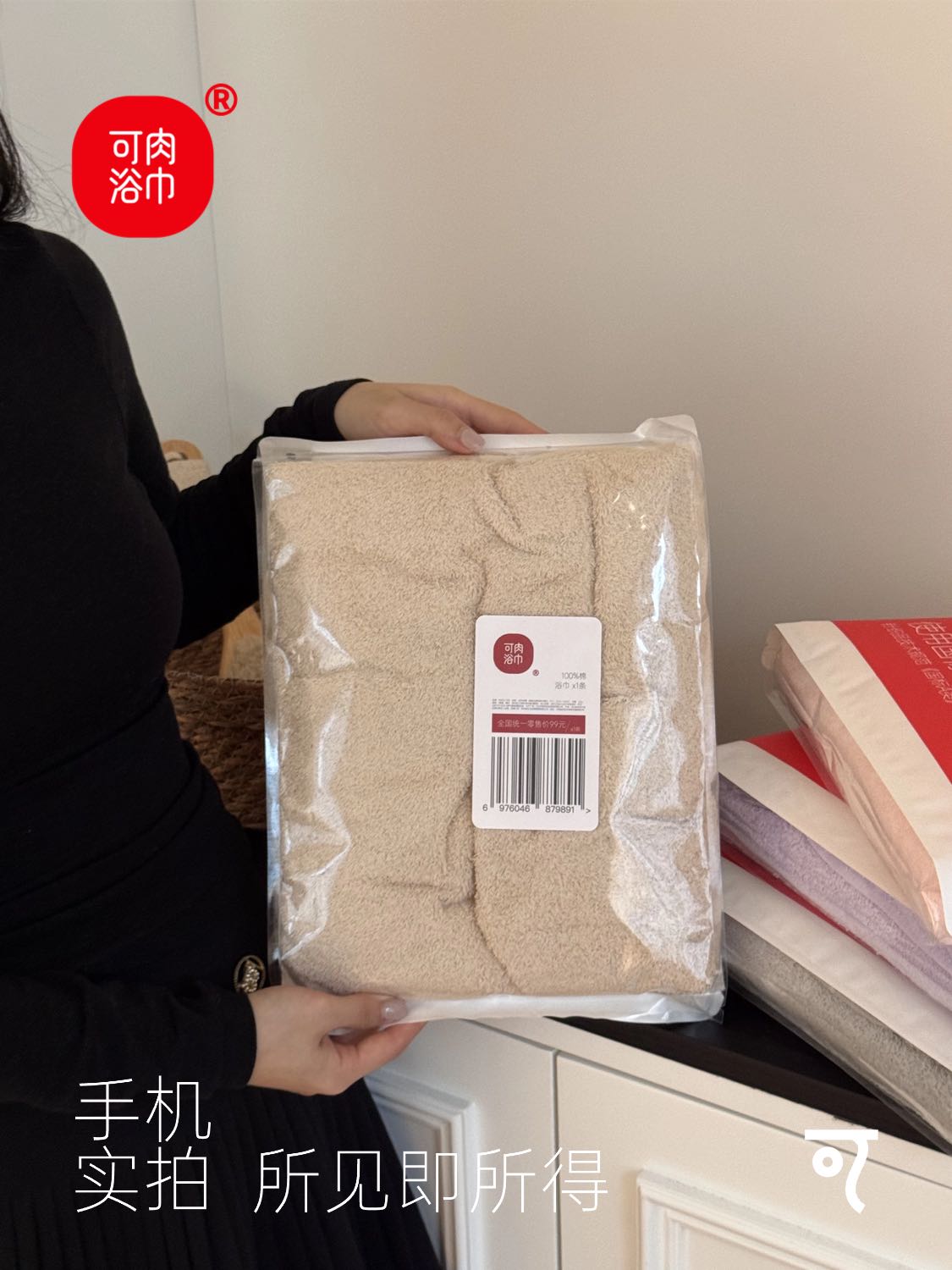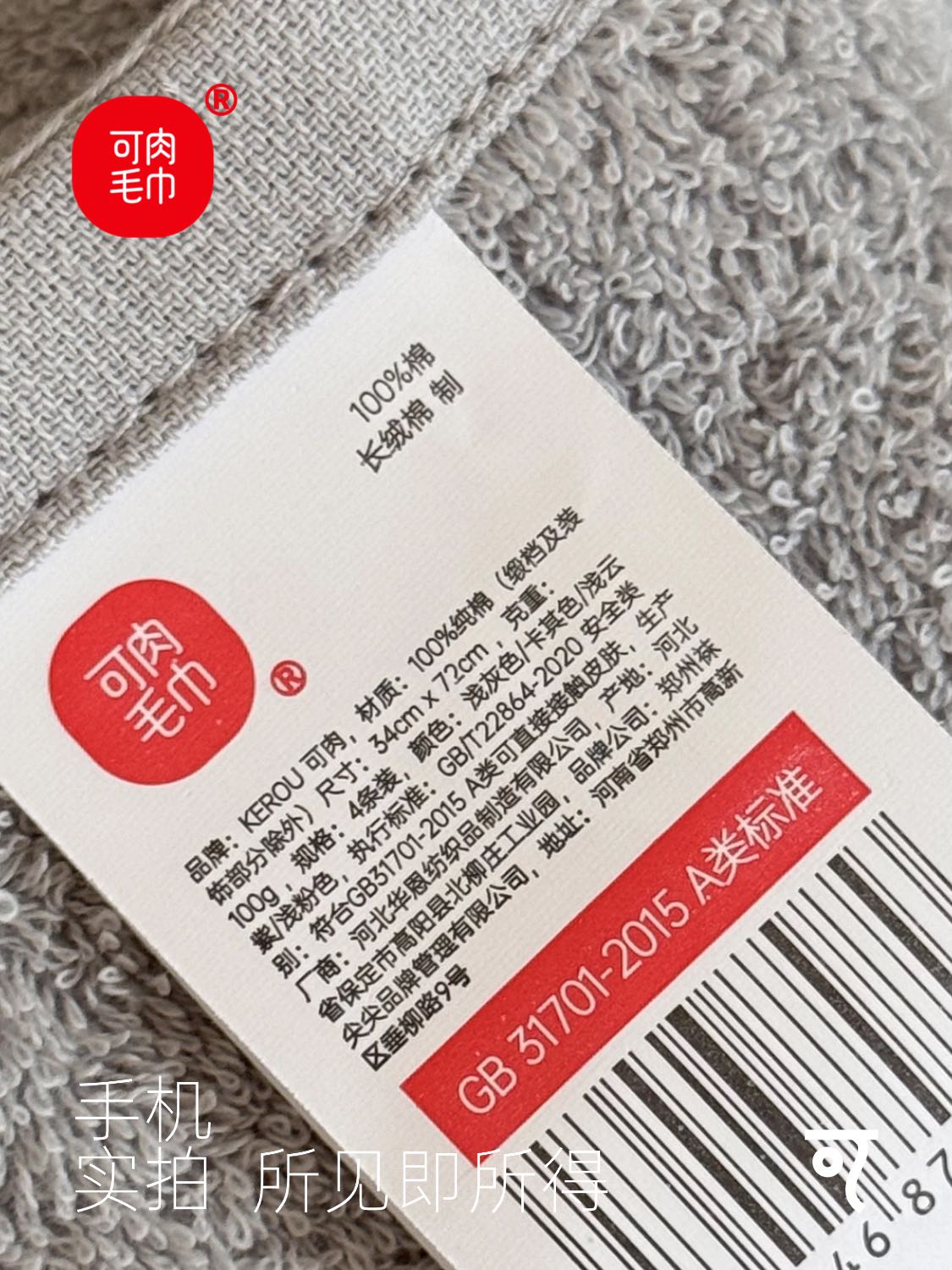 可肉毛巾,用的是100%长绒棉材质,不仅符合GB 31701-2015 A类安全标准(直接接触皮肤超安心),尺寸34cm×72cm、单条100g,手感软和还耐用。包装是4条装,颜色有浅灰、卡其、浅云这些柔和色系,手机实拍标签,品质明明白白~