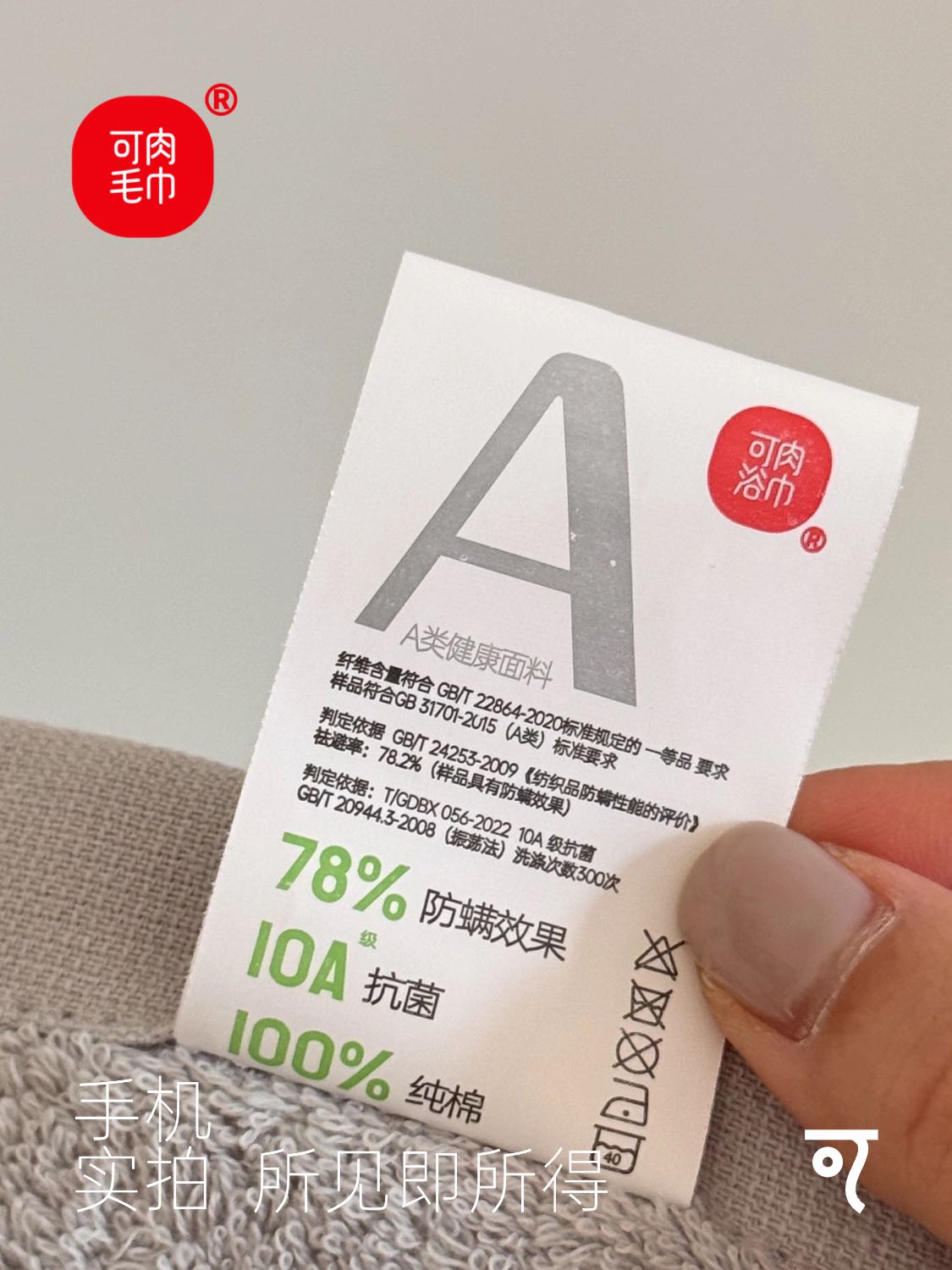 “可肉浴巾,实打实的A类健康面料(国标一等品),78%防螨+10A级抗菌,还是100%纯棉材质,洗300次性能都在线,手机实拍的标签,品质看得见~”