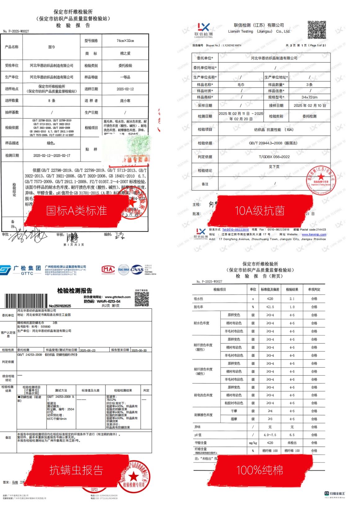 这是可肉毛巾/浴巾的权威检测报告合集,直接把“硬实力”摆上台面: