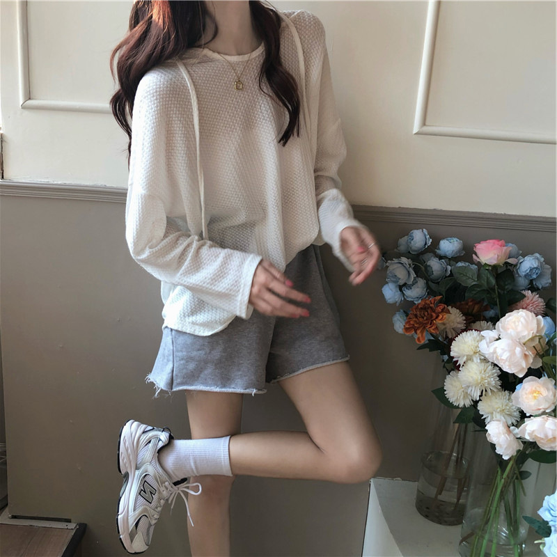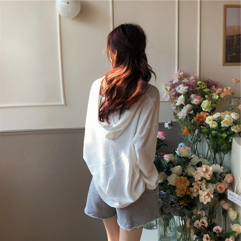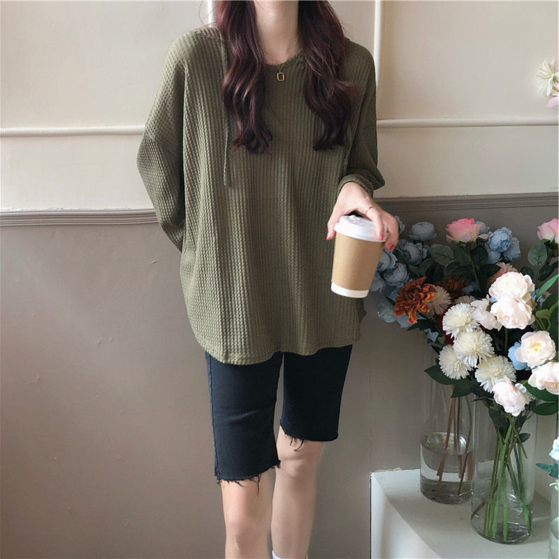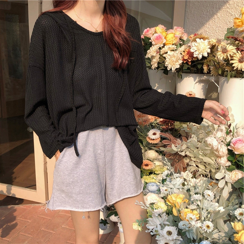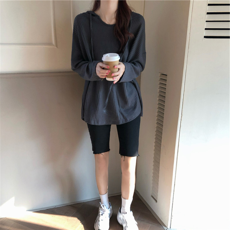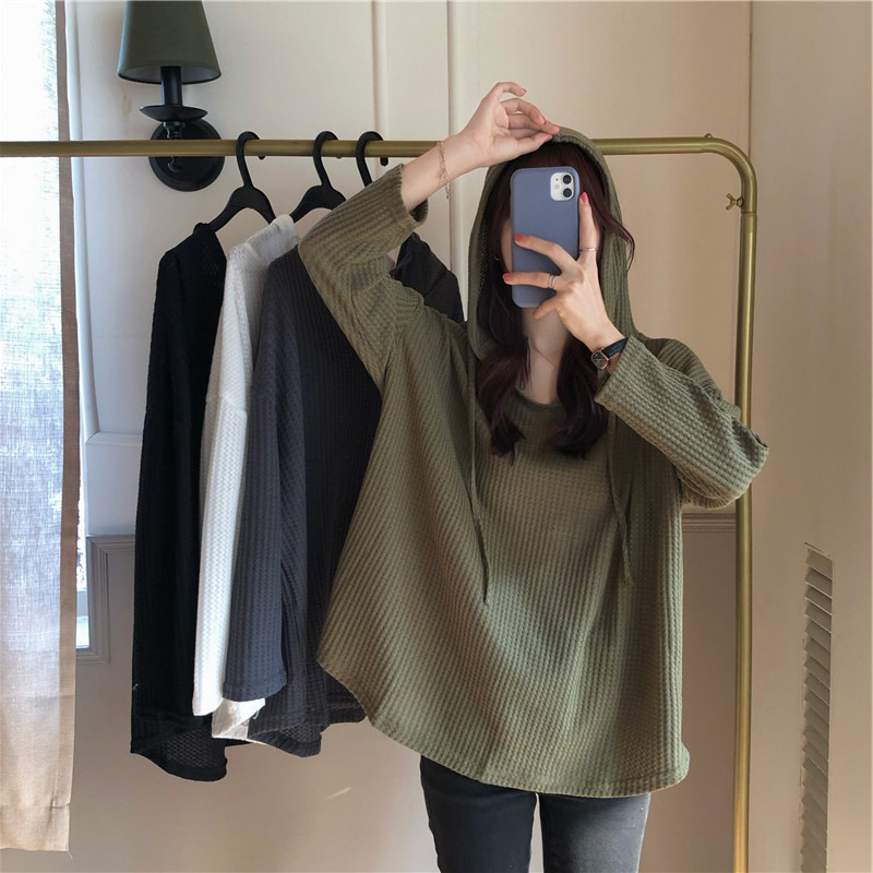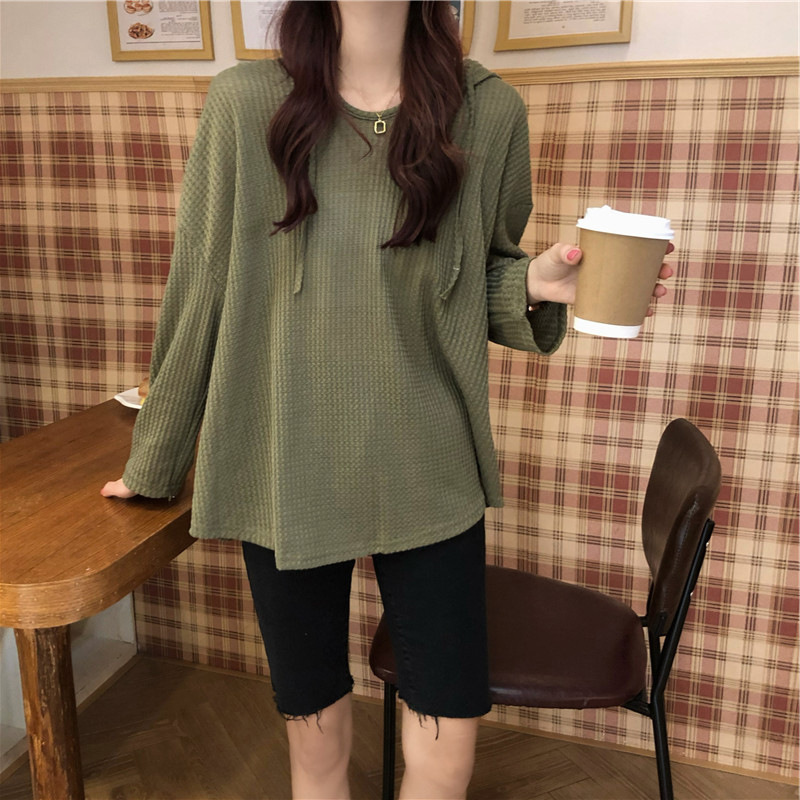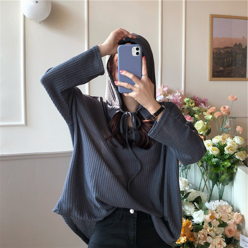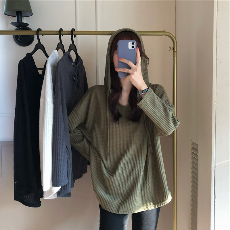 【洋气薄款宽松连帽T恤衫】春秋季 嘻哈风华夫格纯色女生长袖上衣服