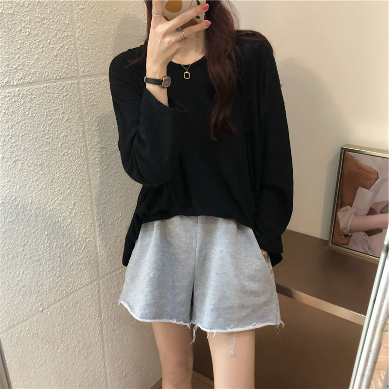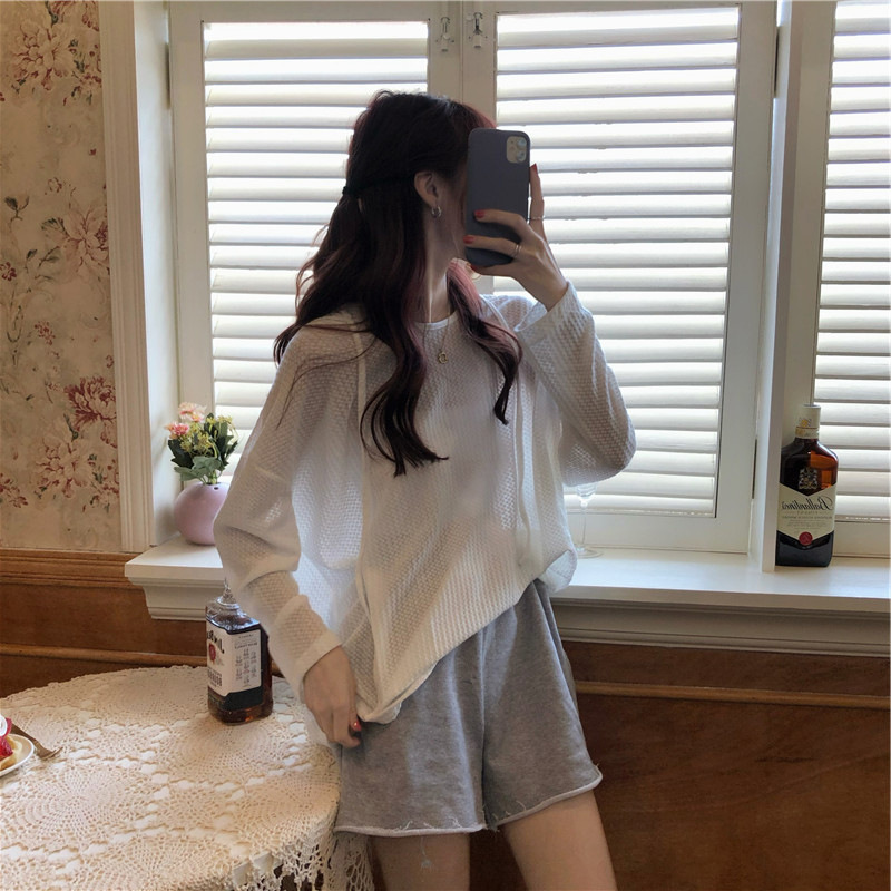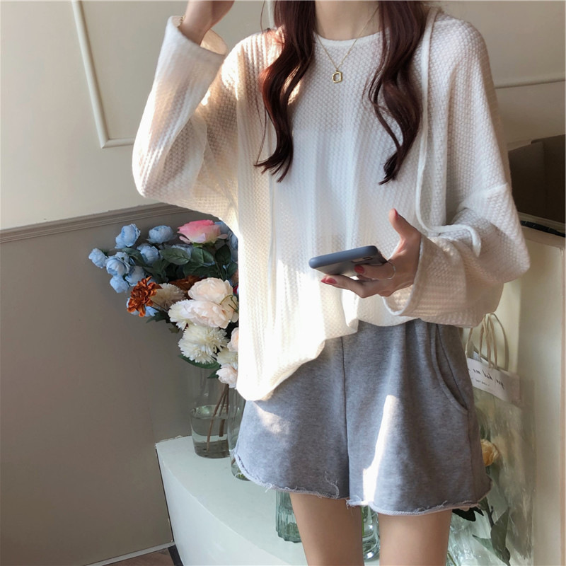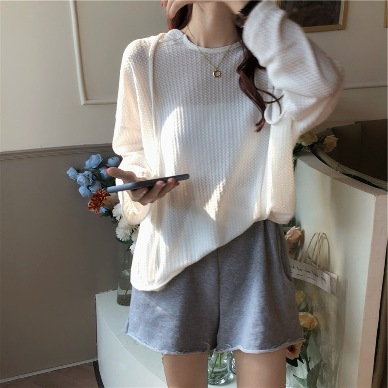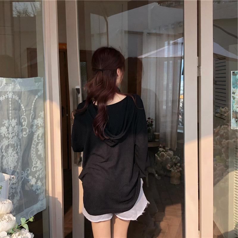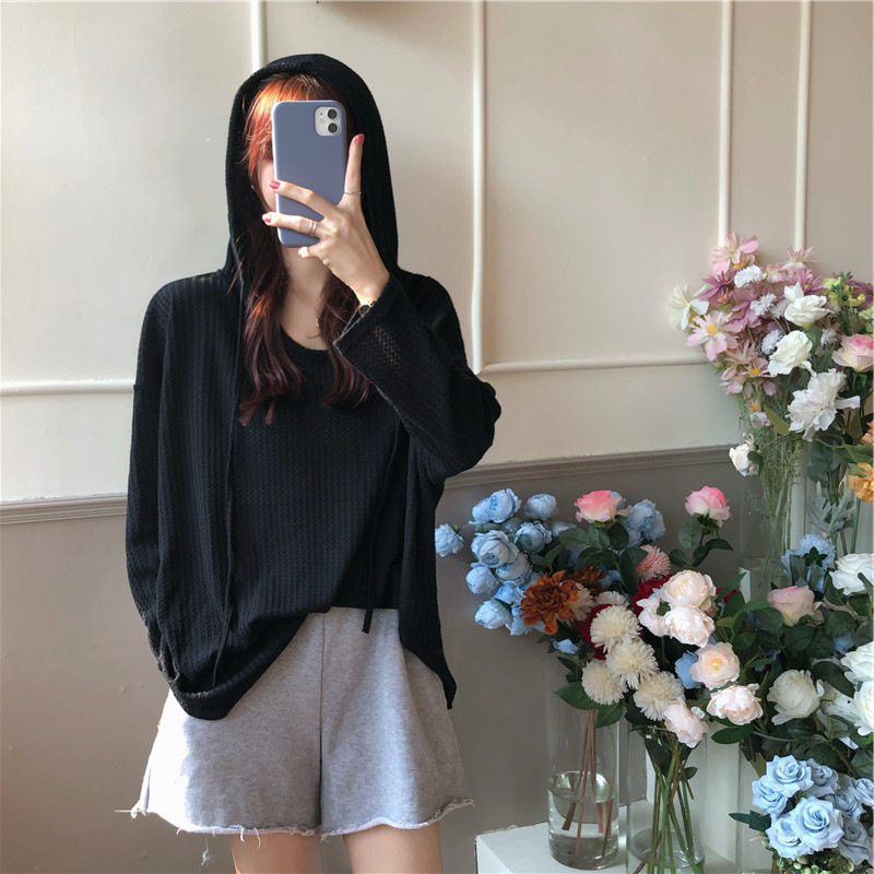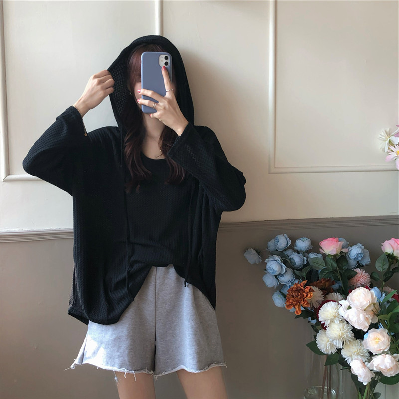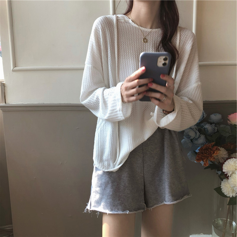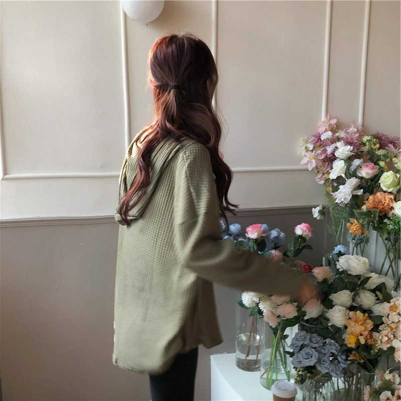 【洋气薄款宽松连帽T恤衫】春秋季 嘻哈风华夫格纯色女生长袖上衣服