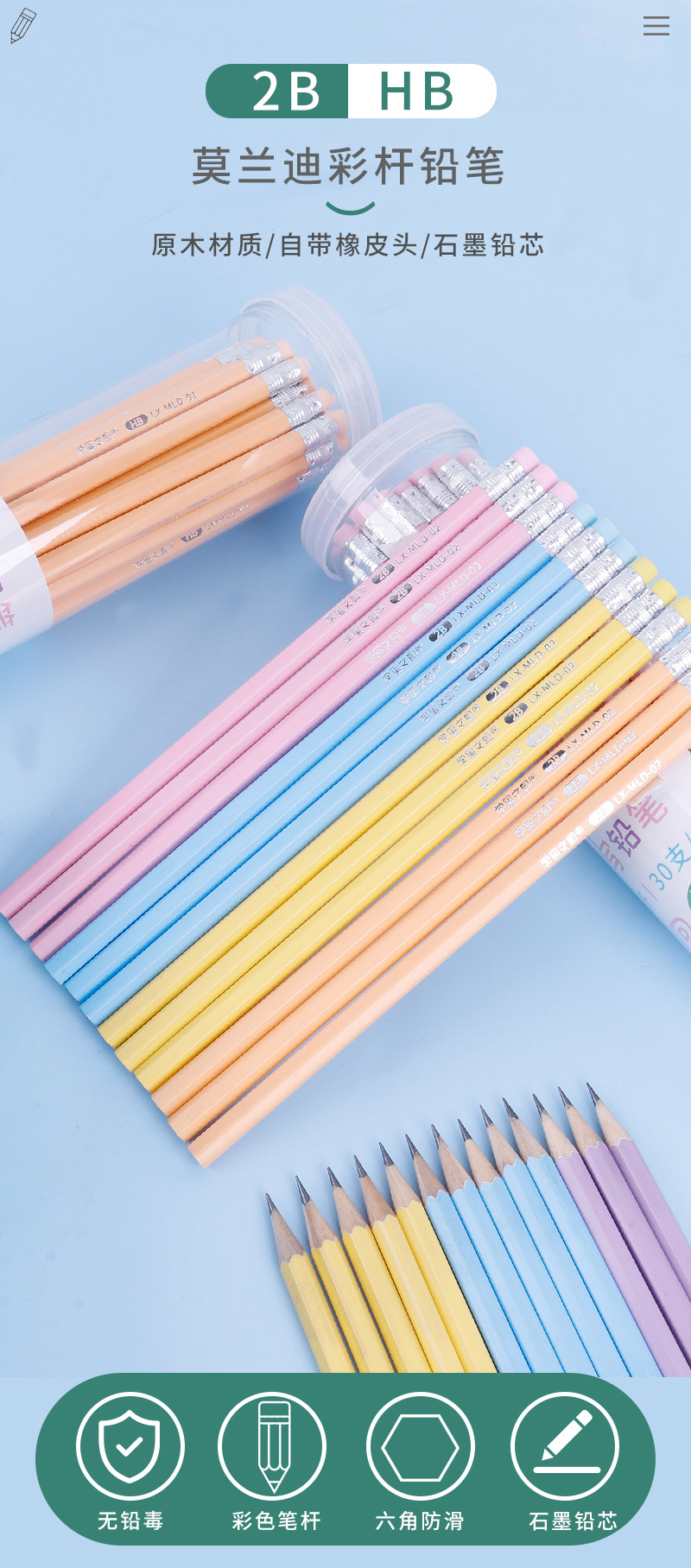 【30支水果色铅笔,买一送一】水果色马克龙彩色带橡皮头2BHB铅笔