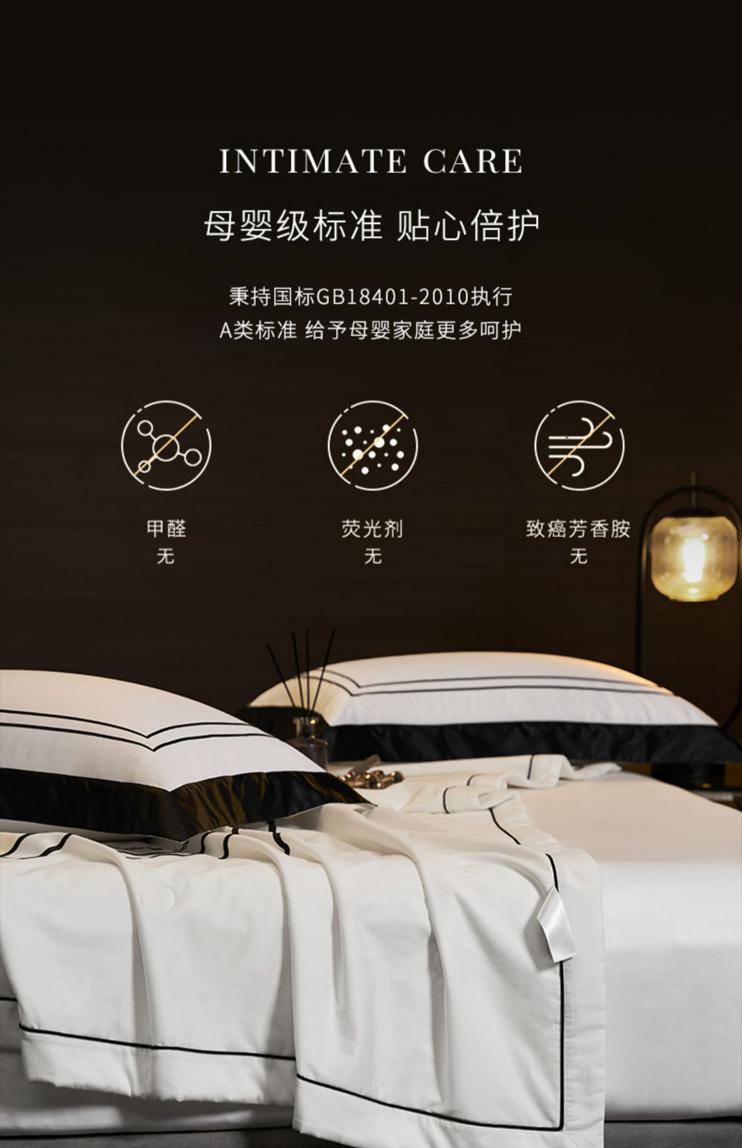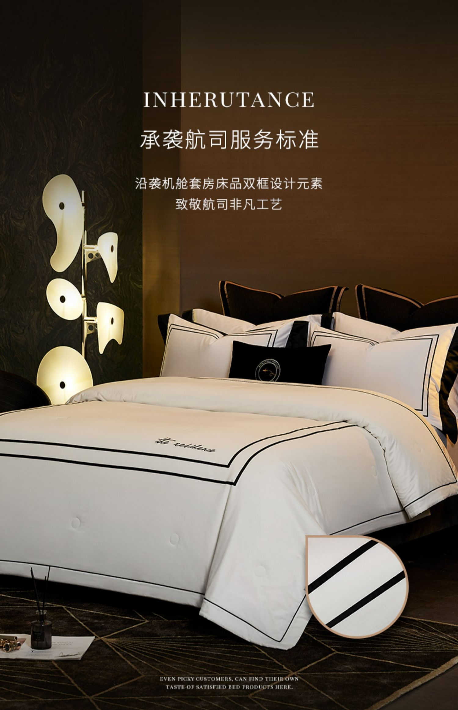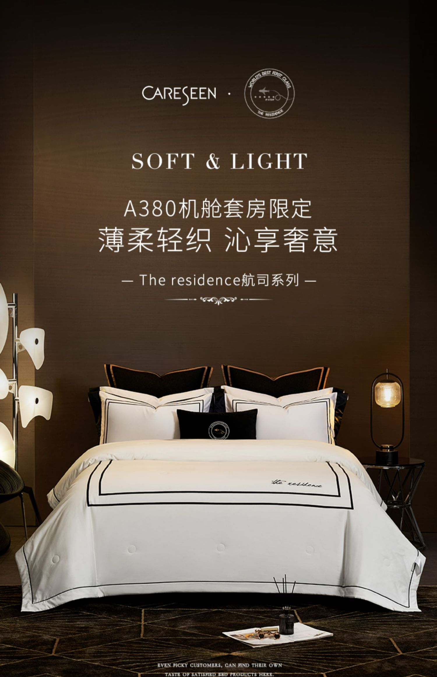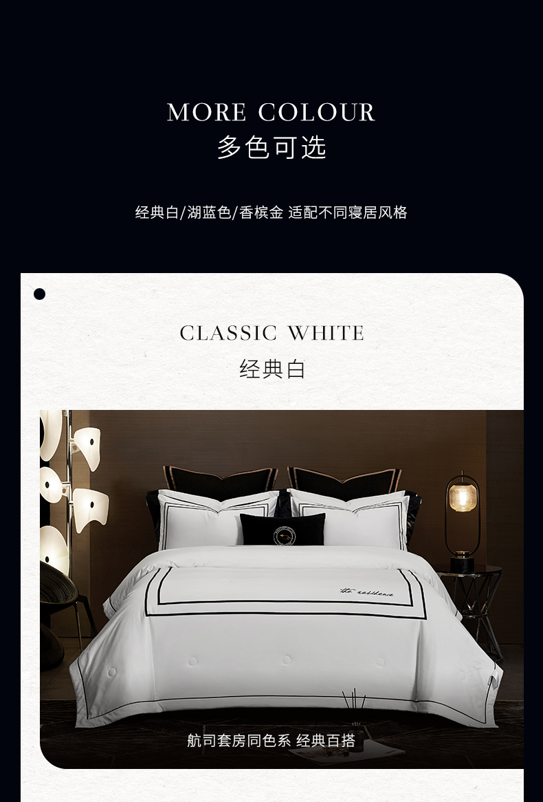 源自五星级酒店的奢华家纺品牌,康乃馨首次提出打造“酒店+家纺”的全新概念,将更为严格的五星级酒店纺织品品质标准与家纺相结合,完美诠释“酒店品质家纺”的舒适感受与奢华品味。