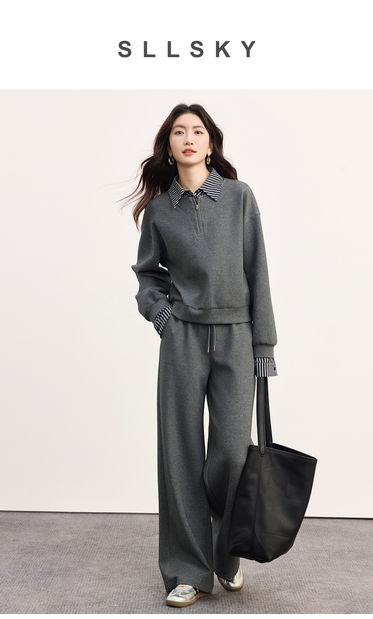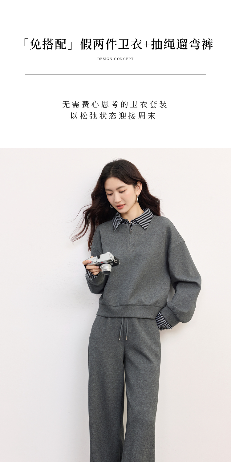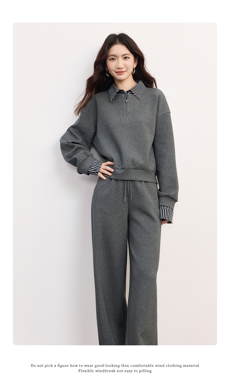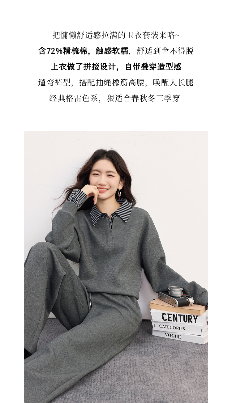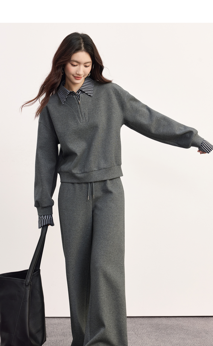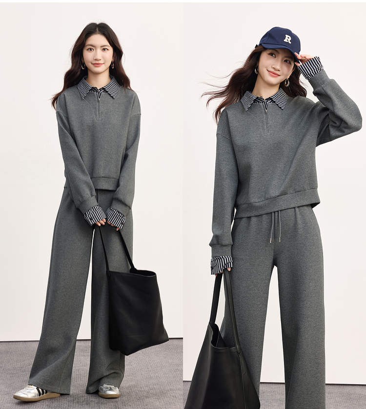 【09/17新品】熙世界灰色运动休闲卫衣套装女秋季新款条纹翻领上衣阔腿裤两件套