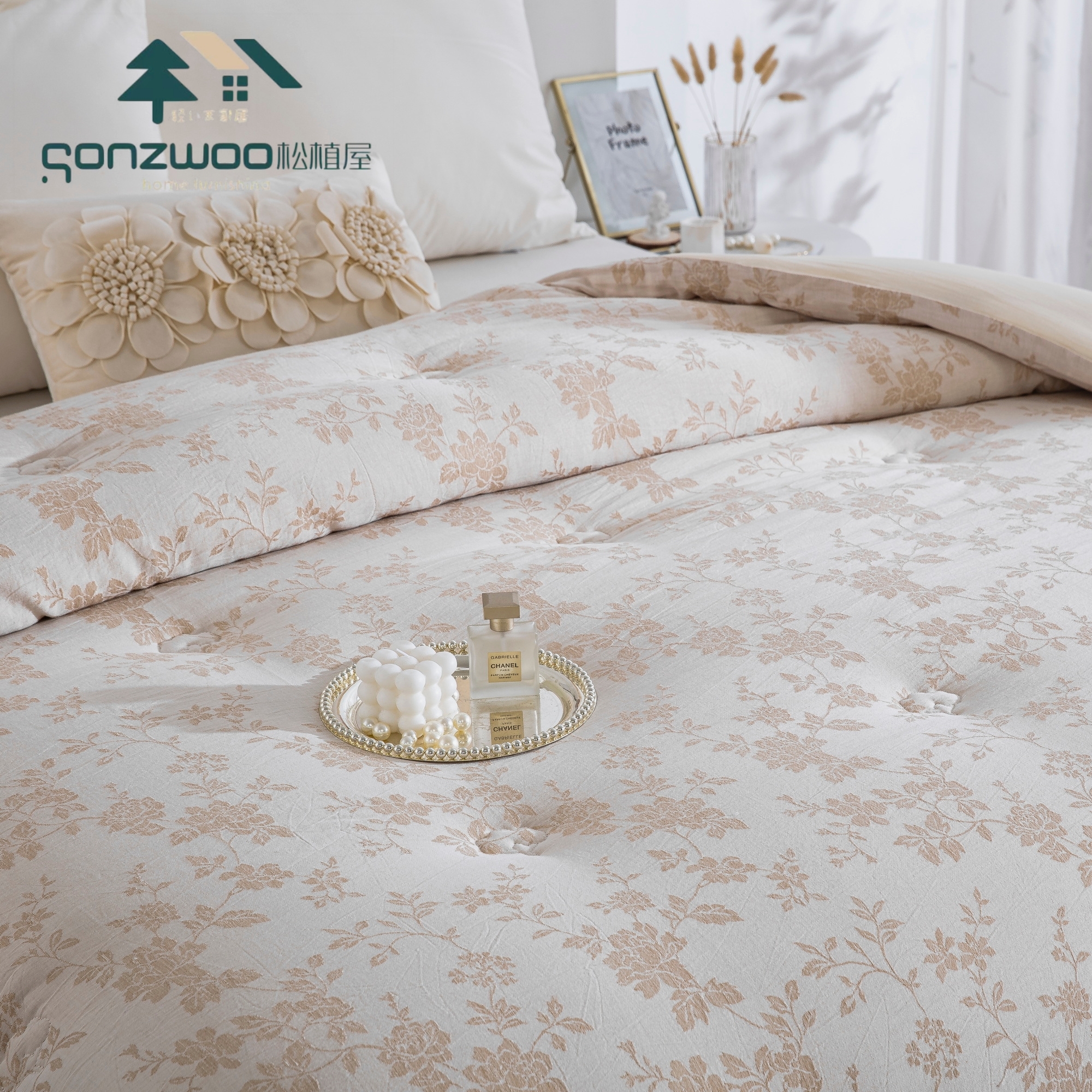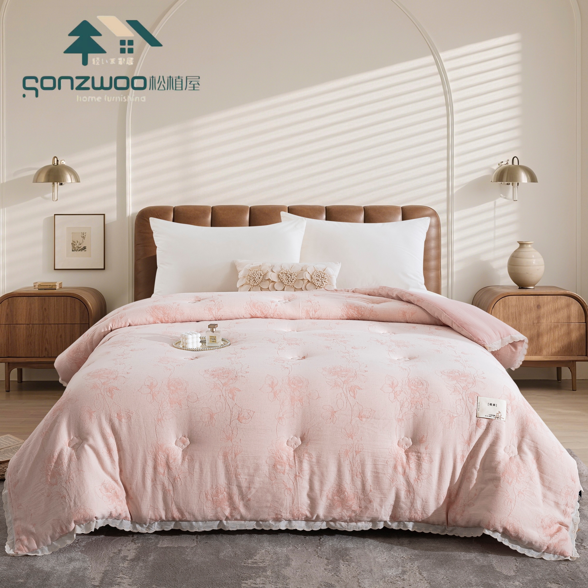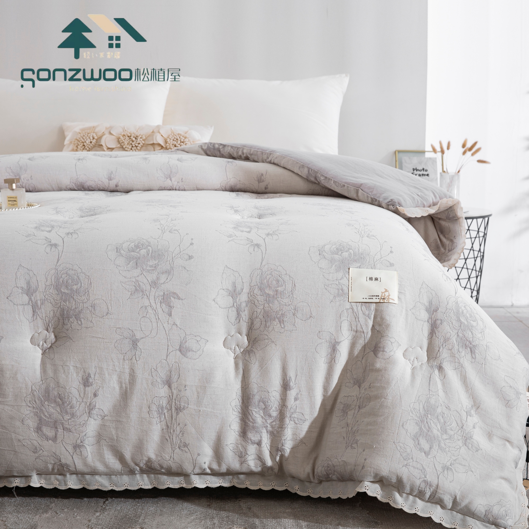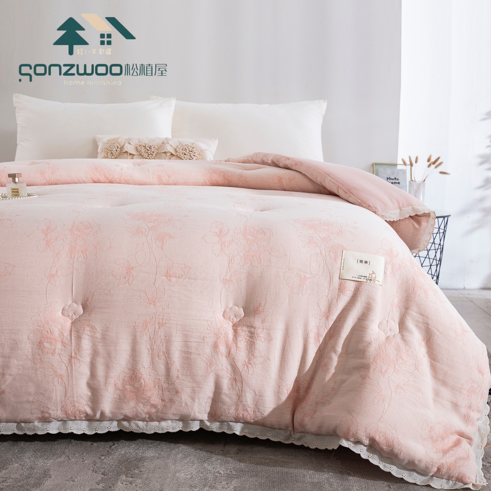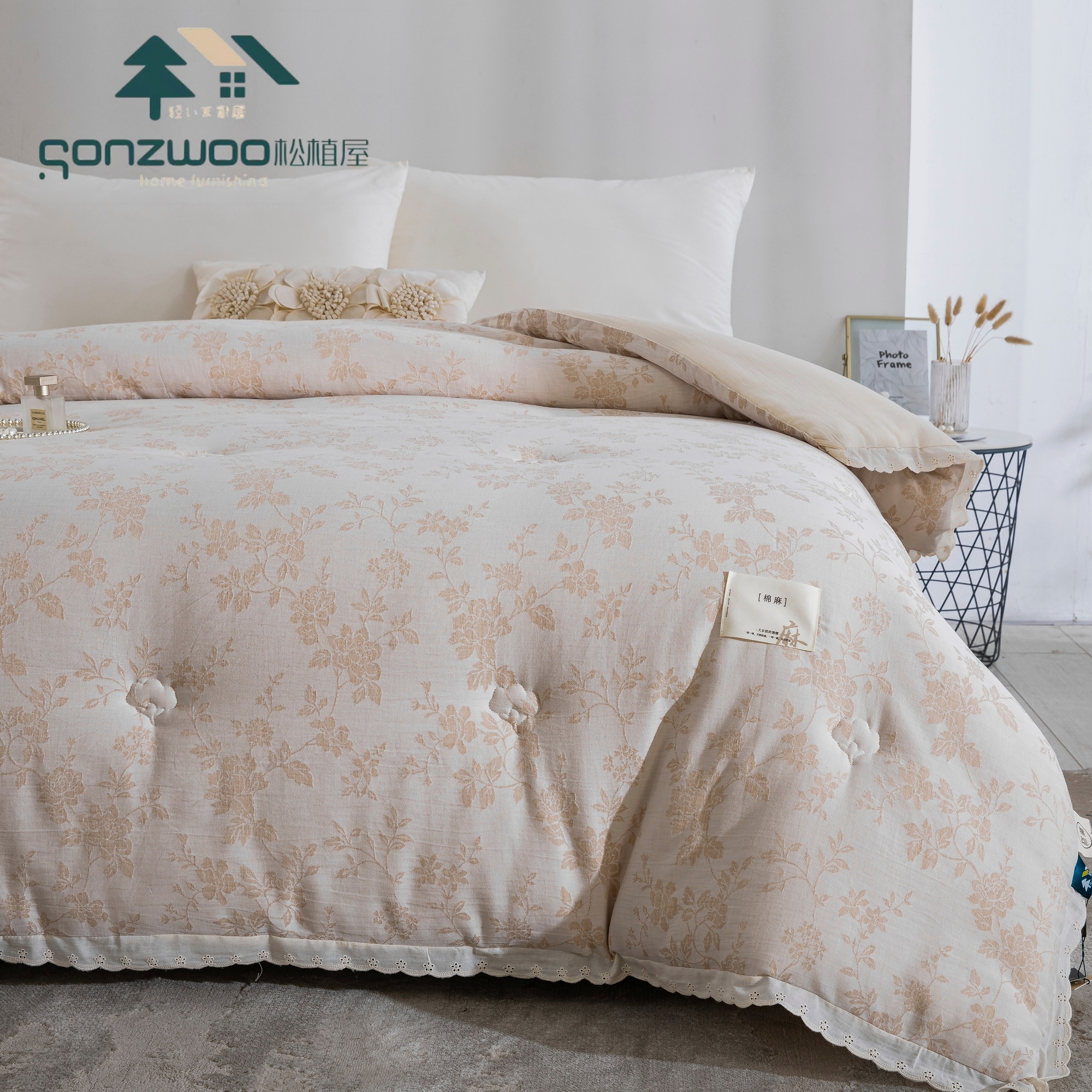 天然植物 色织提花纹理,搭配蕾丝花边,为卧室注入自然美学,在麻与棉的交织中,找回睡眠的本真呼吸。