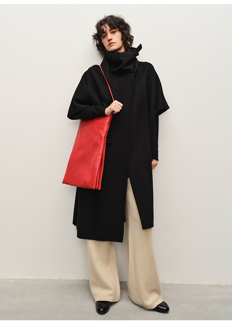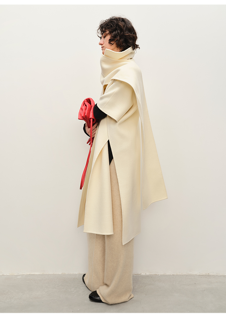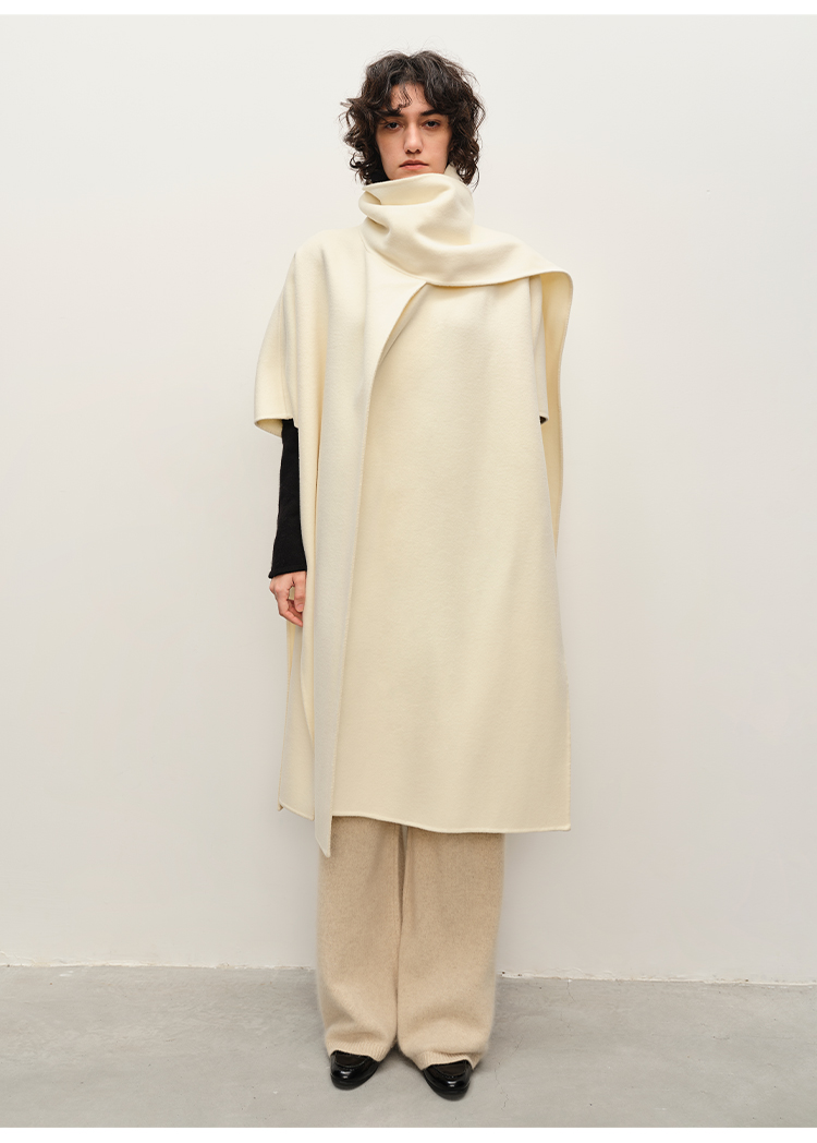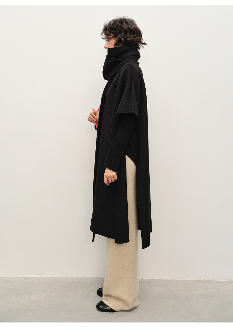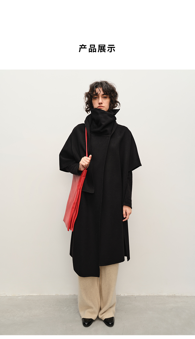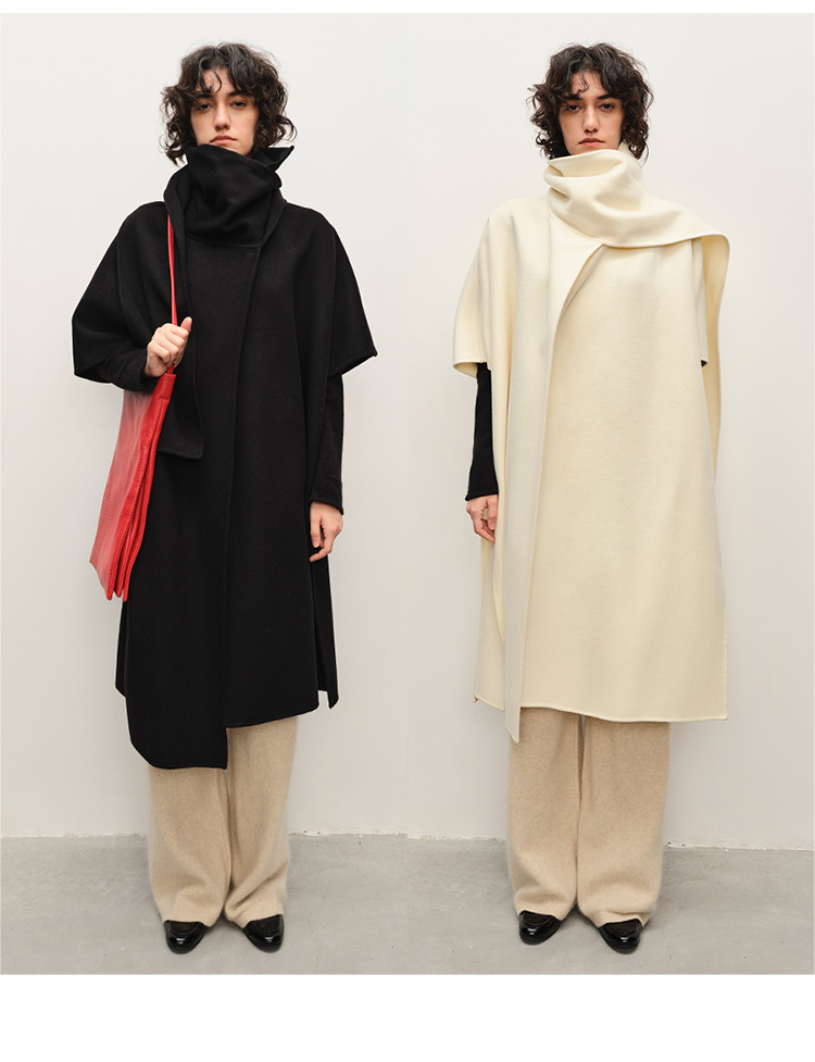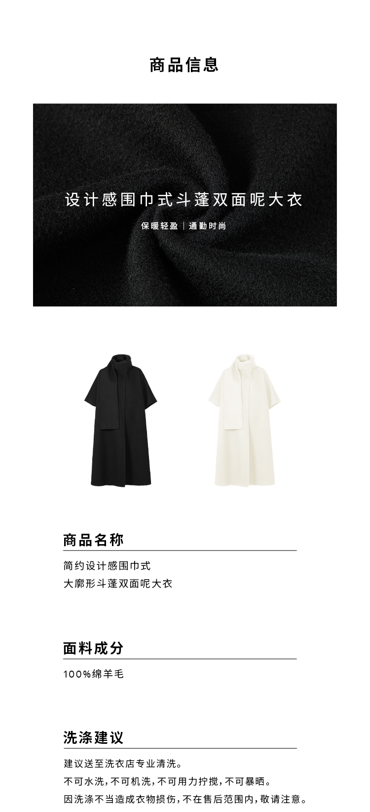 HIDEMI 简约设计感围巾式大廓形斗蓬双面呢大衣 黑色/奶白色