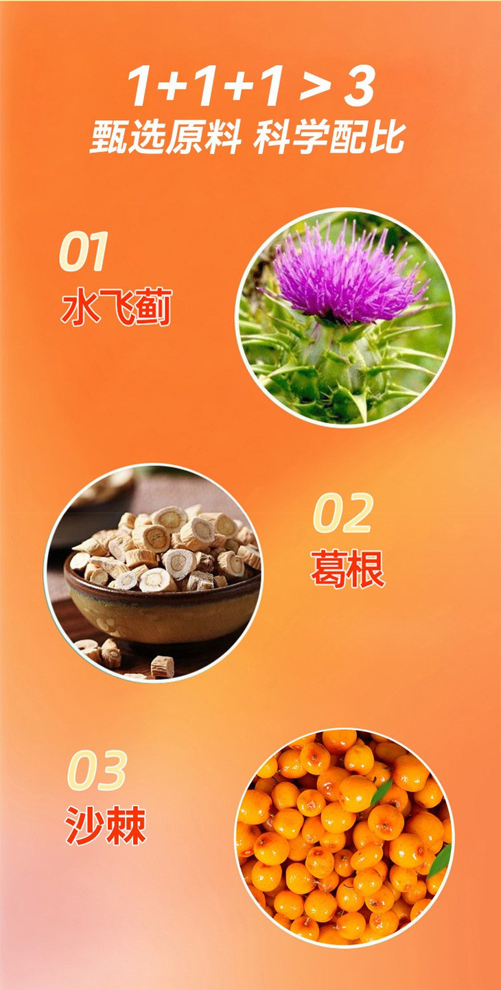不是简单食材堆砌!经过科学配比, 水飞蓟籽油、葛根、沙棘果三者精准搭配, 协同发力,打破单一食材的养护局限, 实现1+1+1>3的养护效果, 护肝、养脾、提亮一步到位, 比单独吃一种食材更高效~
