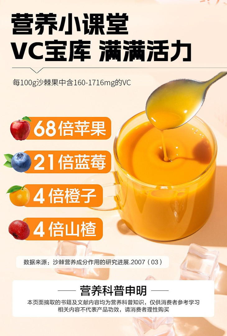 维C宝库实锤,活力直接拉满 沙棘果堪称天然维C宝库! 维C含量碾压多种常见水果, 是苹果的68倍、蓝莓的21倍、橙子的4倍、山楂的4倍, 一口喝下去,补充满满维C, 抗氧化、提活力,改善暗沉, 让你由内而外透着元气感✨