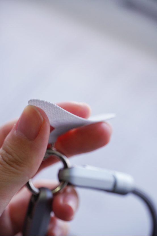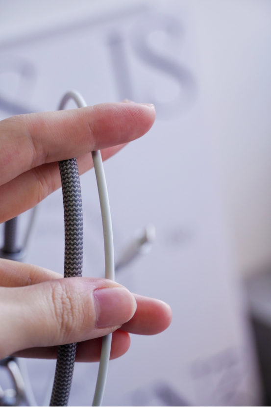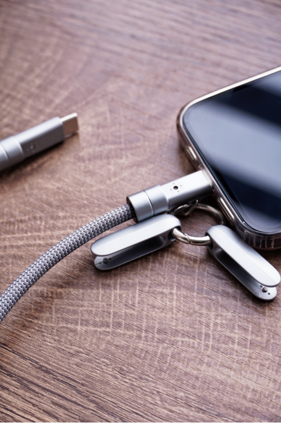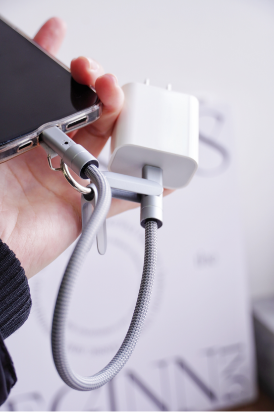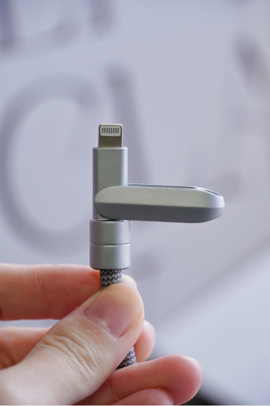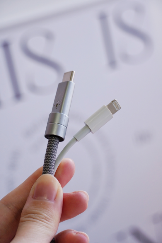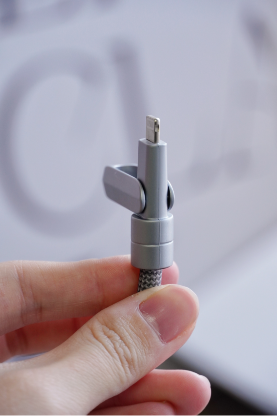 充电口的合金材料不仅加固了与线身之间最容易折损的接口处 还在头上做了一个可以圈在锁环上的活口罩扣 不让端口直接曝露在外面🤲🏻 但需要充电时可以直接拔下或扣下使用 像Lightning端口有一个弊端 它的接口针脚不像Type-C是封闭在内部的 通电时接触人体偶尔可能会出现小电流漏电现象 所以这个罩扣设计不仅担负着线身与环扣之间衔接口的作用 还有多一个保护性的步骤在