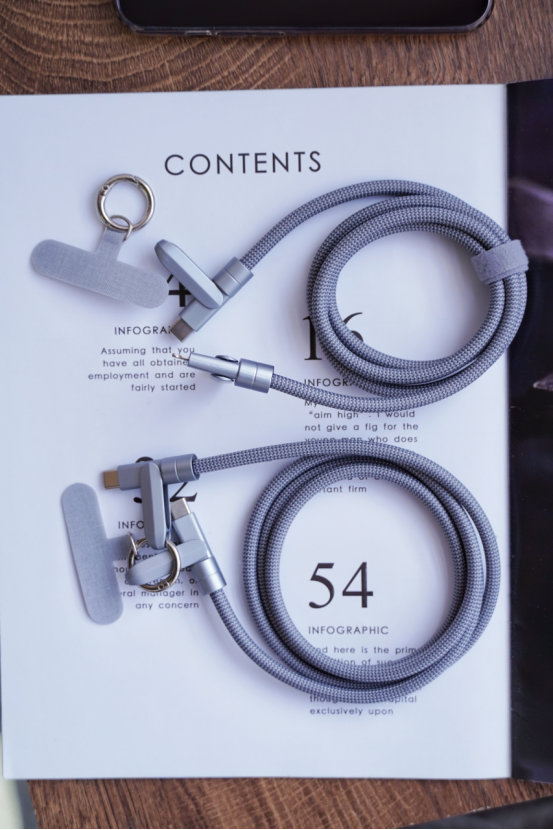 是真的很科技风很耐看的充电数据线做挂绳的一款产品 🔺双端口,三型号、双规格可选 🔺Type-C to Lightning Type-C to Type-C Usb-A to Type-C 🔺1.2m斜挎款 0.3m手提款 ✔ 既是PD 30W/Type-C 120W(max) 适配主流多设备的超级快充线 ✔ 也是480/Mps超高速率传输数据线 ✔ 高密度编织绳体 百倍以上的强韧坚固抗弯折 ✔ 合金端口配置 接口牢固不易折断 ✔ 包含金属环扣、半硬质垫片零件 30000次摇摆测试!非常牢固的手机防丢挂绳💪🏻