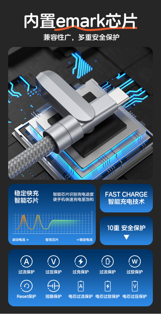 🔺数据线还内置emark保护芯片 可加强充电过程中的十重防护 更能智能识别充电进度 传输可以保护手机电池健康的稳定电流 比我的原装充电线更快就算了 保护度也不遑多让