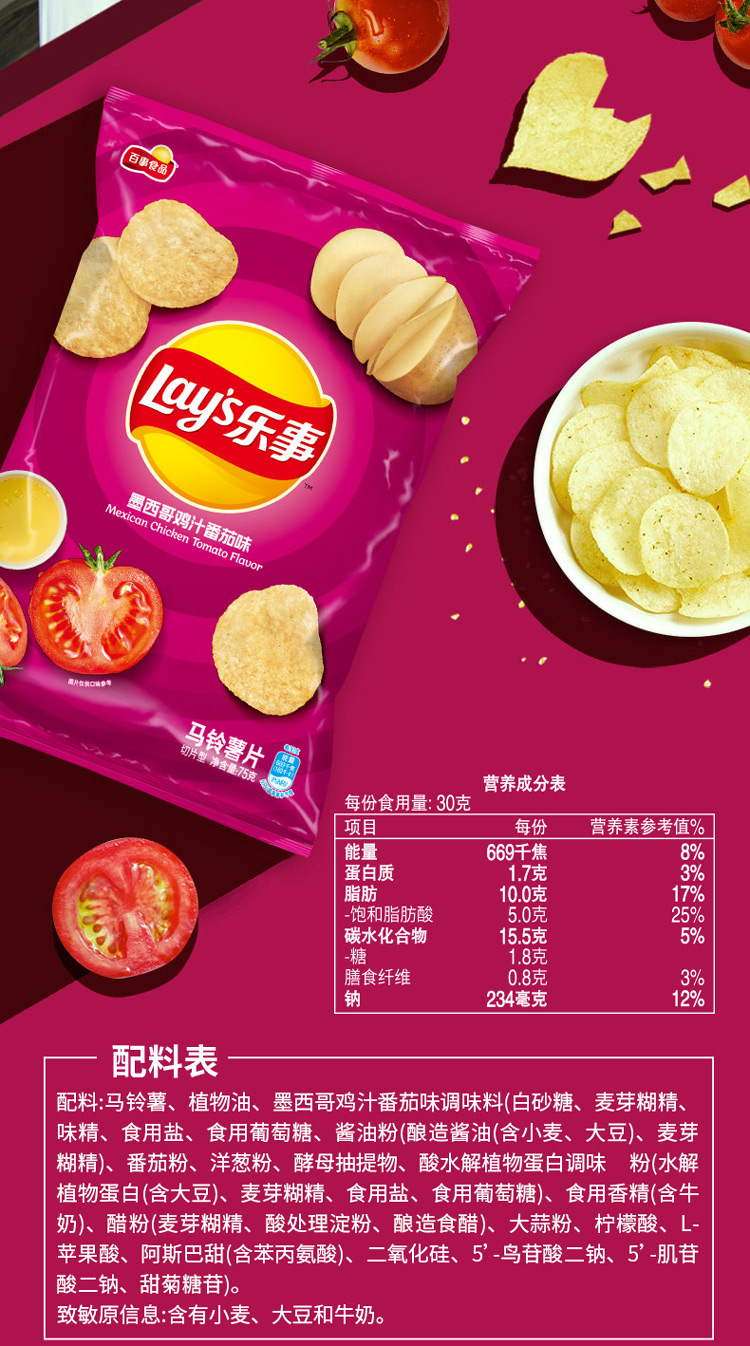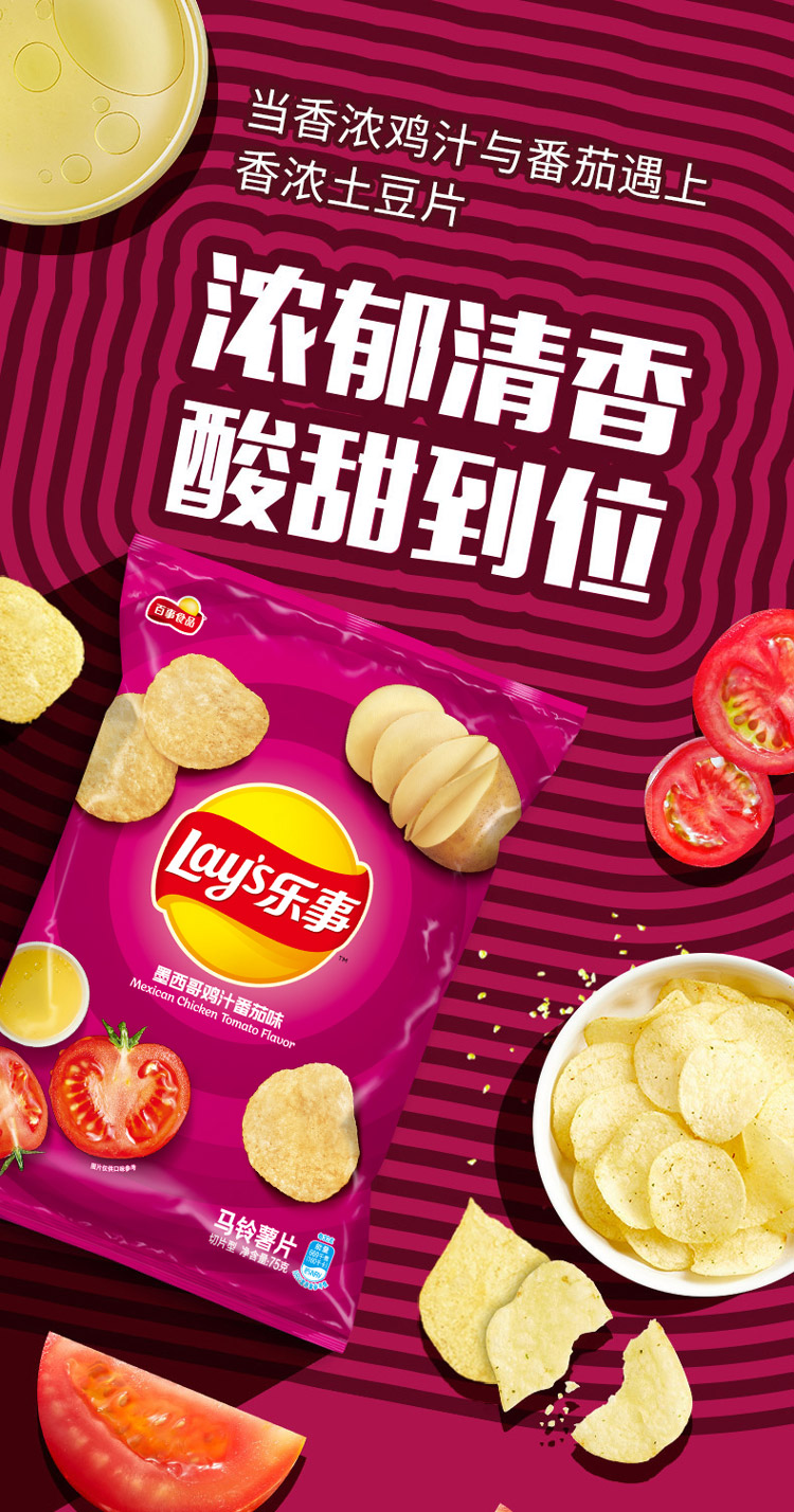 乐事Lay's薯片 休闲零食 膨化食品 墨西哥鸡汁番茄味 75克