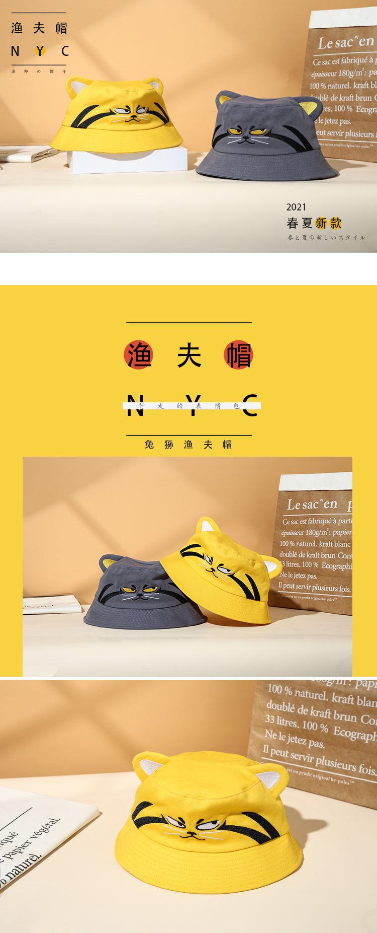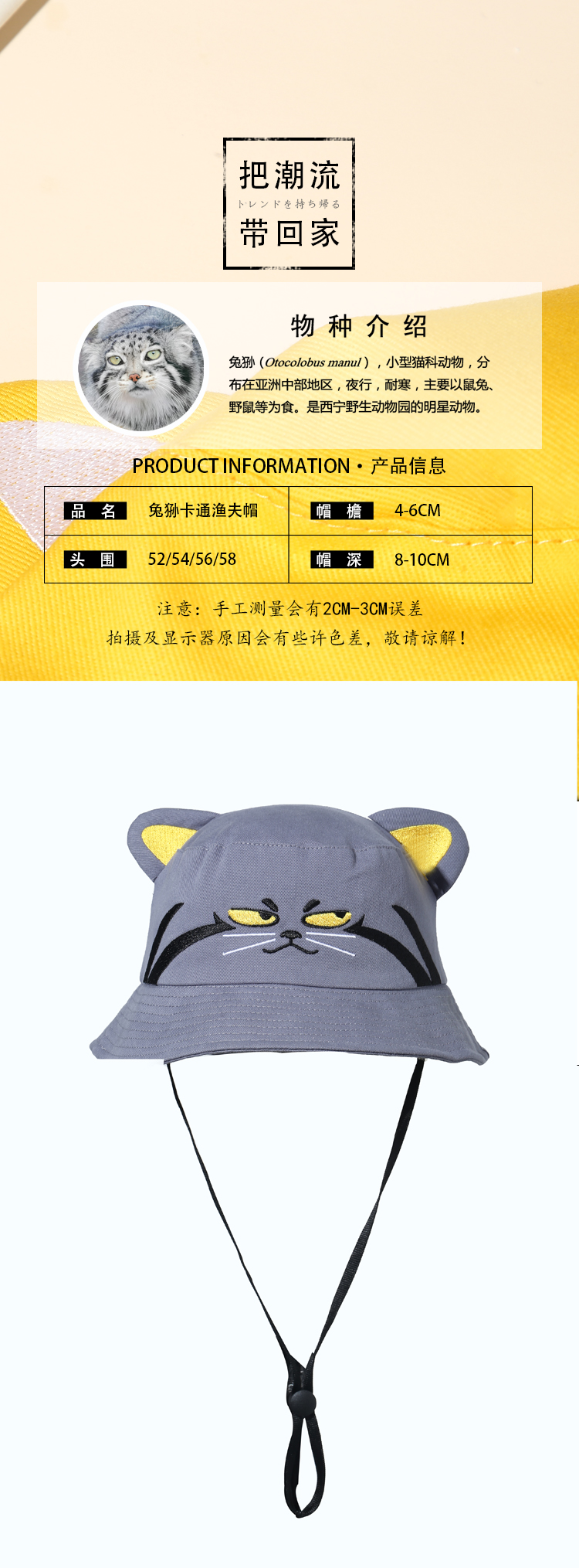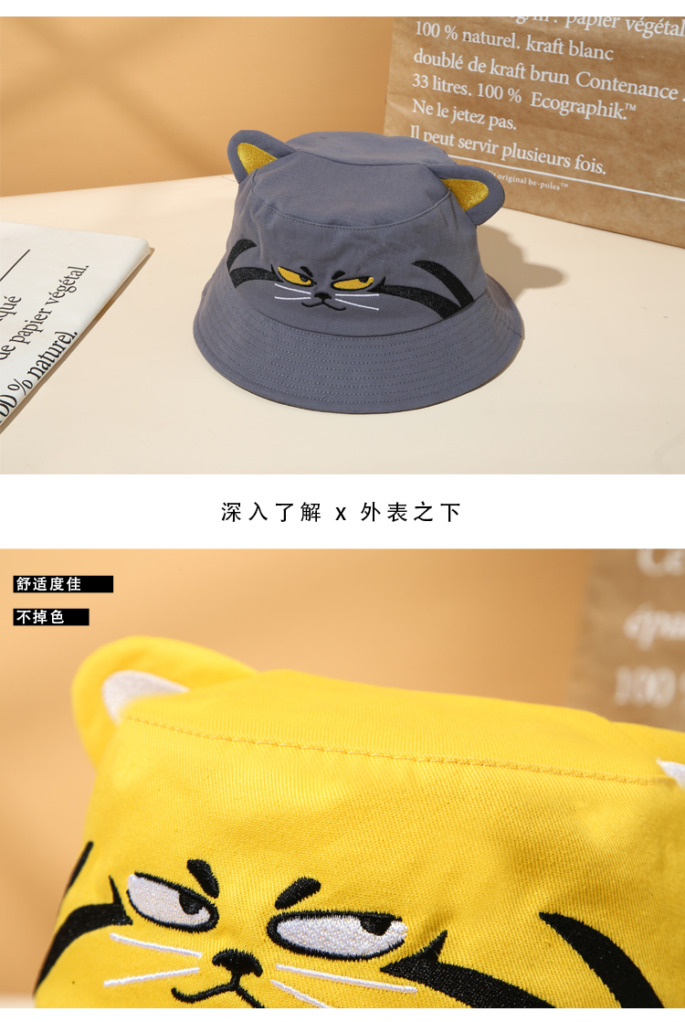 兔狲卡通趣味休闲单面平顶双耳渔夫帽