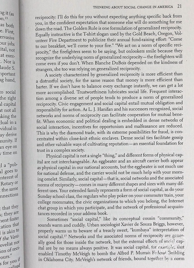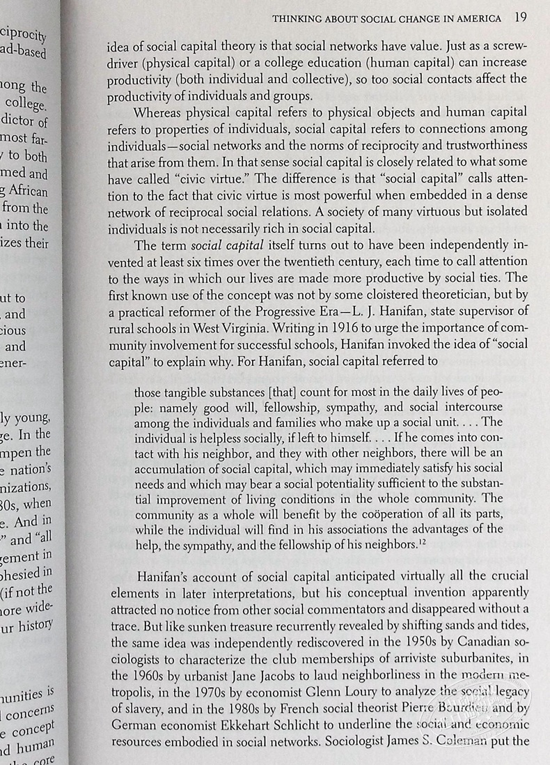 出版的时候,普特南的then-groundbreaking工作表明社会债券是有力的预测生活满意度,以及社会资本的丧失是觉得在关键方面,作为一个强有力的预测犯罪率和其他措施的社区的生活质量,并在其他方面影响我们的健康。几十年来,我们联系或断开联系的方式发生了变化,但他的核心论点仍然像以往一样强大和紧迫:修补我们受损的社会资本,是维护我们社会结构的关键。
