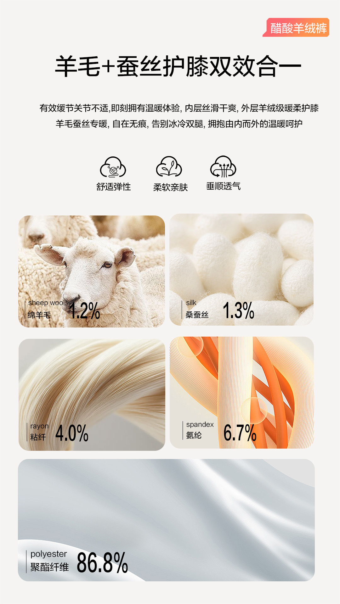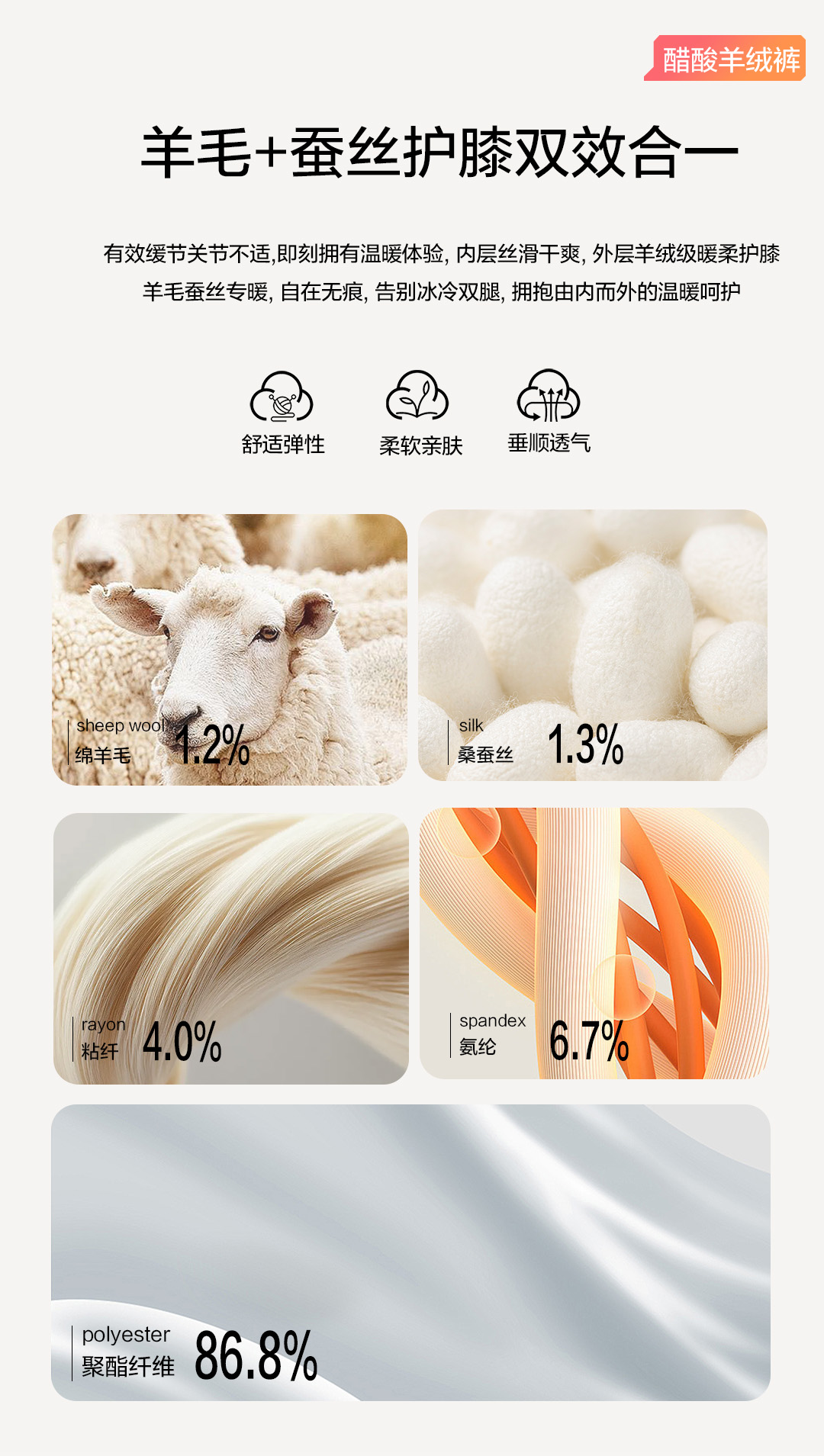 护膝贴片:聚酯纤维86.8%、氨纶6.7%、粘纤 4.0%、绵羊毛1.2%、桑蚕丝 1.3%