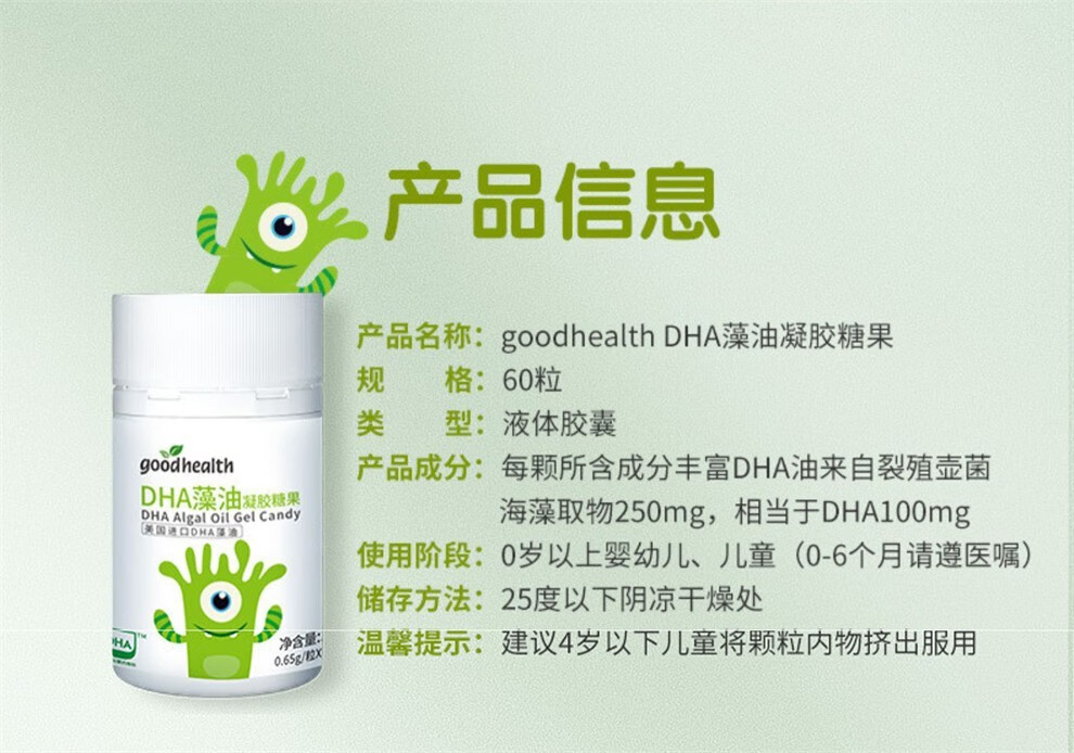 好健康goodhealth DHA藻油软胶囊 婴幼儿儿童学生成人孕妇可配合改善提高记忆力补脑食品使用 60粒/瓶-HJK-060061