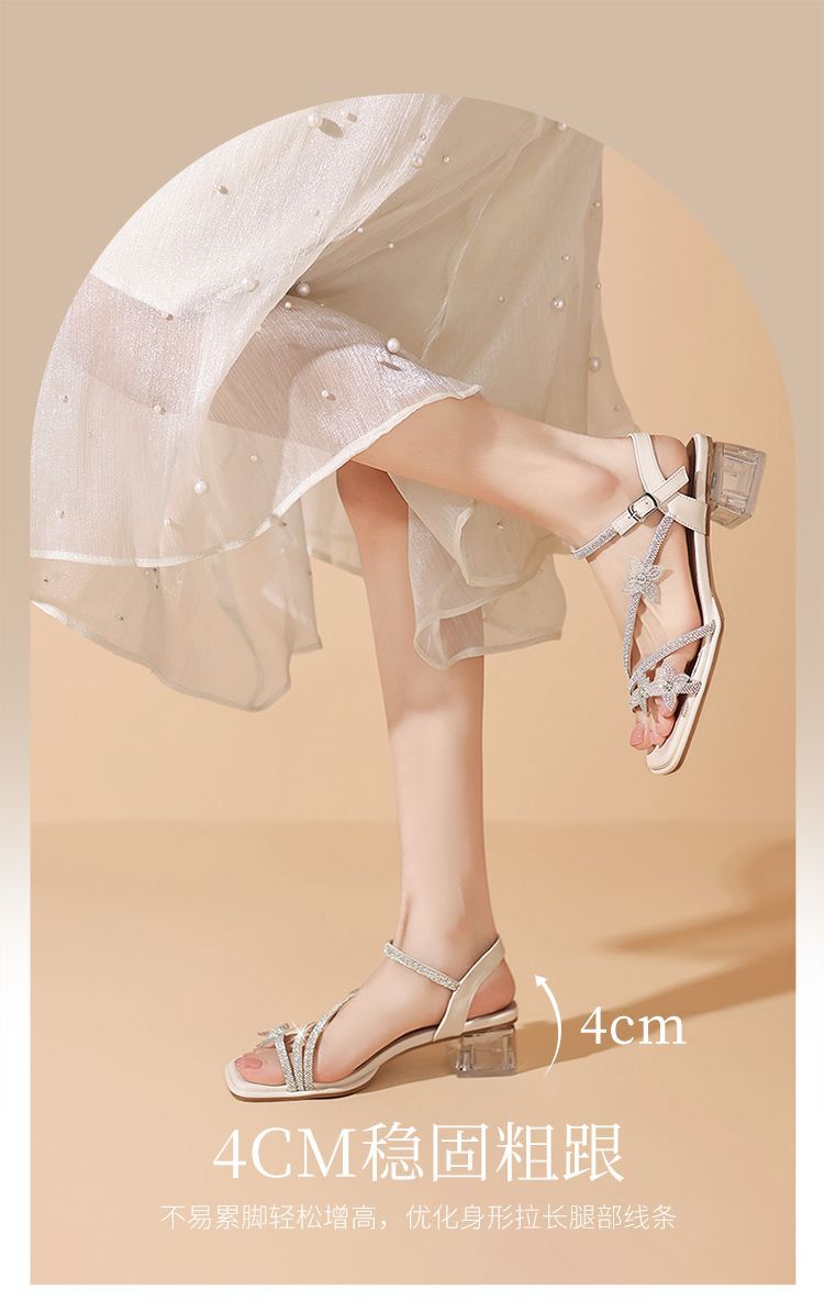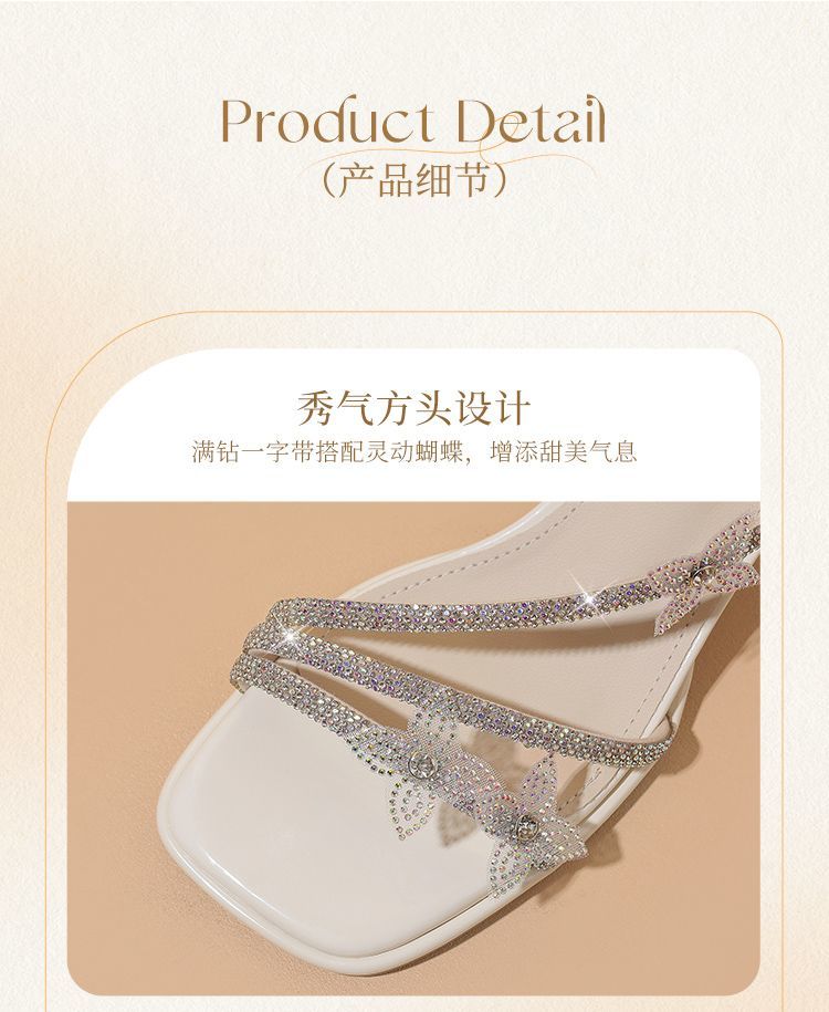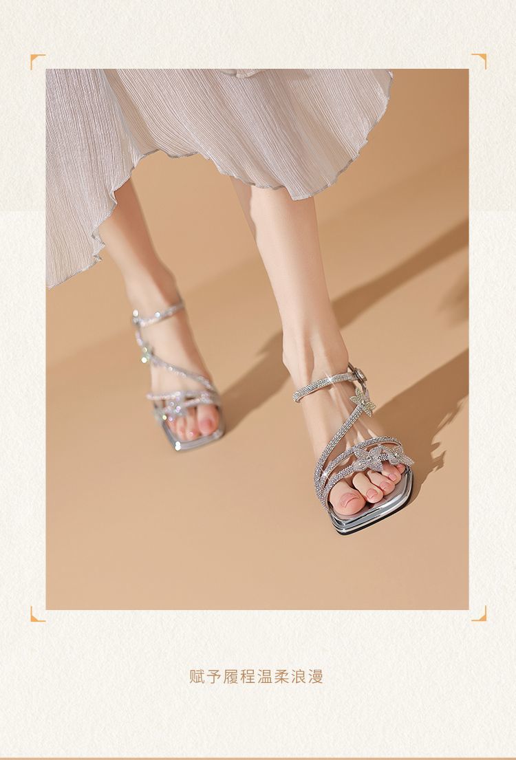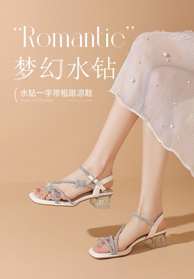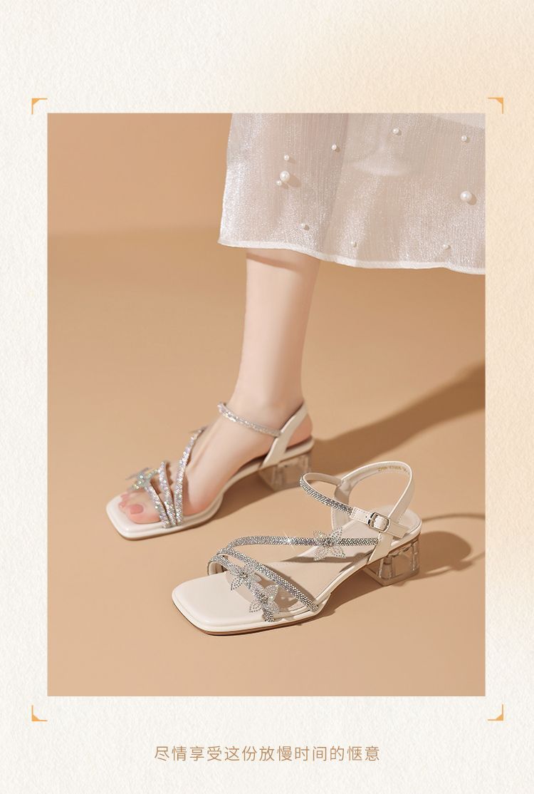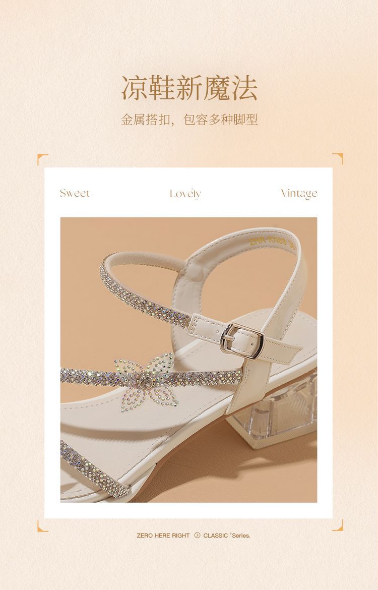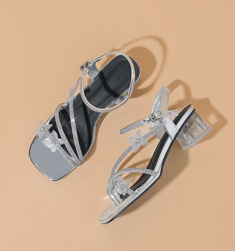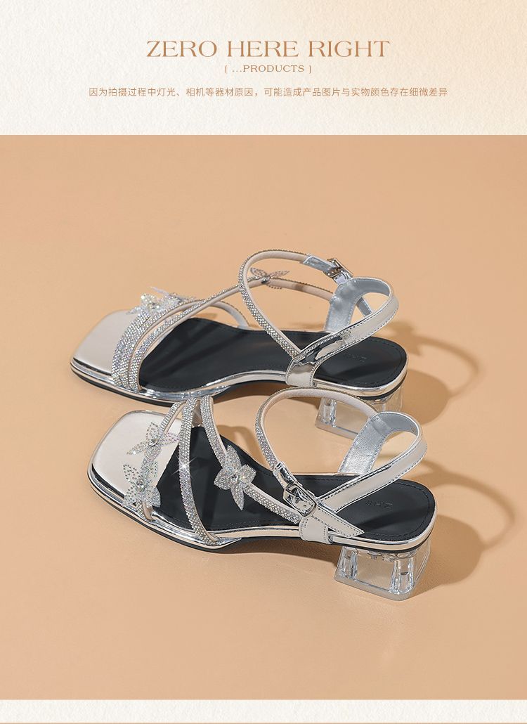 ZHR水钻蝴蝶结凉鞋银色粗跟凉鞋2025夏新款一字带高跟鞋中跟女鞋